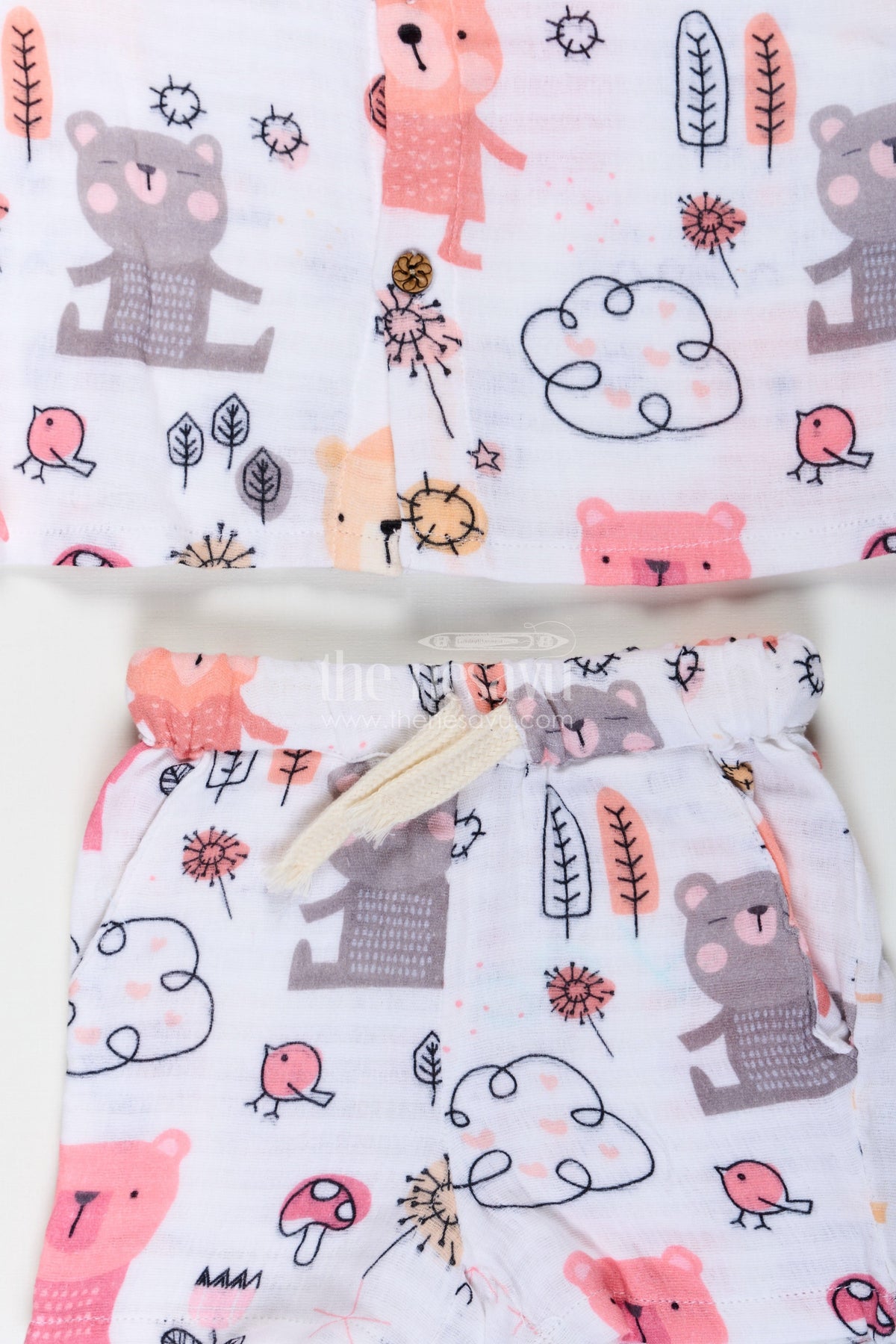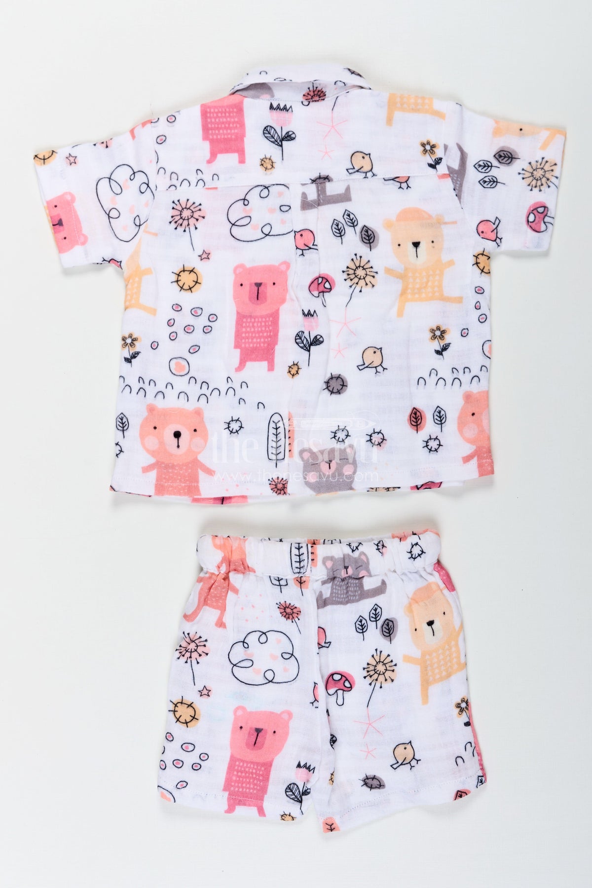 White short sleeve casual shirt never looked this fun! This boys muslin set features an all-over print of quirky bears, birds, and nature-inspired doodles in pastel tones, all on a breathable white background. The shirt is finished with a classic collar and wooden-style buttons for a smart look, while the matching shorts offer a secure yet comfy fit with an elastic waistband and drawstring. Perfect for warm days, this outfit keeps your little one cool, stylish, and ready for all kinds of playful adventures. The soft muslin fabric is gentle on skin, making it an excellent choice for daily wear and fun outings.