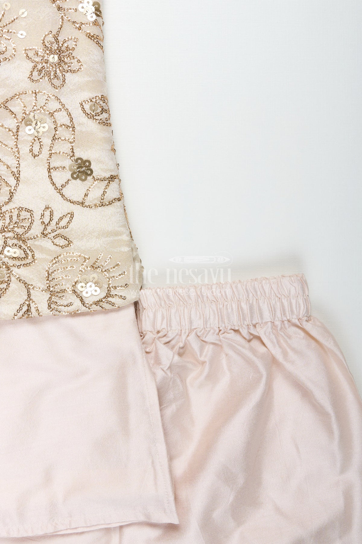 This sherwani jacket is a refined ethnic outfit designed for boys who love a polished and elegant look. Crafted from a smooth viscose blend, the outfit includes a full-sleeve beige kurta and pants topped with a sleeveless sherwani-style jacket. The jacket features intricate floral embroidery adorned with shimmering sequins, making it perfect for special occasions like weddings and festivals. The soft neutral tone ensures versatility, while the elastic waistband offers all-day comfort. With its sleek silhouette and dazzling embellishments, this sherwani jacket set adds just the right amount of glamour to your child's festive wardrobe.