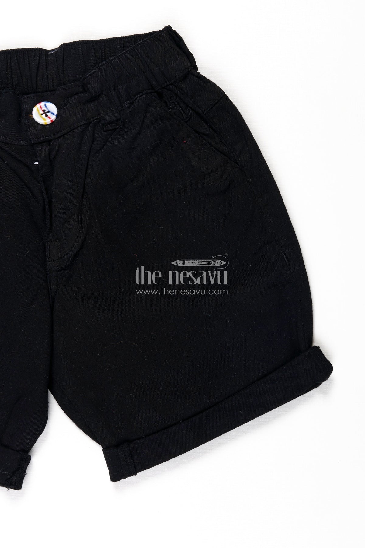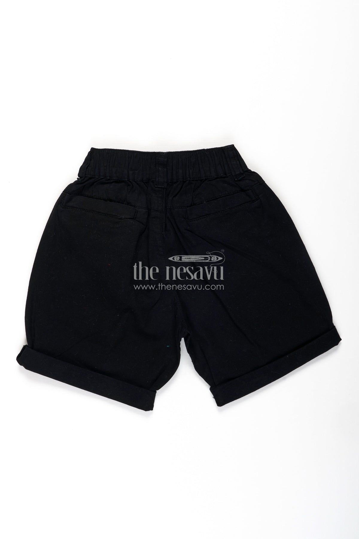 Childrens black shorts by Nesavu are classic, easy-to-style bottoms made from high-quality cotton for breathability and comfort. These all-black shorts feature subtle turned-up hems and a stretchable waistband with a belt loop for added adjustability. Whether for school, casual hangouts, or relaxed evenings, these shorts offer versatile wear. Designed to keep up with active kids, they combine comfort, simplicity, and subtle detailing that never goes out of style.