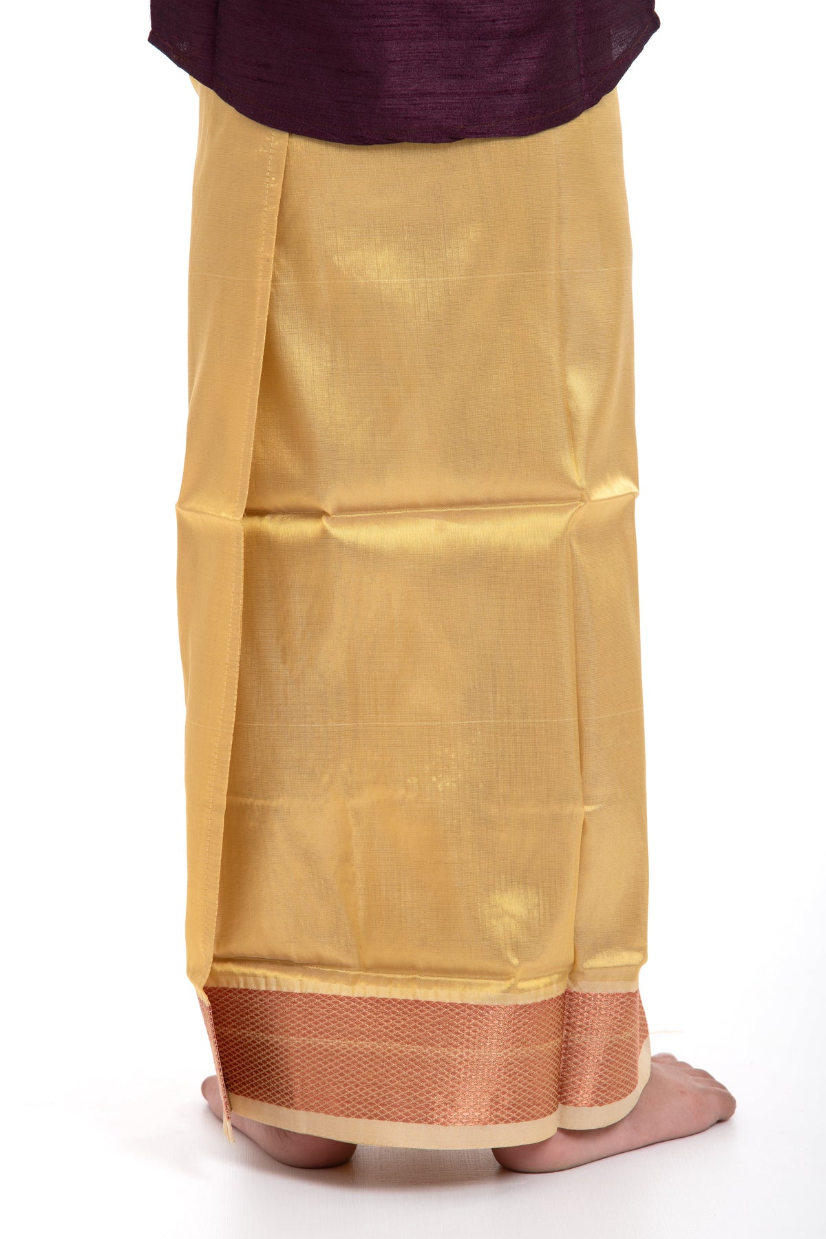 Introducing the "Classic Golden Yellow Boys Dhoti," an essential addition to any young boy's traditional wardrobe. This beautifully crafted dhoti boasts a timeless Greenish Gold color, enhanced by a rustic maroon trim that adds a touch of elegance. The dhoti is made from a premium silk blend material, offering both durability and comfort. Its intricate geometric patterns near the border create a stylish yet traditional look, making it perfect for cultural events, weddings, and festive occasions.