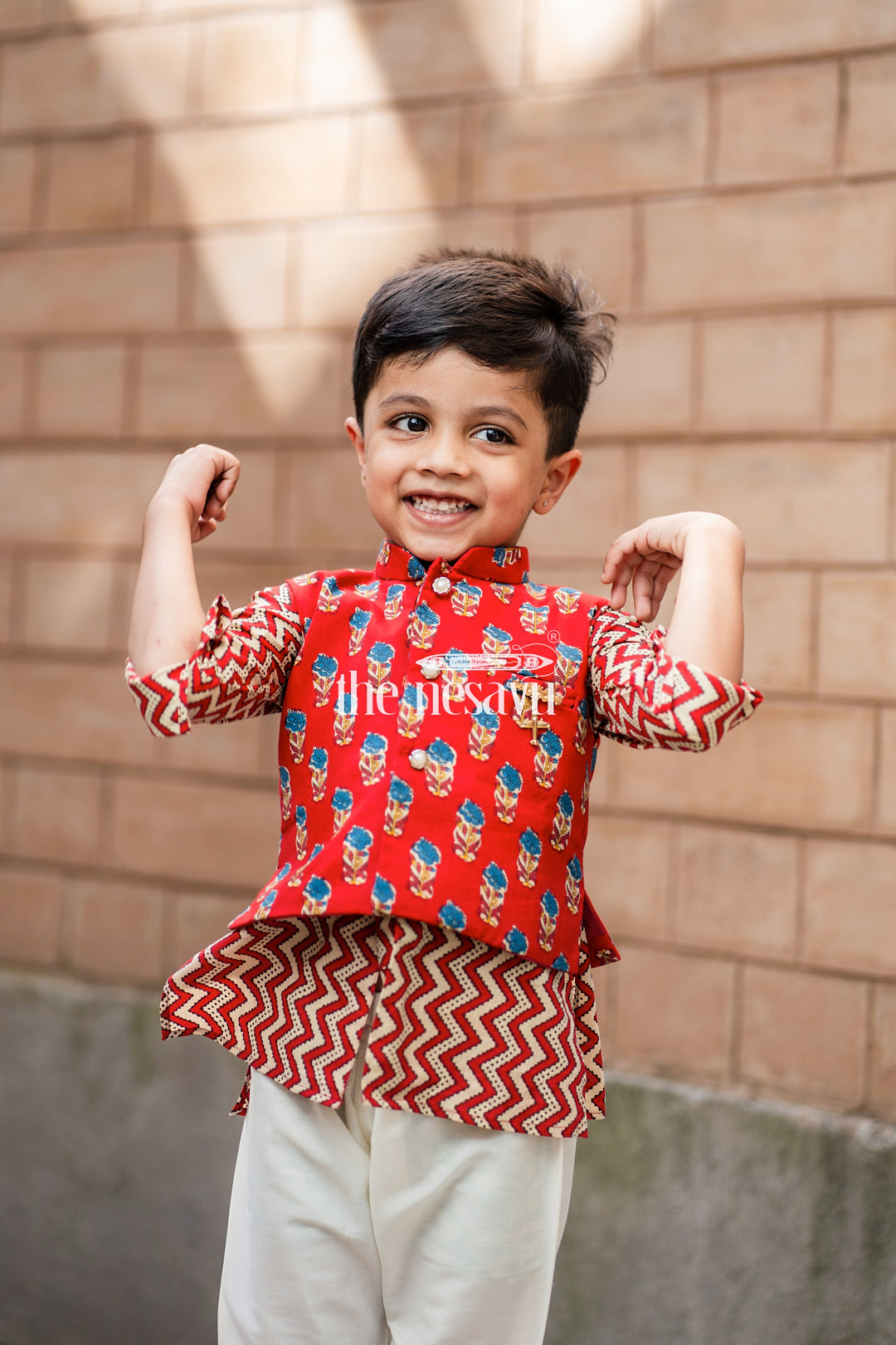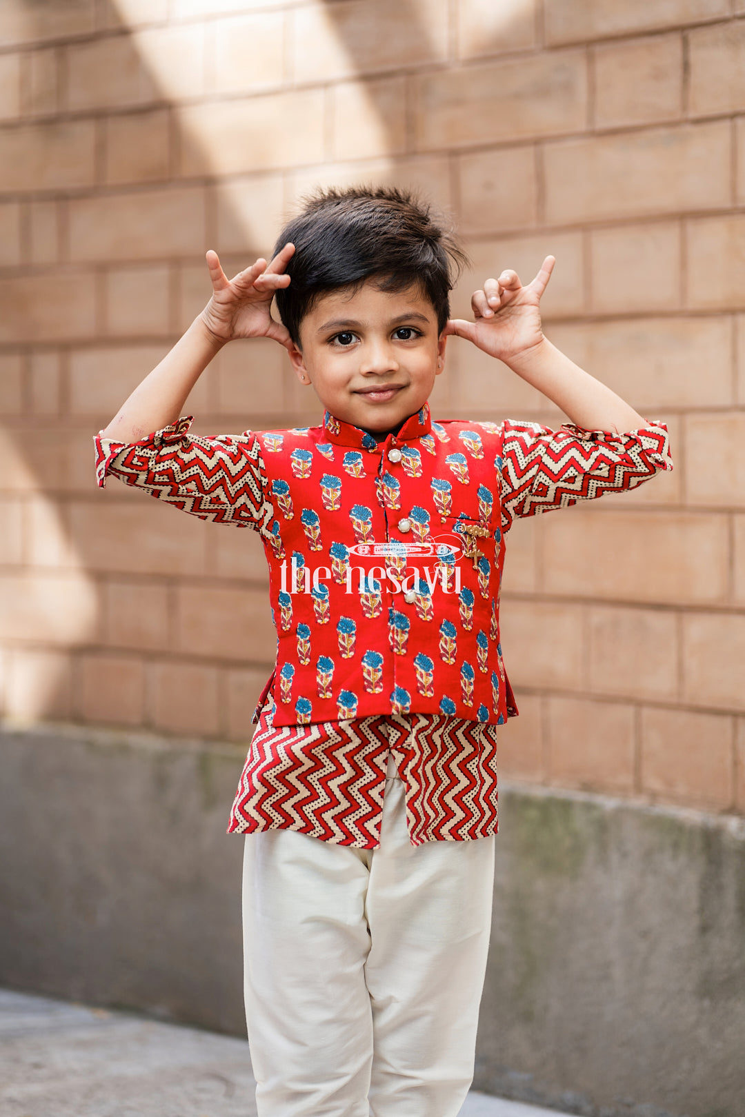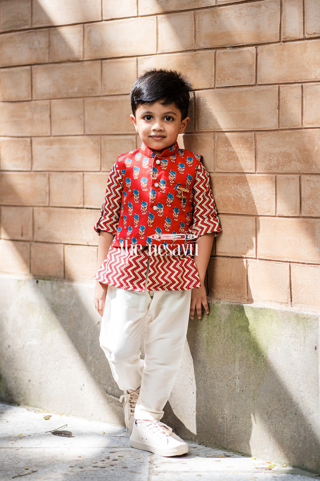 Dress your boys in our fashionable Nesavu Red Zig Zag Printed Kurta Set with Overjacket. This stylish outfit features a Red kurta with a trendy zig zag print design, paired with an overjacket for a fashionable and charming look. The kurta is designed with attention to detail, showcasing a vibrant Red color and an eye-catching zig zag pattern. Made with high-quality fabric, this set ensures a comfortable and breathable feel against your child's skin. The overjacket adds an extra layer of style, completing the ensemble. Perfect for casual events, parties, and festive occasions, this fashionable Red zig zag printed kurta set with overjacket will make your boys look effortlessly stylish.