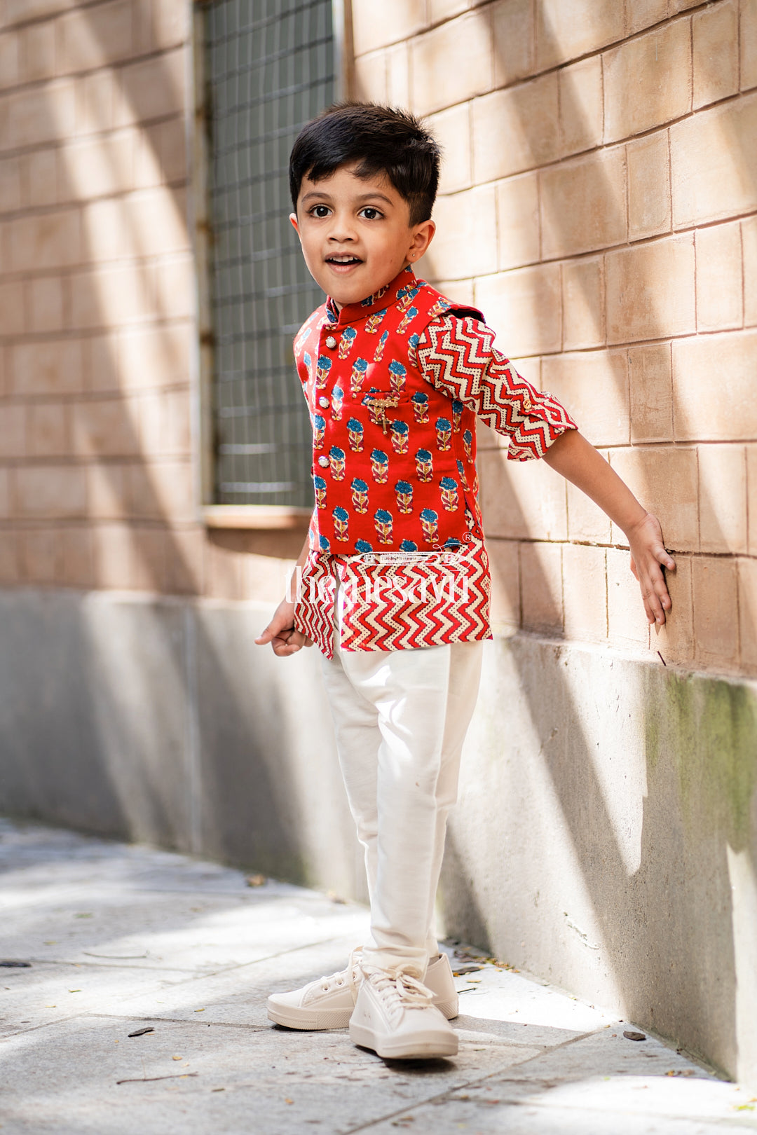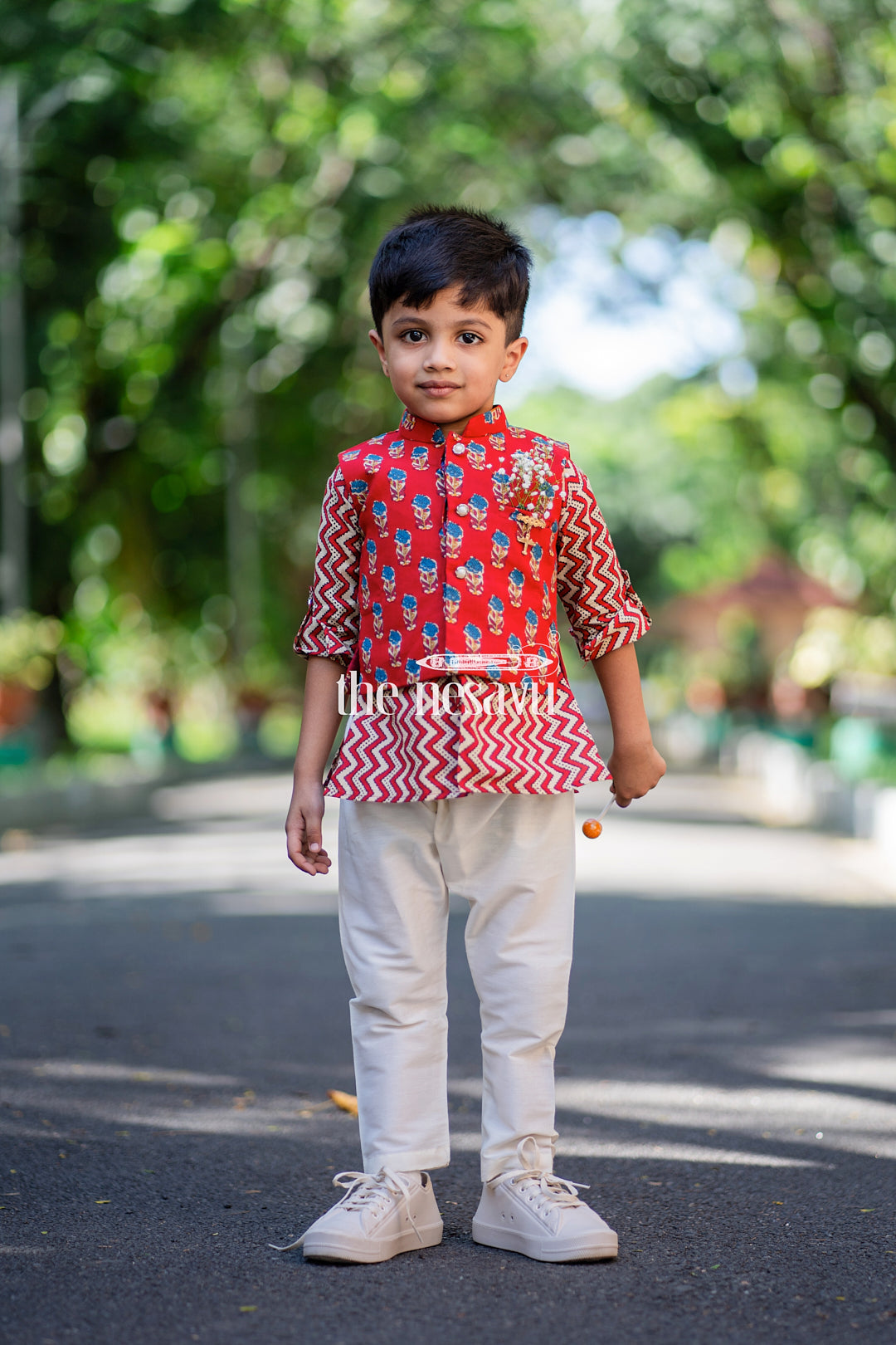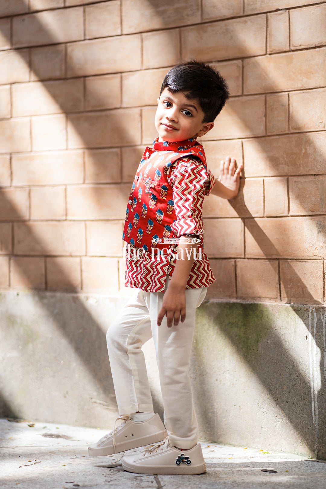 Dress your boys in our fashionable Nesavu Red Zig Zag Printed Kurta Set with Overjacket. This stylish outfit features a Red kurta with a trendy zig zag print design, paired with an overjacket for a fashionable and charming look. The kurta is designed with attention to detail, showcasing a vibrant Red color and an eye-catching zig zag pattern. Made with high-quality fabric, this set ensures a comfortable and breathable feel against your child's skin. The overjacket adds an extra layer of style, completing the ensemble. Perfect for casual events, parties, and festive occasions, this fashionable Red zig zag printed kurta set with overjacket will make your boys look effortlessly stylish.