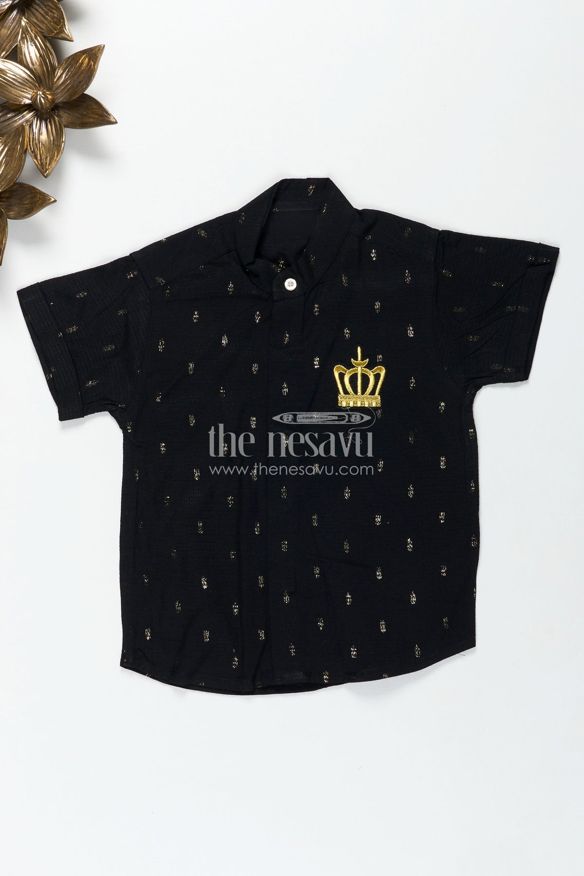 Kids Black Cotton Shirt with Crown Patch Embellishment in Semi Silk Blend for Stylish Young Boys