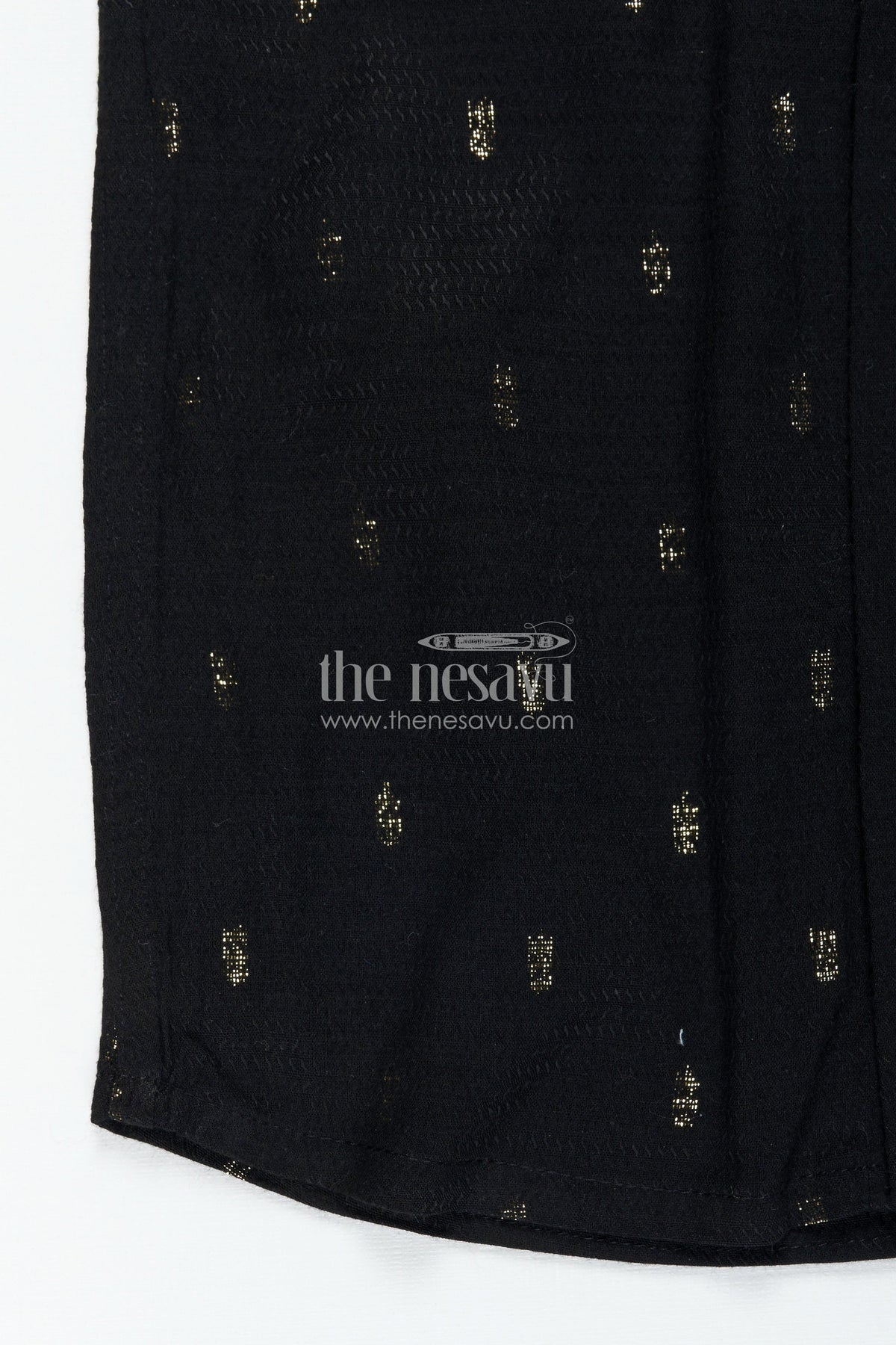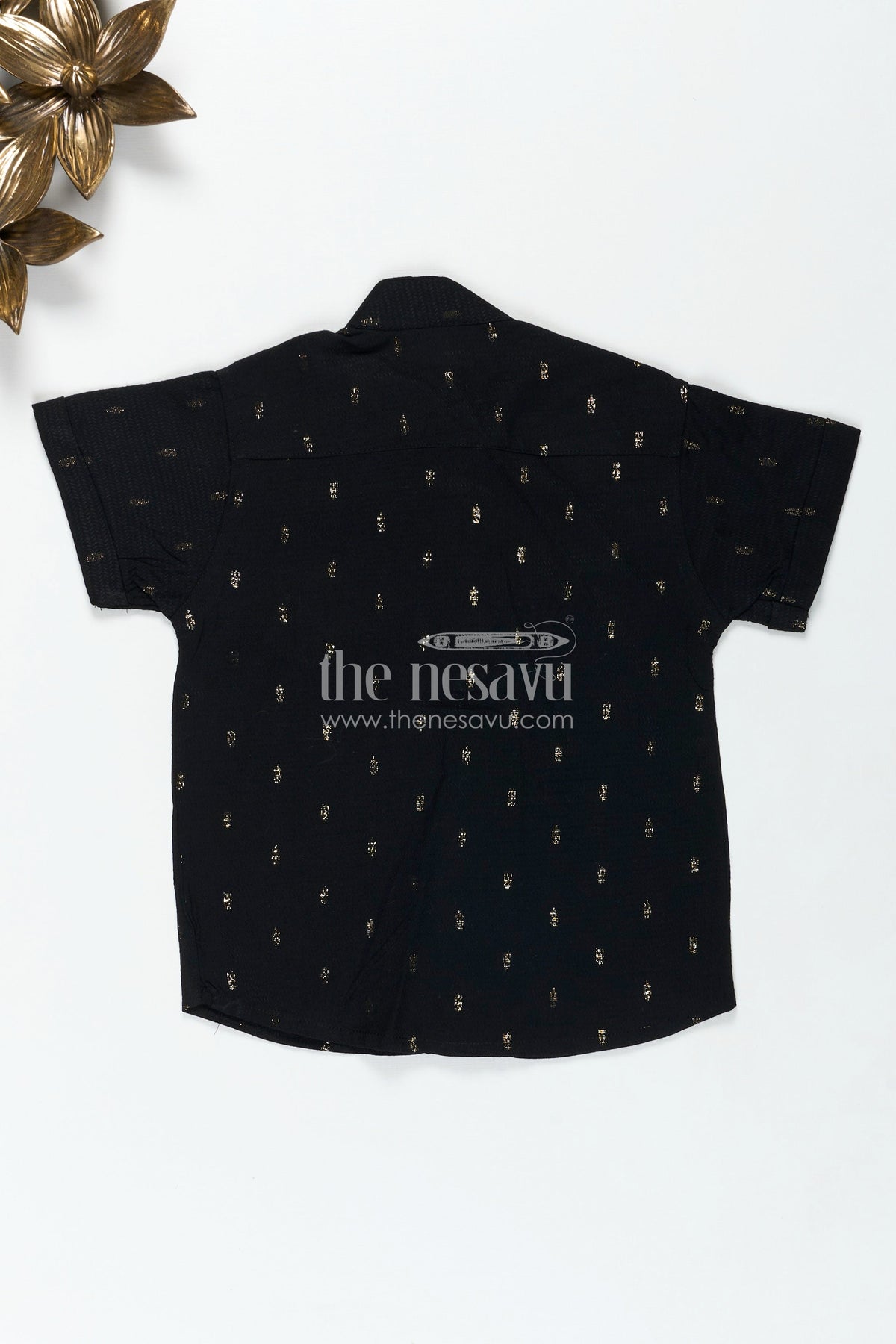 Kids Black Cotton Shirt brings together elegance and fun with its standout crown patch embellishment. Made from a premium semi silk blend, this shirt feels soft to the touch while maintaining a sophisticated sheen. The black base is subtly dotted with small woven motifs, and the bright yellow crown emblem adds a bold statement that kids will love. A mandarin collar and structured short sleeves offer a neat finish, making it suitable for festive days or semi-formal events. Comfortable yet unique, this shirt is perfect for boys who enjoy wearing something cool and regal without compromising on comfort.