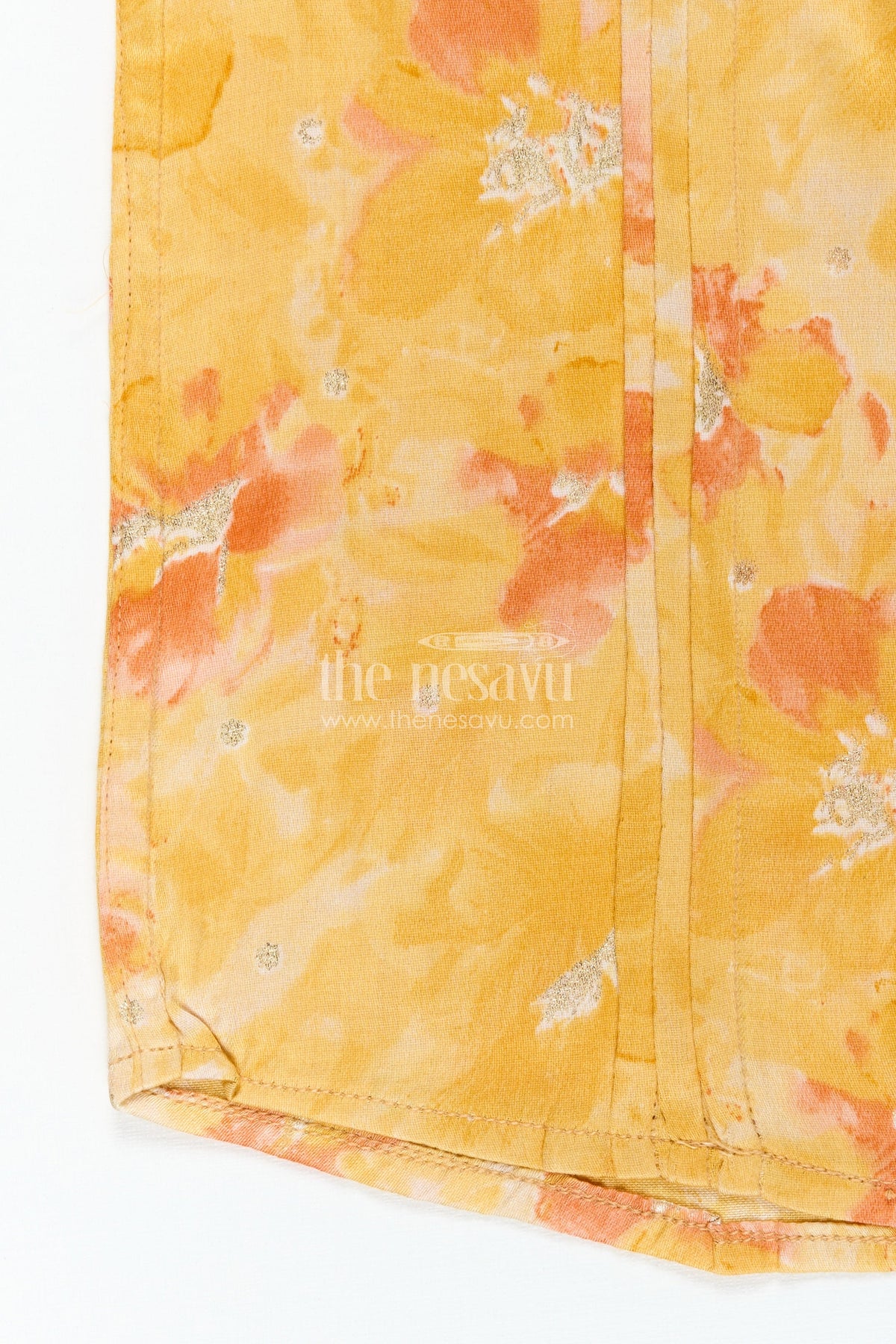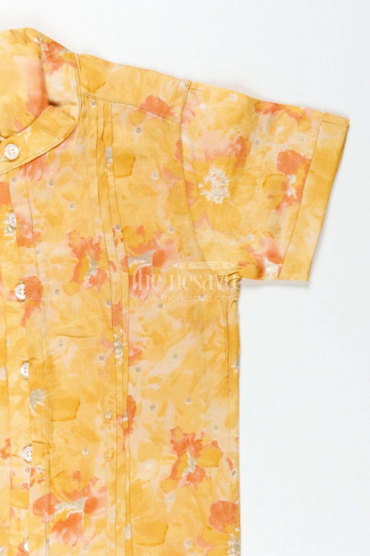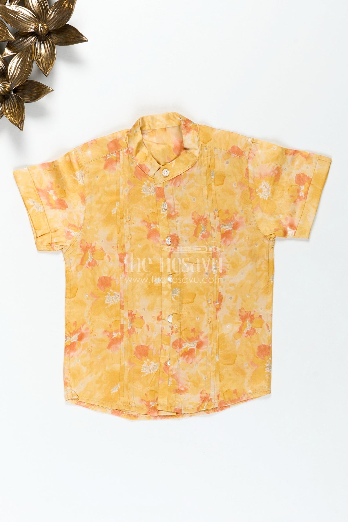 Printed Cotton Shirt for Kids in Yellow Moadal Silk with Artistic Digital Floral Pattern and Mandarin Collar
