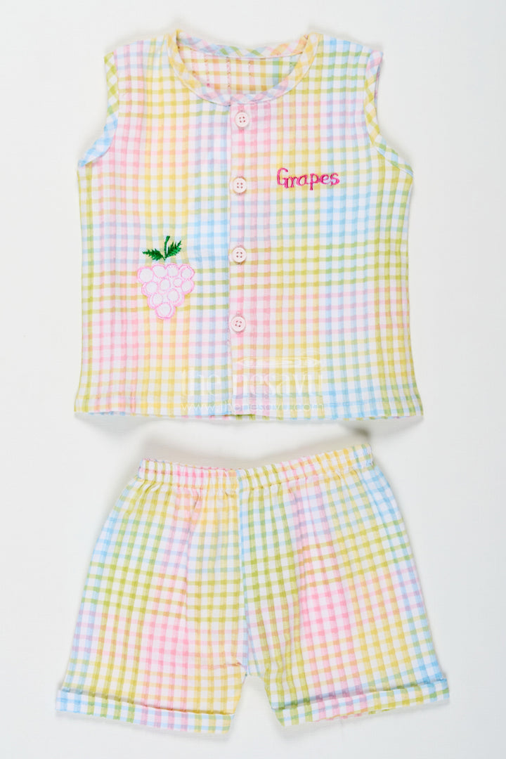 The two piece dress set is a playful and practical outfit for baby girls who love comfort with a splash of color. Made from breathable cotton checks, this sleeveless top and shorts combo features a cheerful blend of pastel hues in a soft check pattern. The top has front buttons for easy dressing and is adorned with an embroidered grape motif and the word “Grapes” for an extra dose of cuteness. The matching shorts offer a relaxed fit, ideal for crawlers and early walkers. Whether worn indoors or out, this set ensures freedom of movement while keeping your baby cool and stylish during the warmer.