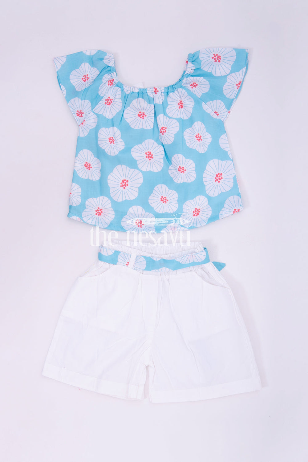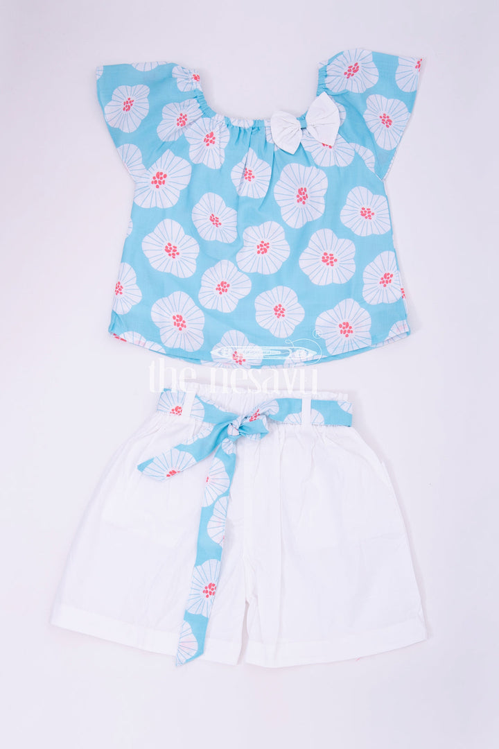 Blue Floral Top and White Shorts Set for Girls