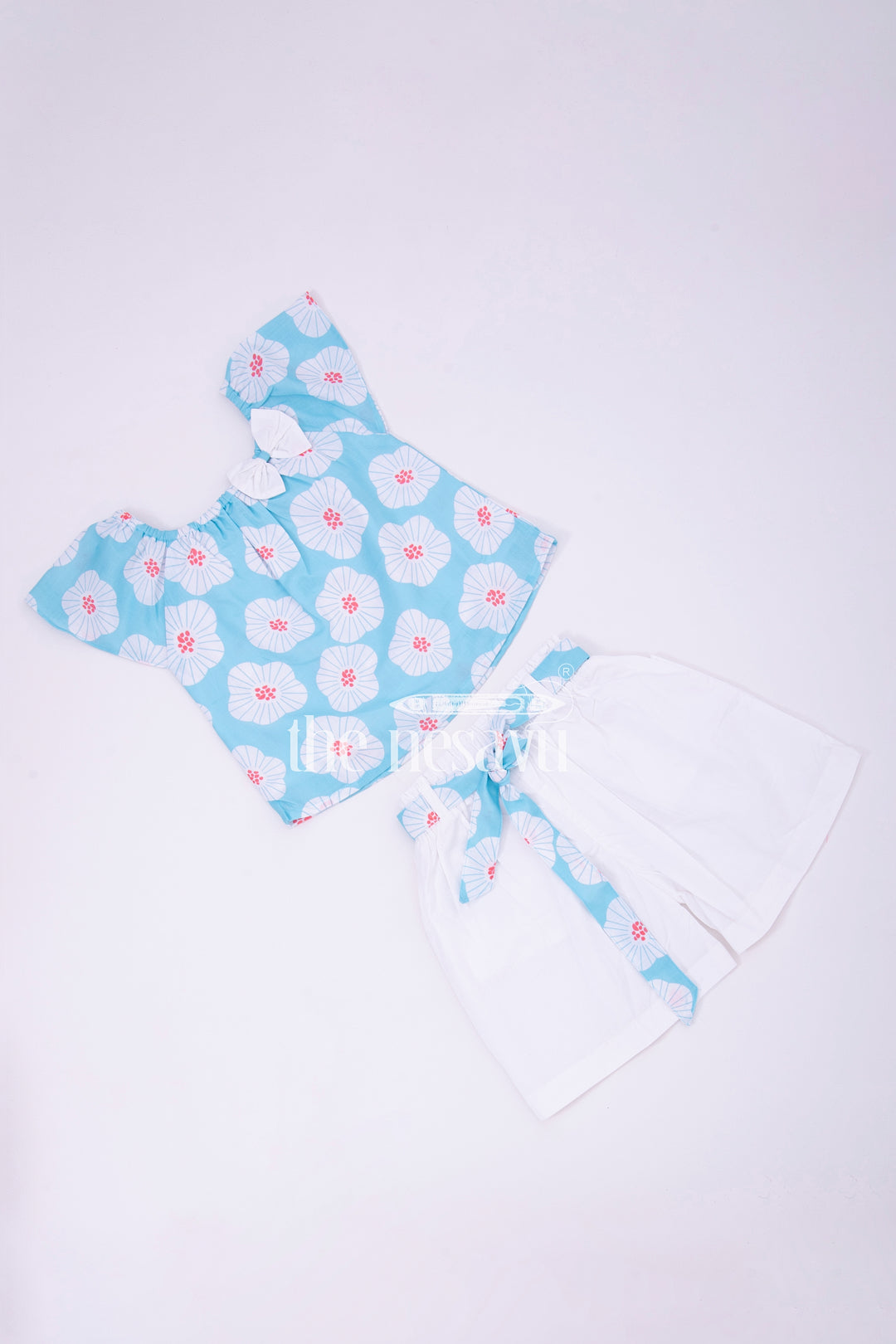This stylish two-piece set for girls includes a blue floral top with a matching bow and pure white shorts. The top features a drop shoulder design for a relaxed fit, making it perfect for both casual and special occasions. The shorts have an elastic waistband for easy wear, and the set is crafted from soft cotton, ensuring comfort throughout the day. Ideal for beach outings, playdates, and summer parties.