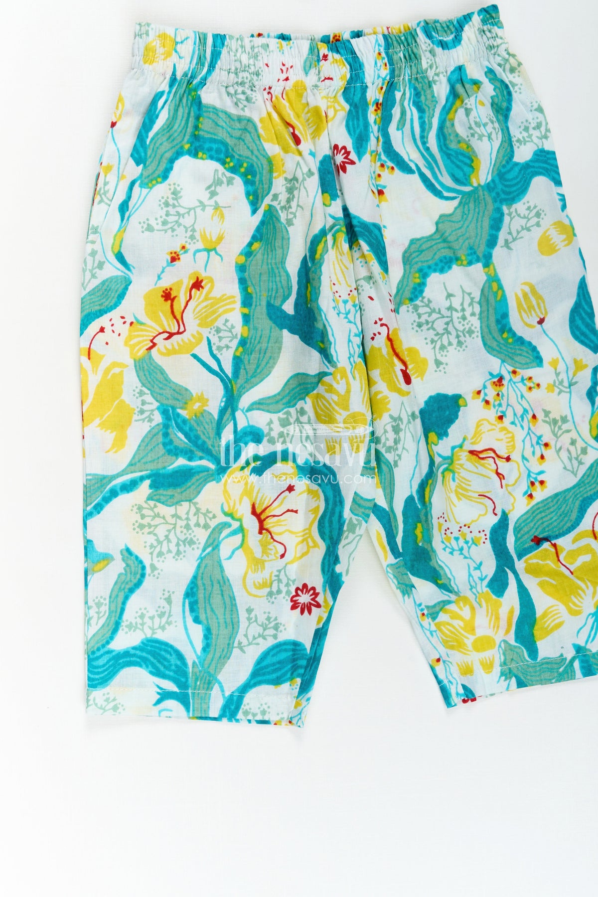 Dress girls in soft elegance with this charming cotton casual set featuring a sleeveless flared top and comfy elastic pants. The light cream base is brought to life with a fresh floral digital print in green and yellow hues, inspired by nature’s breezy palette. The top features a lace-trimmed hem that adds a playful twist, while the relaxed-fit pants make it ideal for all-day movement and comfort. Crafted from breathable cotton, this set ensures your child stays cool and stylish during warm days. Whether it’s a day at the park or a cozy family gathering, this outfit pairs practicality with a flair for fun perfect for dressing up little girls with effortless charm.