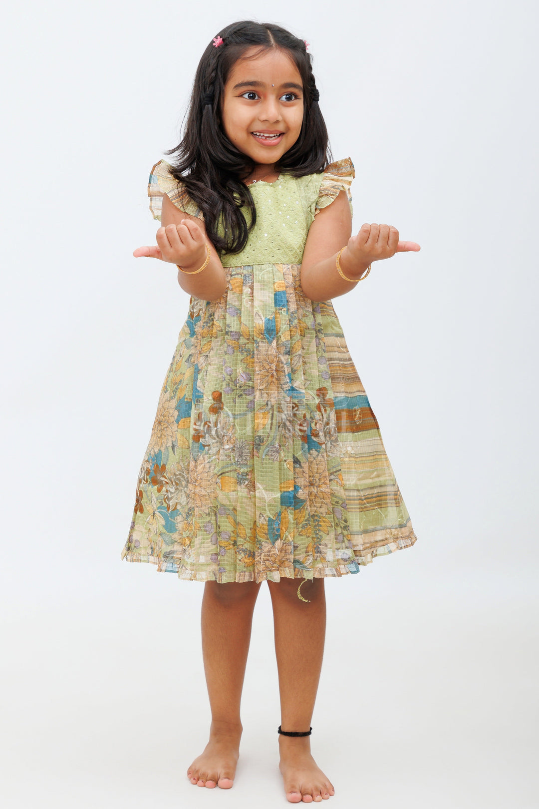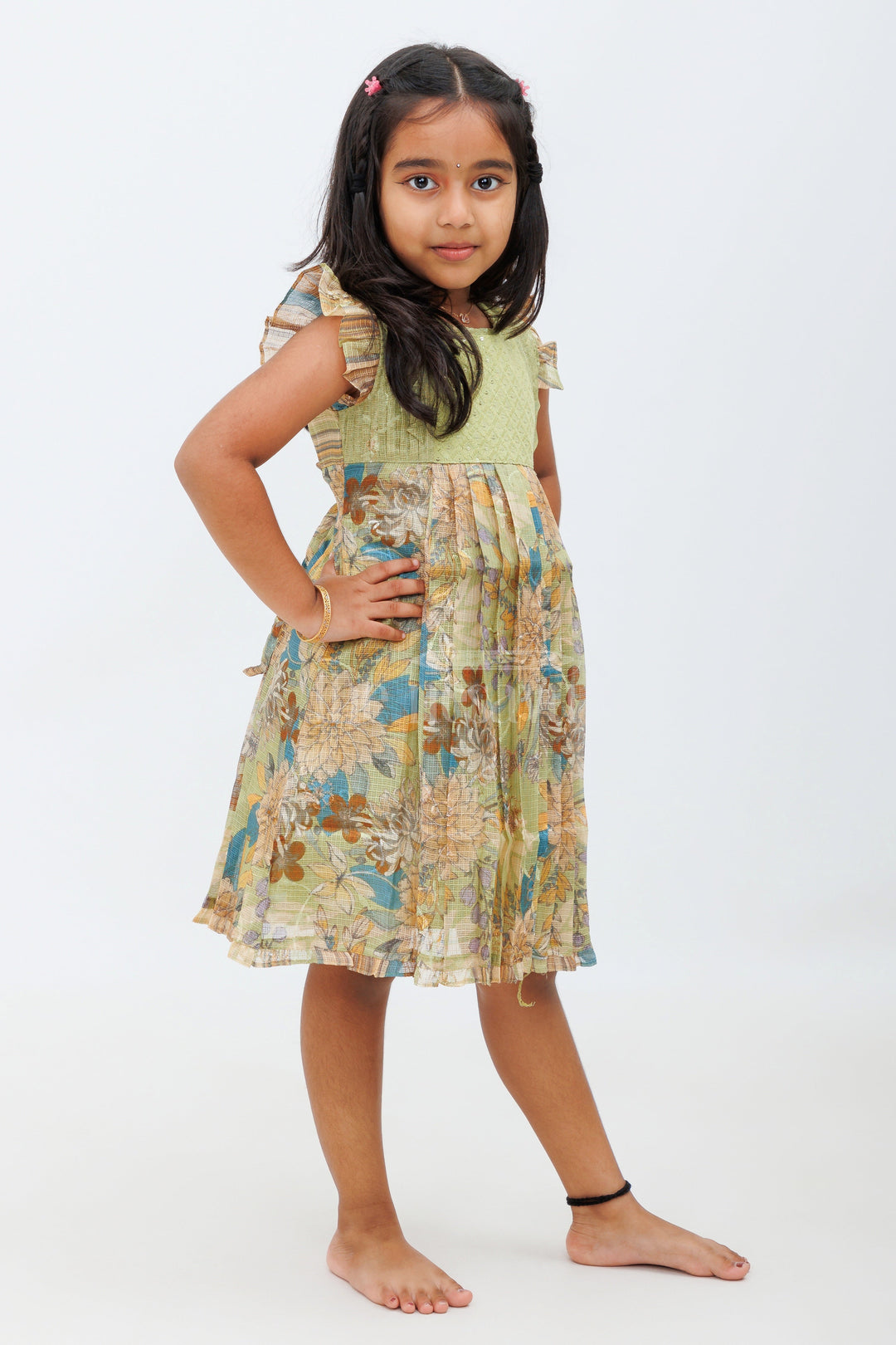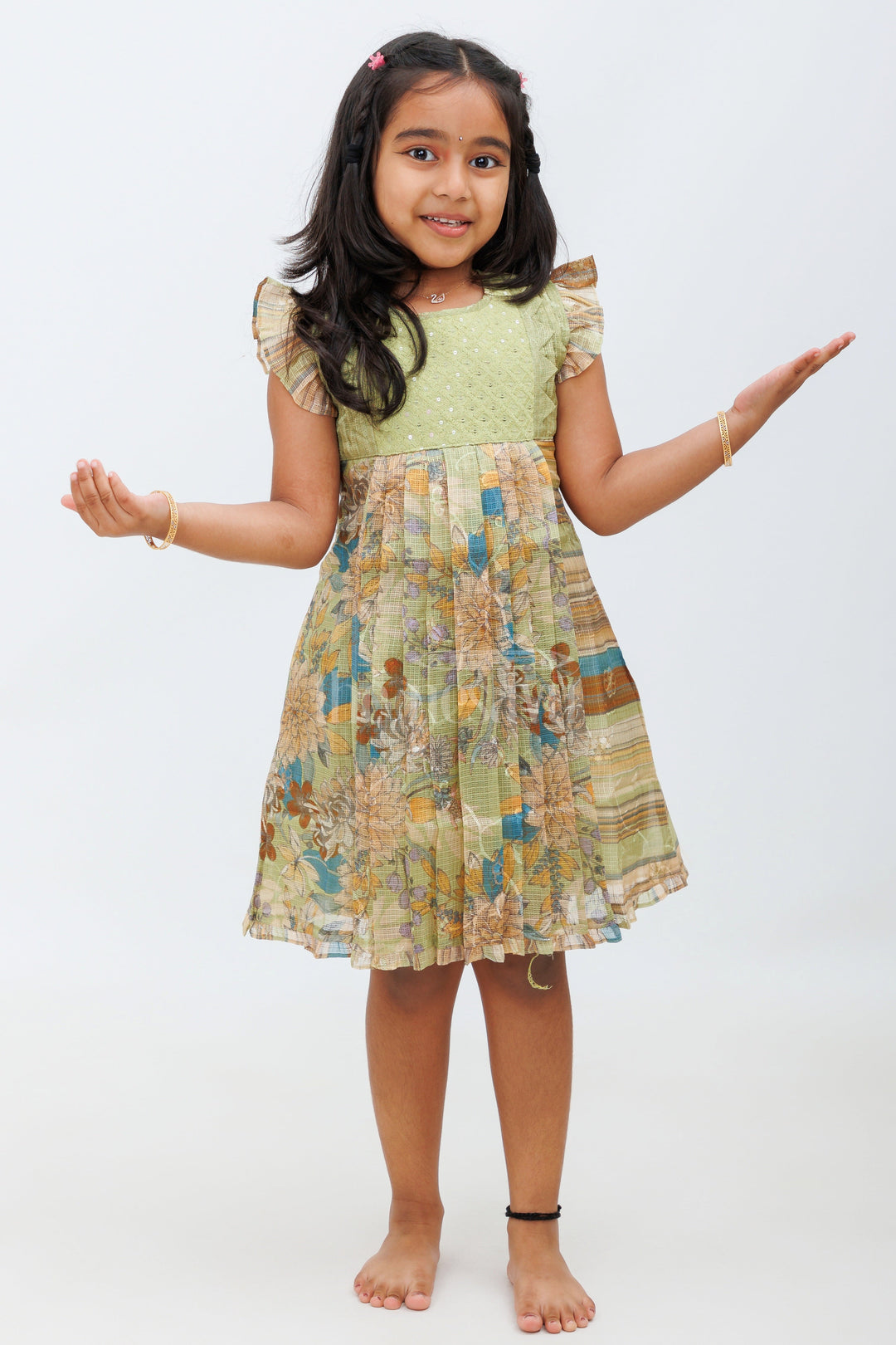 The Nesavu Girls Cotton Frock Green Cotton Frock with Floral Print and Box Pleats Nesavu 22 (4Y) / Green GFC1372A-22 Green Cotton Frock with Floral Print and Box Pleats - Nesavu