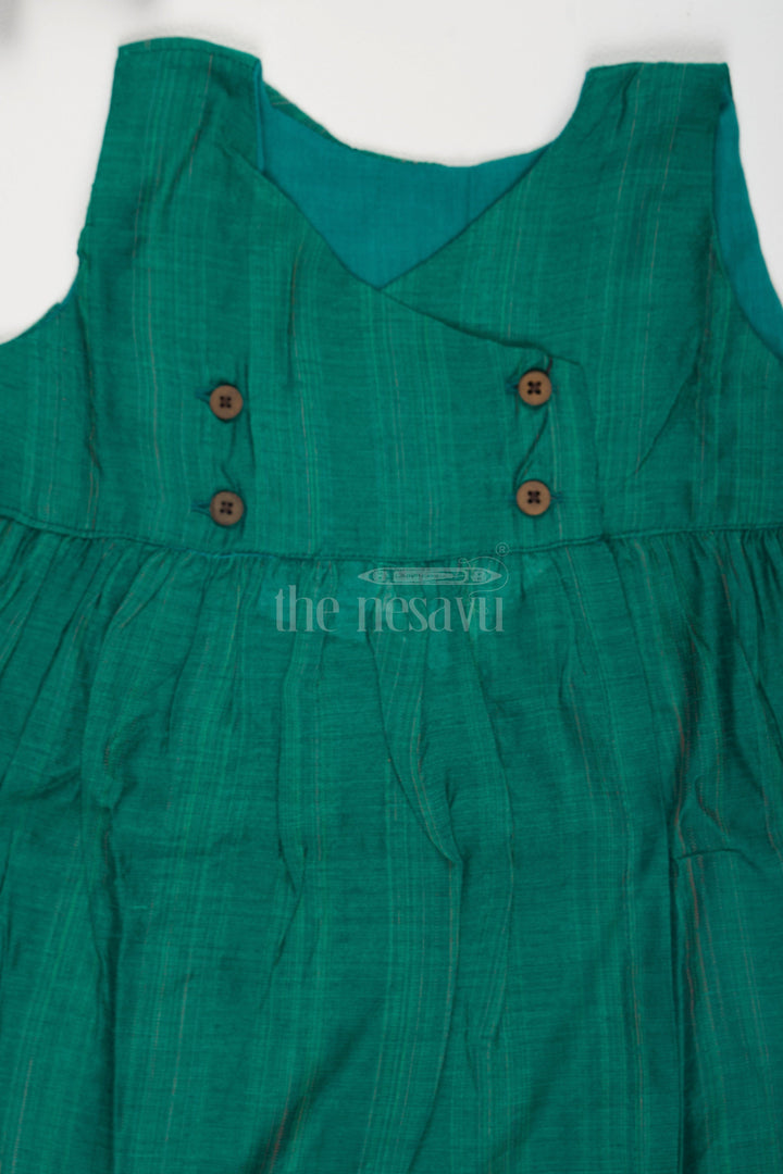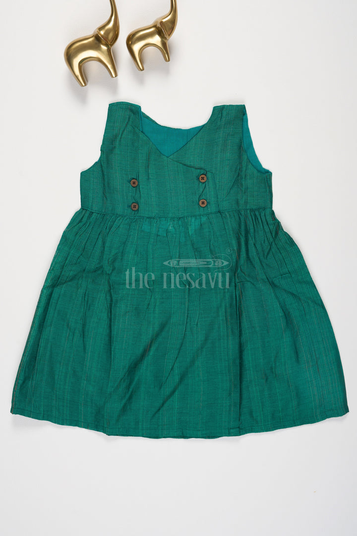 Let your toddler shine in this green striped Chanderi viscose silk frock, tailored for festive and ethnic events. The frock features an elegant overlap mocked neckline with four buttons, providing both style and comfort. Perfect for occasions like Diwali and Christmas, this frock will make your little girl look adorable while keeping her comfortable.