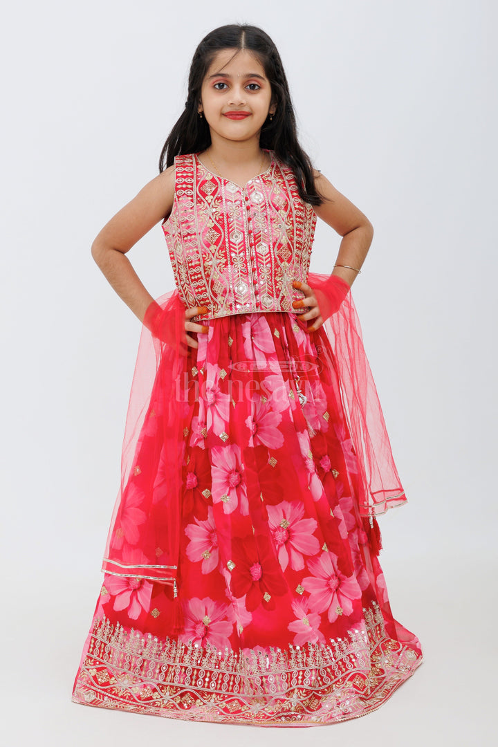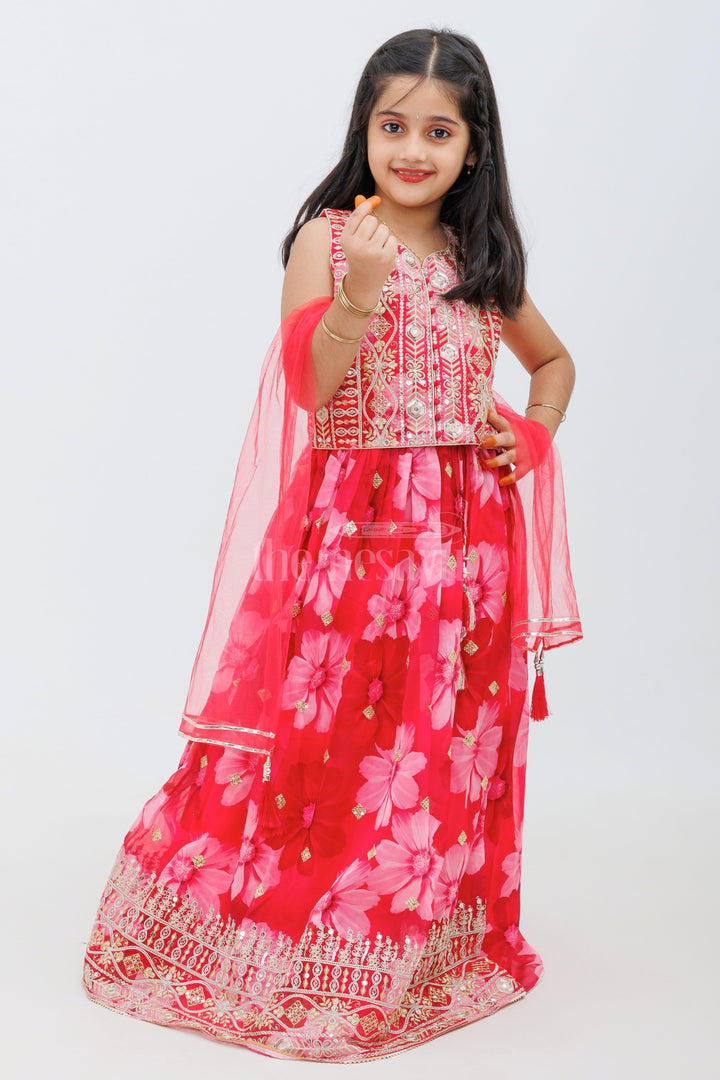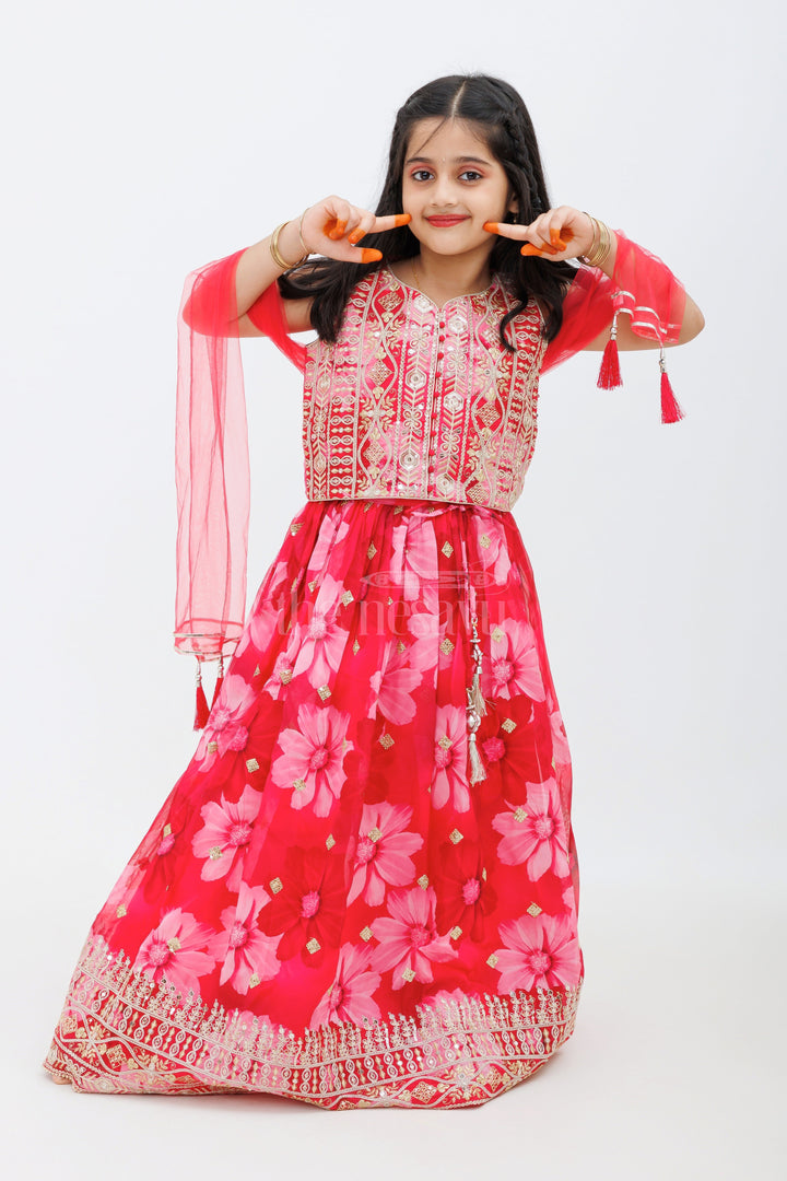 This beautiful pink Chinon silk lehenga choli set is perfect for your little one’s festive wardrobe. The lehenga features delicate organza fabric with floral prints, while the choli is richly embroidered with intricate threadwork. The set comes with a plain pink dupatta, making it a complete outfit for weddings, festivals, and other celebrations.