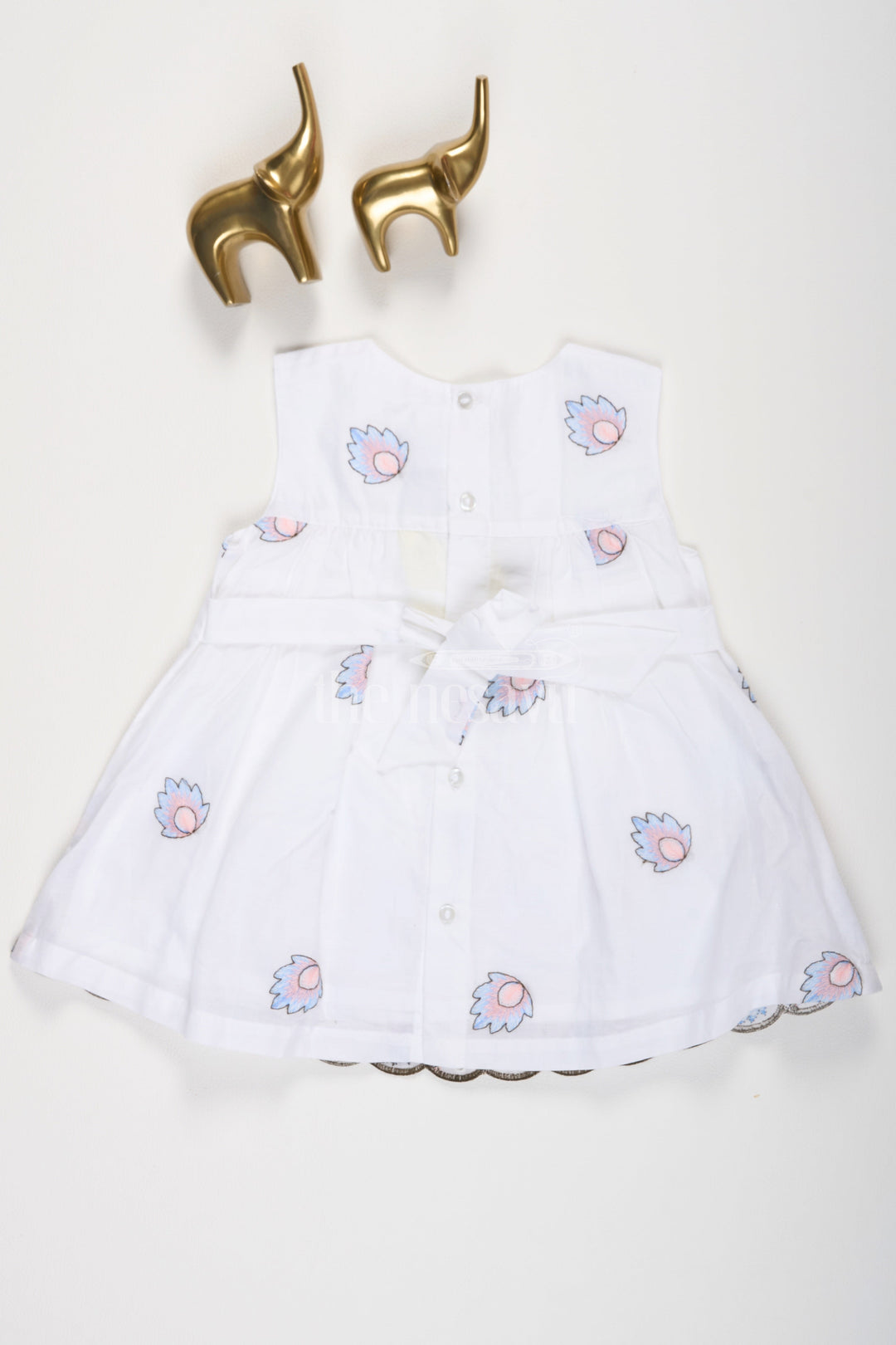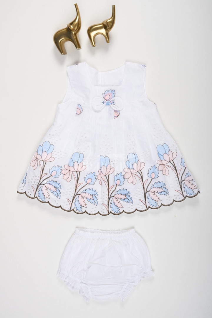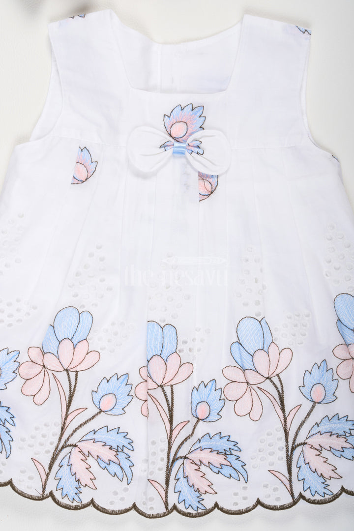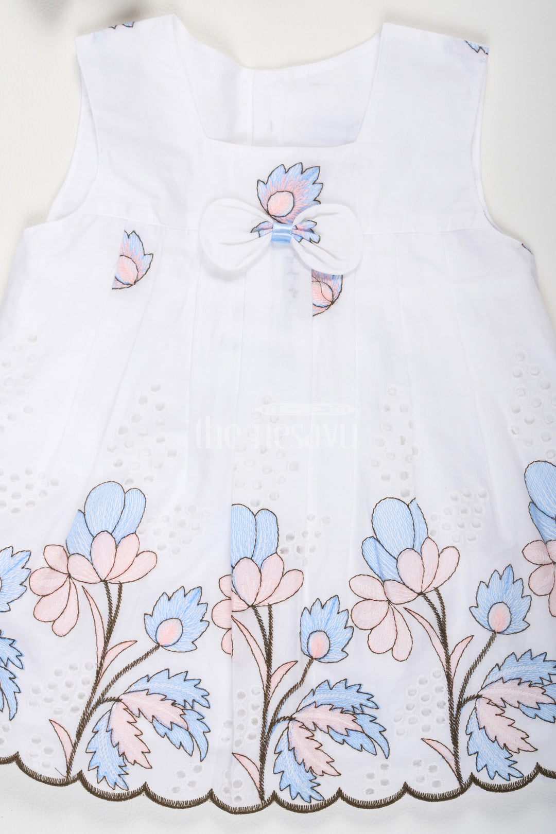 The Nesavu Baby Casual Sets White and Blue Chikankari Cotton Frock with Floral Embroidery Nesavu 10 (NB) / White BFJ610C-10 White and Blue Chikankari Cotton Frock with Bloomers - Nesavu