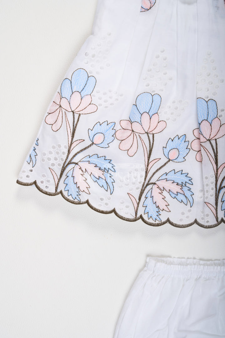 The Nesavu Baby Casual Sets White and Blue Chikankari Cotton Frock with Floral Embroidery Nesavu White and Blue Chikankari Cotton Frock with Bloomers - Nesavu