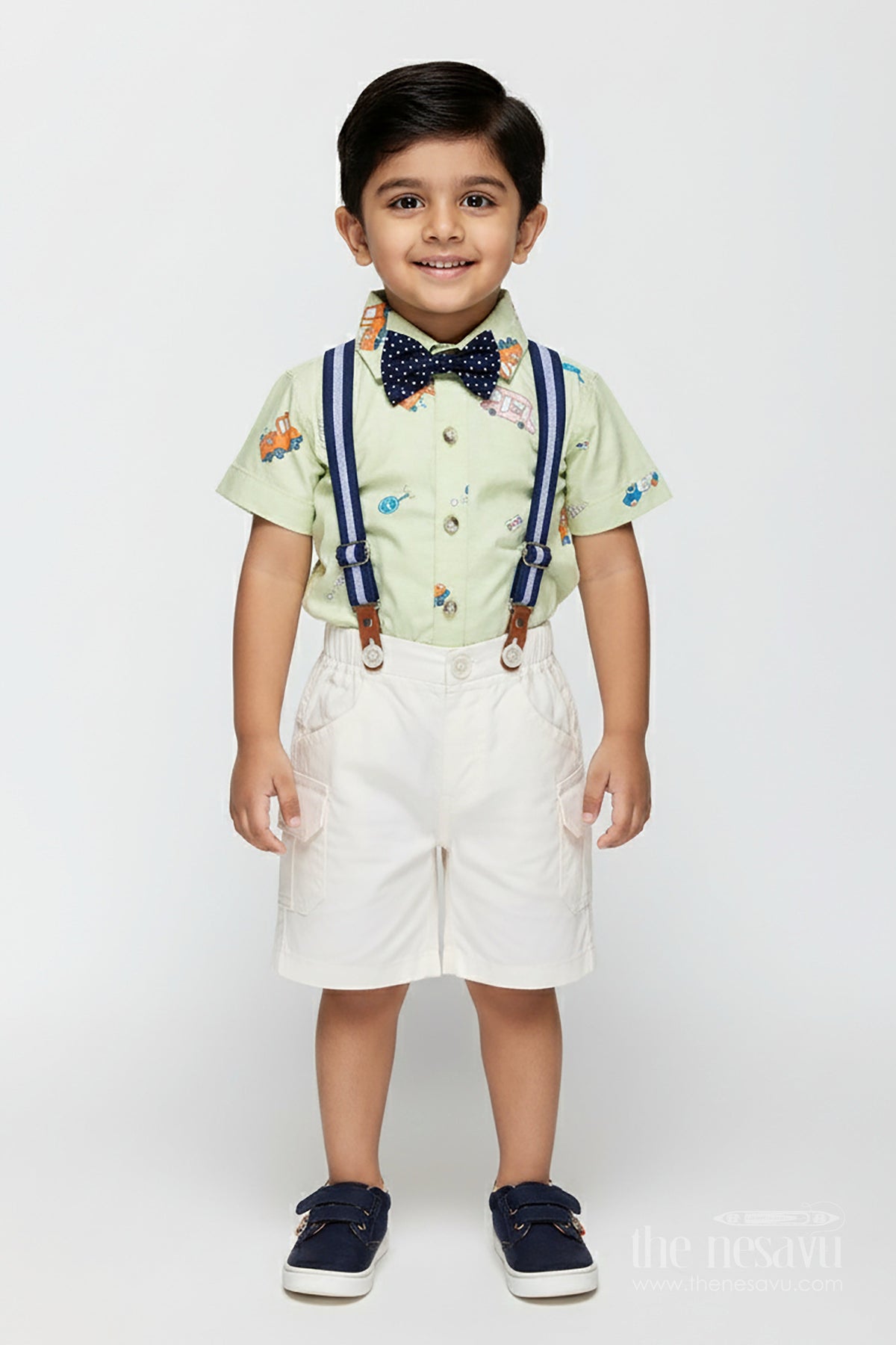 The Nesavu Boys Casual Set Baby Boy Light Green Outfit with Cartoon Vehicle Print and Cream Shorts Featuring Suspenders Nesavu Nesavu Baby Boy Light Green Outfit Vehicle Print Shirt White Shorts Suspenders