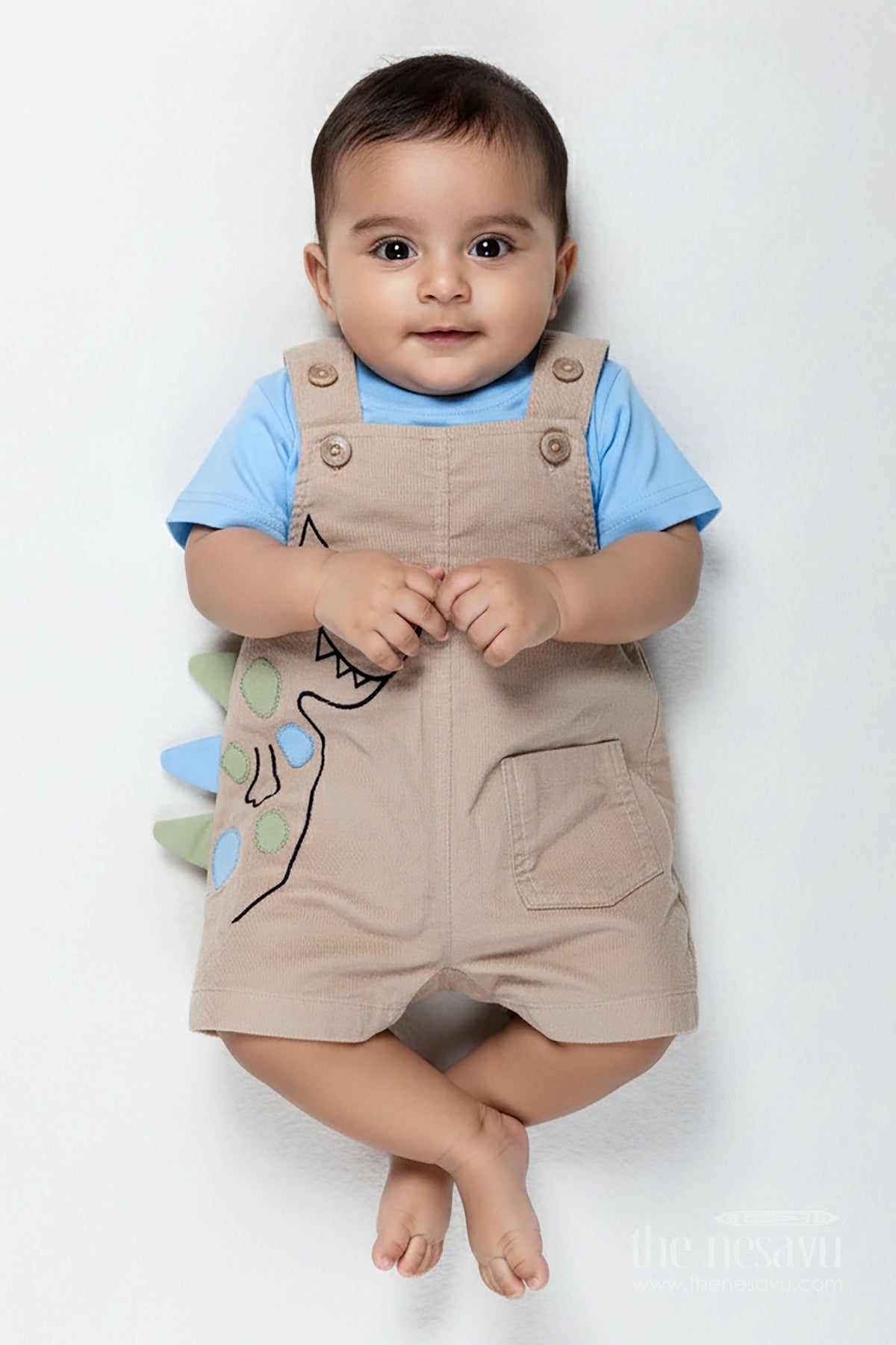 This cheerful summer wear for boys set by Nesavu blends adorable styling with breathable comfort for the warm season. Featuring a sky blue cotton jersey T-shirt and beige corduroy overalls, the set brings a playful twist with a charming dinosaur appliqué complete with colorful 3D fabric spikes. The knitted cotton jersey keeps your child cool, while the corduroy shorts add structure and durability. Designed with adjustable straps and snap closures for hassle-free dressing, this outfit is ideal for outings, picnics, or relaxed play at home. It’s soft, fun, and tailored for comfort without compromising on personality.