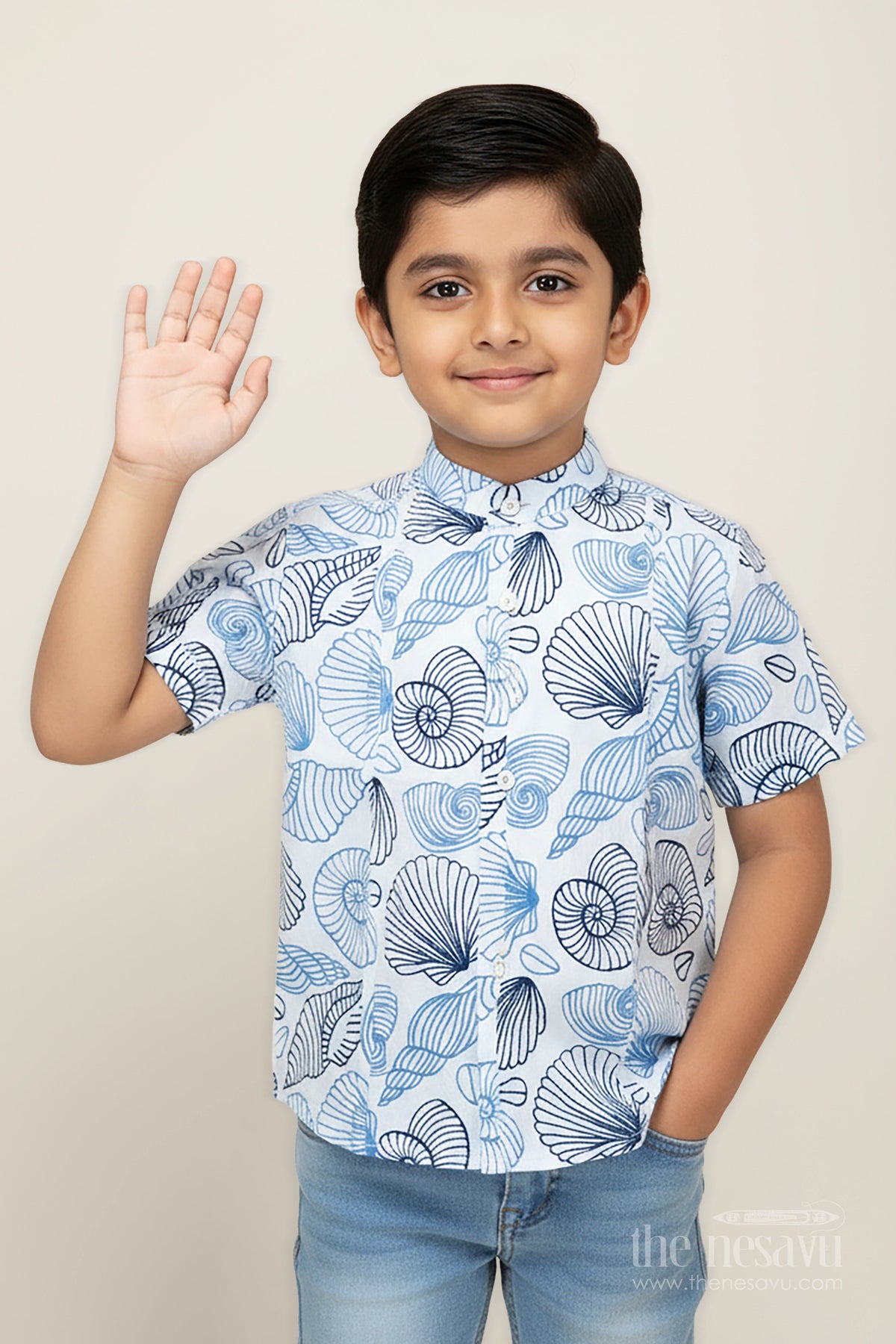 Toddler boys casual shirt for day events blends cool comfort with playful design. Crafted in breathable cotton with digital print, this shirt features a soft light-blue base filled with bold navy shell and sea-inspired illustrations. Ideal for day outings, beach-themed gatherings, or casual family events, the shirt offers an airy structure with half sleeves and a sleek collar that’s easy to wear. Its fun marine motif brings coastal vibes to your toddler’s wardrobe while keeping things stylish and light. Pair it with denim or cotton shorts for a relaxed, summery look.