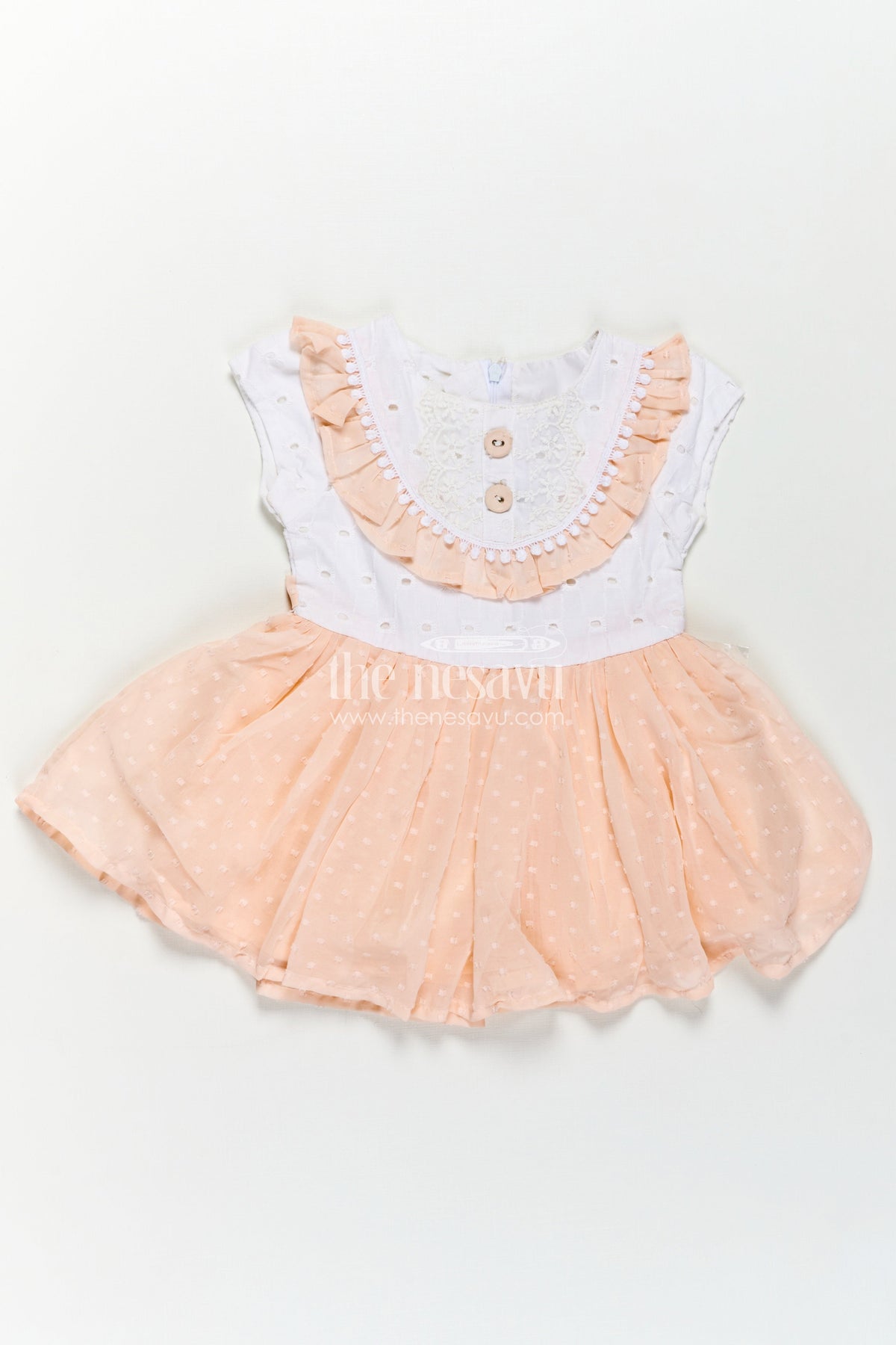 Peach frock suit brings a soft pastel elegance to your baby girl's wardrobe. Designed with a delicate Hakoba lace embellished yoke in ivory, this frock features decorative buttons and ruffle detailing on the neckline. The bottom flares out into a dreamy peach-colored georgette skirt dotted with soft polka prints, creating a playful yet refined look. This frock comes with a matching bow hairband, making it a complete set that’s perfect for special moments, from birthday parties to casual family gatherings.