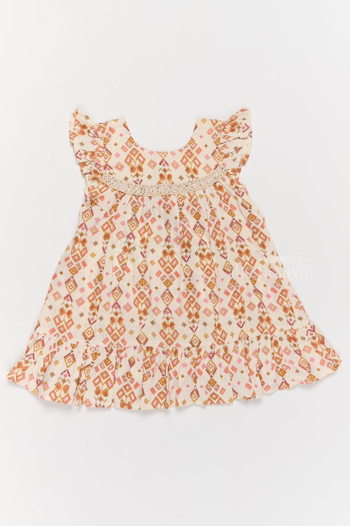 Elevate your child’s wardrobe with this Cotton Dress Fashion, featuring a unique geometric print in earthy tones. Crafted from soft Rayon fabric, this dress blends comfort with a trendy style. The lace yoke adds a touch of sophistication, while the flutter sleeves and ruffled hemline complete its playful silhouette. Perfect for festive gatherings or family events, this dress is a versatile addition to your child’s closet. Its lightweight design and eye-catching patterns ensure she feels confident and comfortable on any occasion.