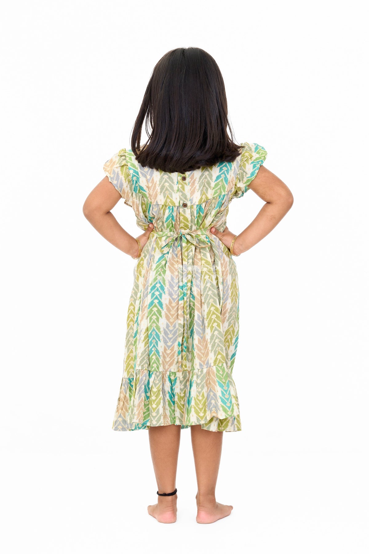 Keep your child cool and fashionable with this Cotton Frock for Summer, featuring a trendy chevron print in earthy greens and soft neutrals. Made from lightweight Rayon, this dress offers breathable comfort even on the warmest days. The lace yoke adds a sophisticated touch, while the flutter sleeves and ruffle hemline bring out a playful charm. Designed for summer outings or playdates, this frock is perfect for everyday wear. The chevron print and airy fit make it a stylish yet practical addition to your little one’s wardrobe.