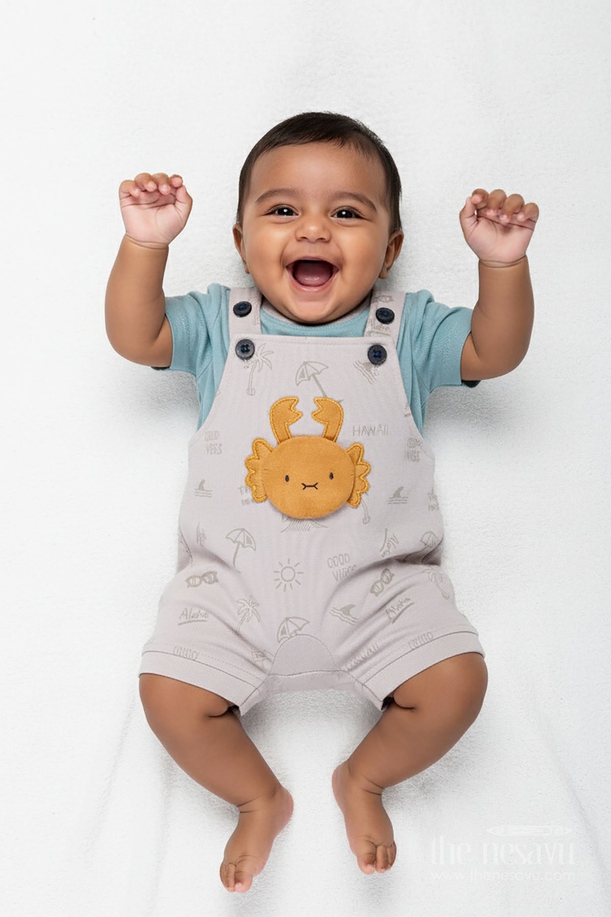Casual colorful outfits are a bright and fun option for baby boys who love vibrant styles. Made from breathable cotton, this set includes a white dungaree with a cheerful yellow animal embroidery on the front, paired with a mint green short-sleeve tee. Lightweight and gentle on the skin, this outfit is perfect for warm days and active play. The contrast between the soft neutral base and bright detailing adds visual appeal, while the functional design ensures all-day comfort. Snap-button closures and adjustable straps offer easy wearability, making this a parent-friendly favorite. It’s a colorful outfit made for giggles and good times.