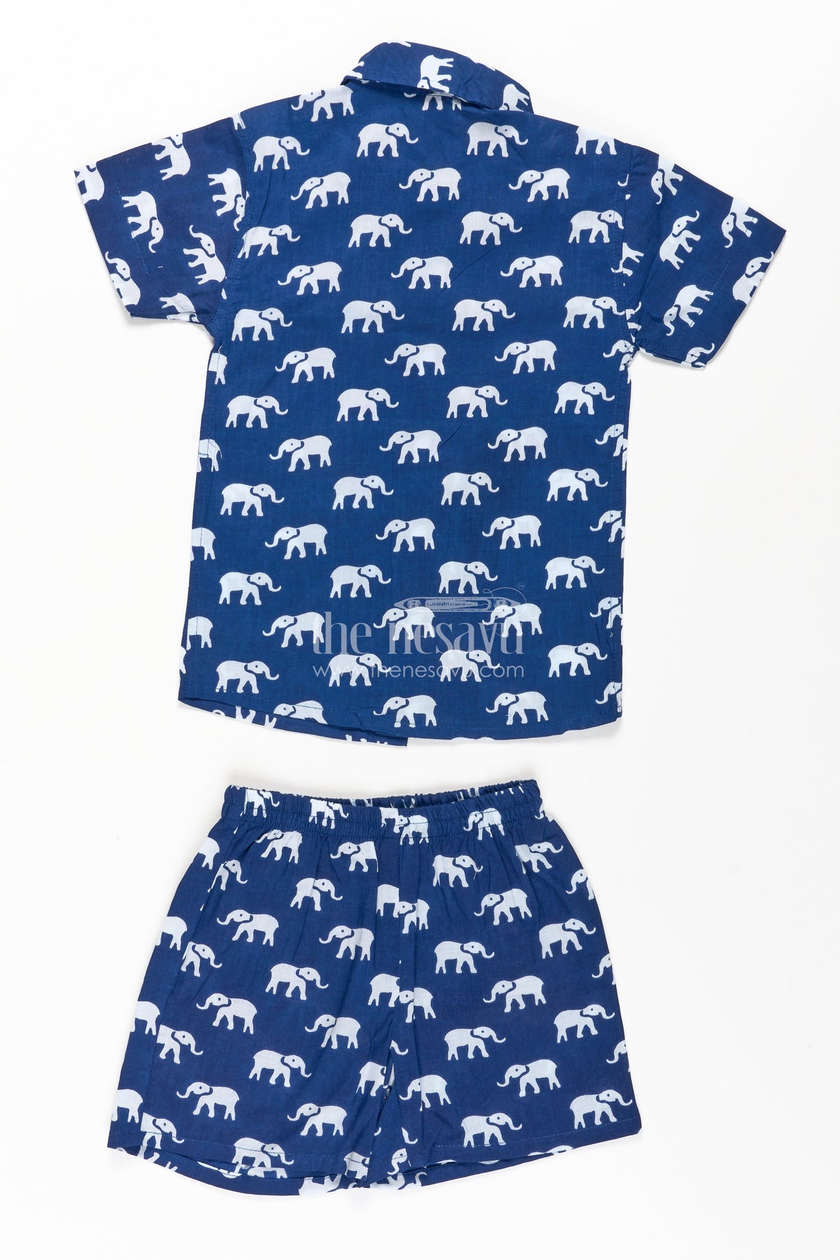 The Nesavu Boys Casual Set Boys Casual Blue Outfit in Cotton with White Elephant Digital Print and Matching Shorts Nesavu Nesavu Boys Casual Blue Outfit Cotton White Elephant Print Shirt Shorts