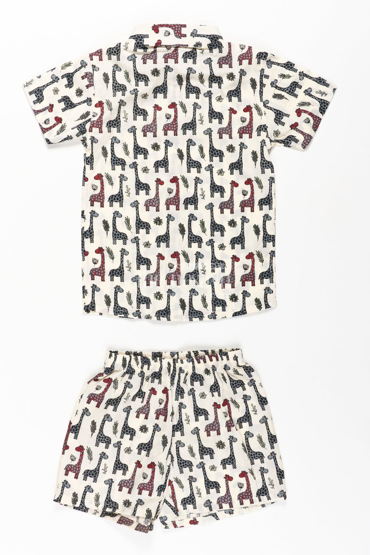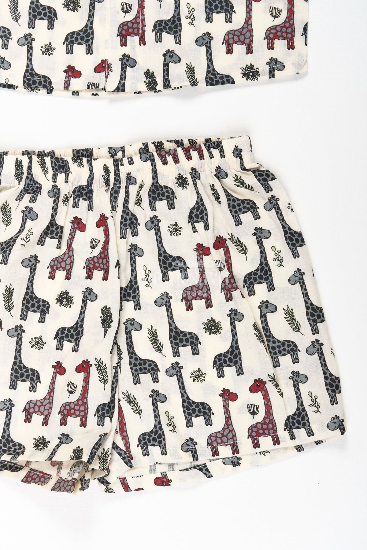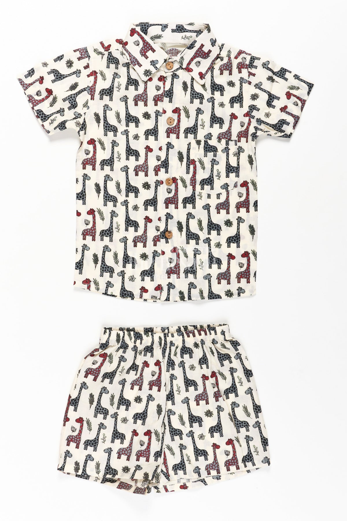 The casual cotton trousers set is a delightful pick for boys who enjoy animal-themed fashion. Designed in soft cream cotton, it features charming giraffe prints in black, red, and grey tones. This two-piece set includes a short-sleeve collared shirt with wooden buttons and matching elastic waist shorts. Perfect for both summer outings and daily wear, this outfit offers breathability and charm in one fun and functional design. A playful wardrobe staple that guarantees comfort and style for your little one.