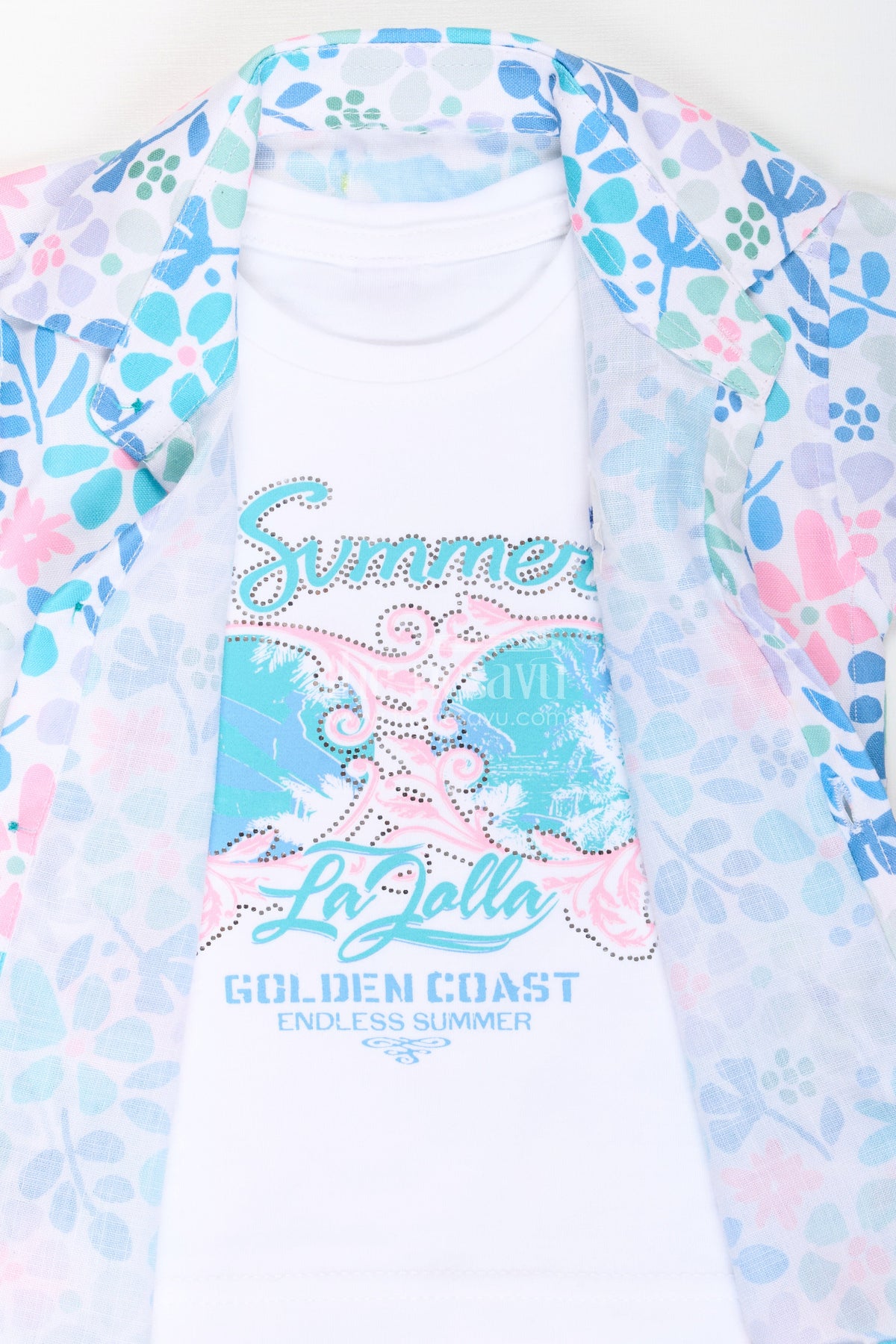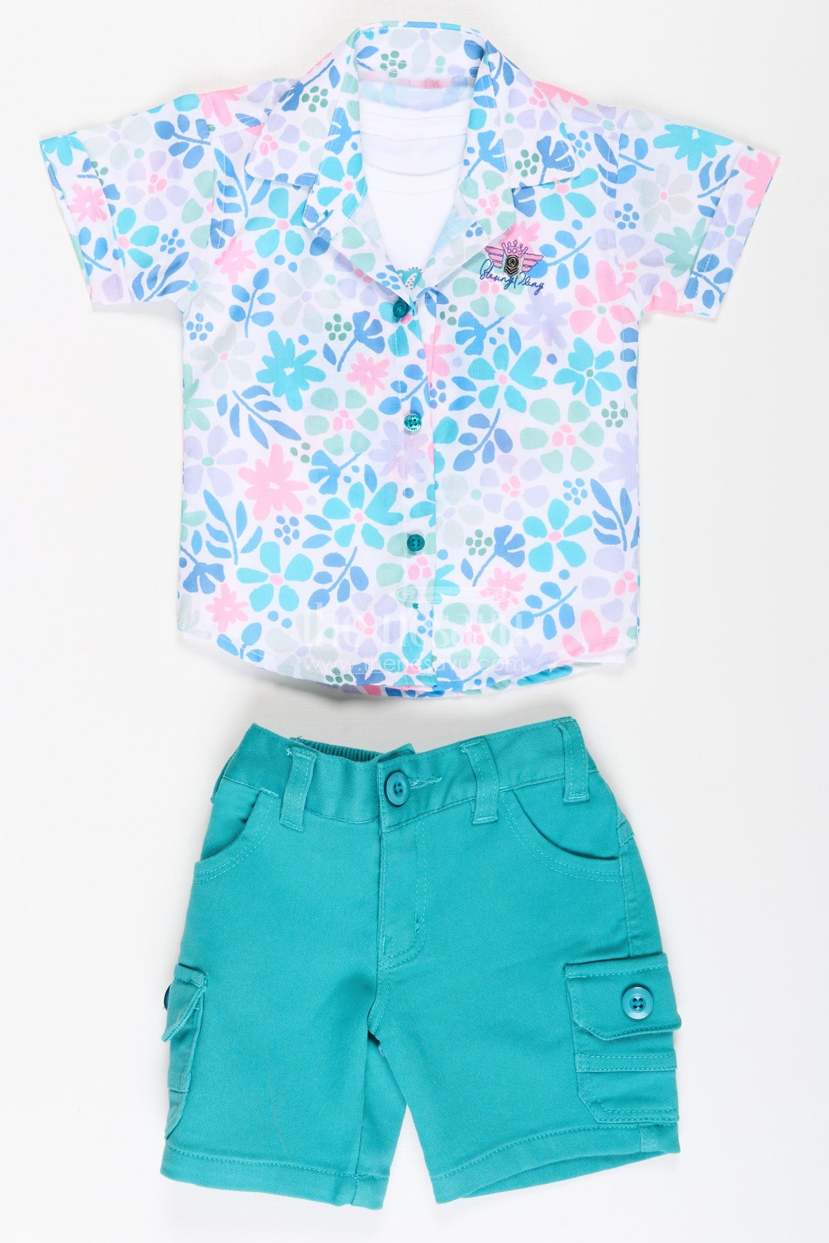 Best casual shirts come to life in this stylish three-piece boys’ outfit designed for ease and fashion. This set includes a half-sleeve floral printed shirt in cool pastel tones, a sleeveless summer-themed graphic tank, and coordinating green cargo shorts. Made from breathable cotton, the outfit is ideal for active play and relaxed events alike. The vibrant prints keep the look fun and trendy, while the cargo shorts ensure practical storage for little explorers. A wardrobe essential that offers versatility, comfort, and style in equal measure.