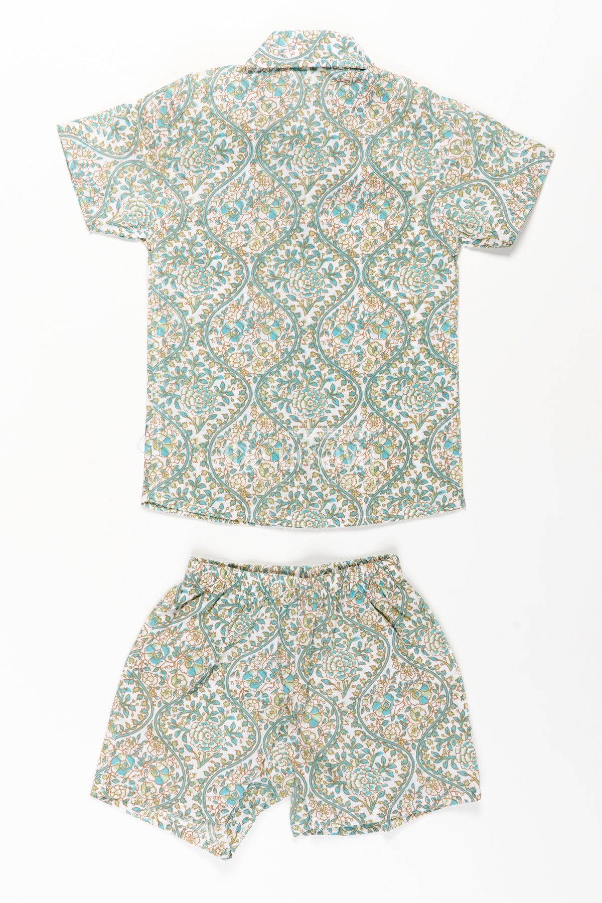 The Nesavu Boys Casual Set Boys Green Casual Shirts Set in Cotton with Floral Block Print Inspired Pattern Nesavu Nesavu Boys Green Casual Shirts Cotton Set Floral Block Print Pattern Matching Shorts