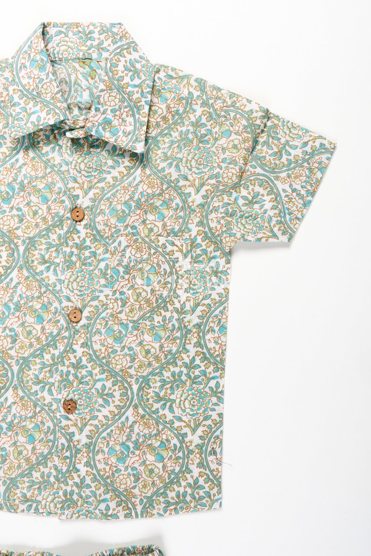 Boys Green Casual Shirts Set in Cotton with Floral Block Print Inspired Pattern
