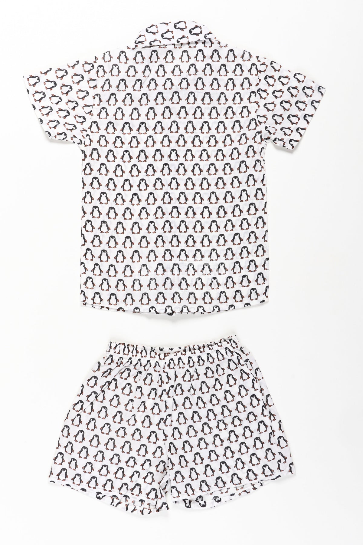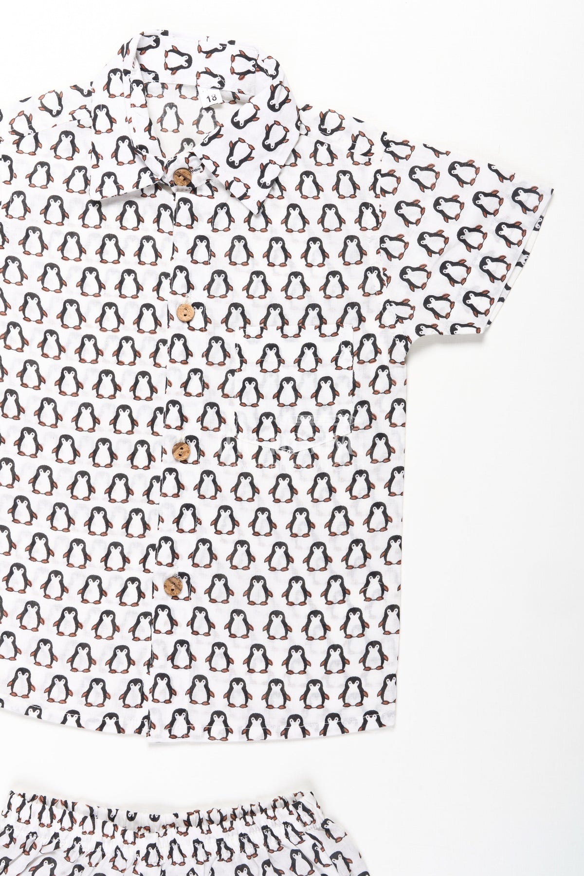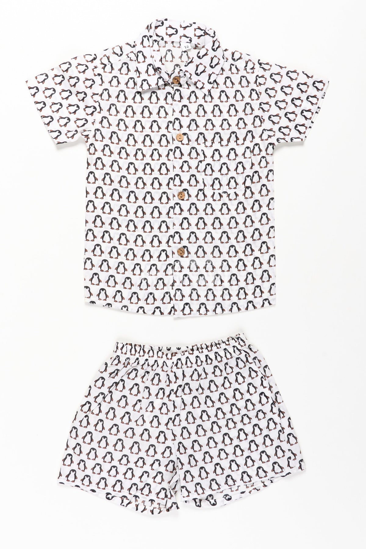 Boys Smart and Casual Wear Set with Penguin Print Shirt and Matching Shorts in Cool Cotton Fabric