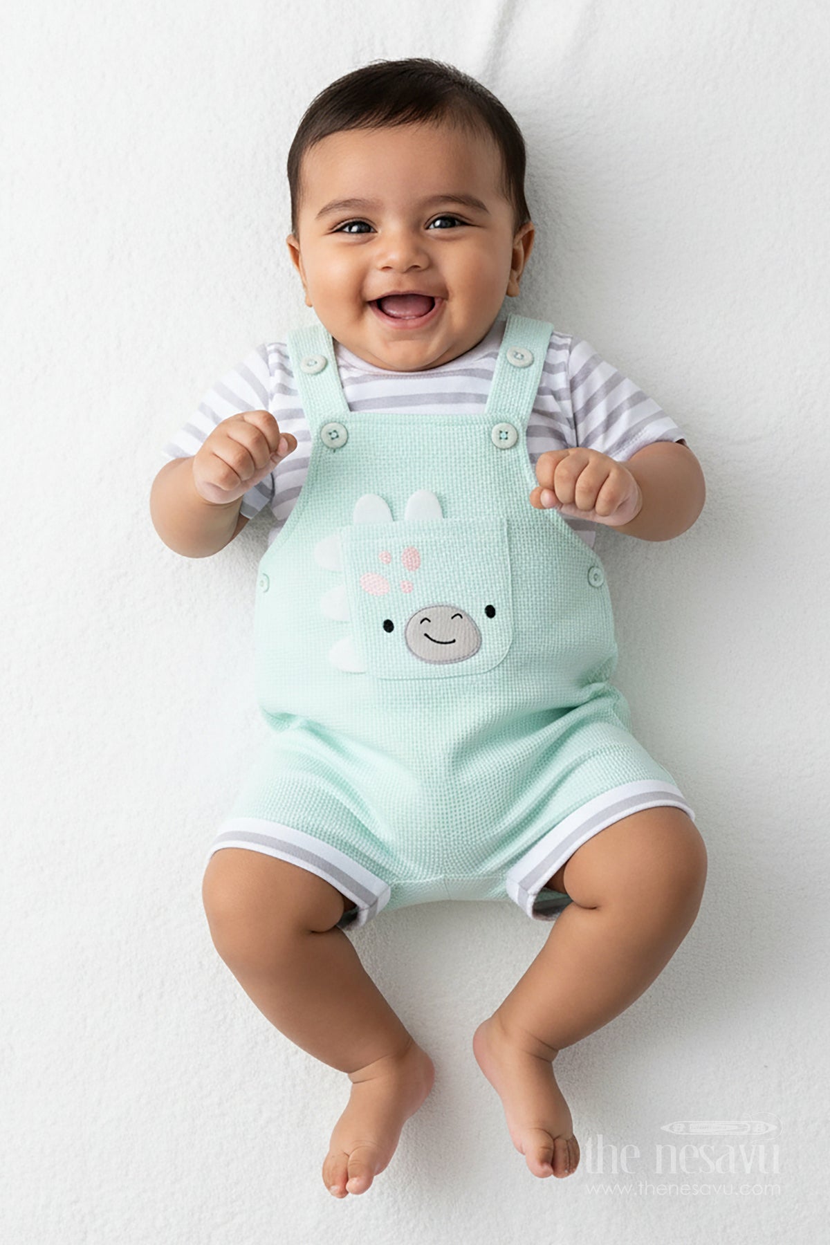 The waffle shirt and shorts set is a fun and functional outfit for boys that combines charm with all-day comfort. This set includes a grey striped waffle knit T-shirt and mint green dungaree-style shorts featuring an adorable smiley face patch. Made from breathable cotton waffle knit, this outfit is soft to the touch and perfect for active days. The short-sleeved tee pairs perfectly with the relaxed-fit overalls, which include adjustable buttoned straps for easy dressing. Whether it's a trip to the park or a playdate at home, this set adds a pop of personality to your child’s wardrobe.