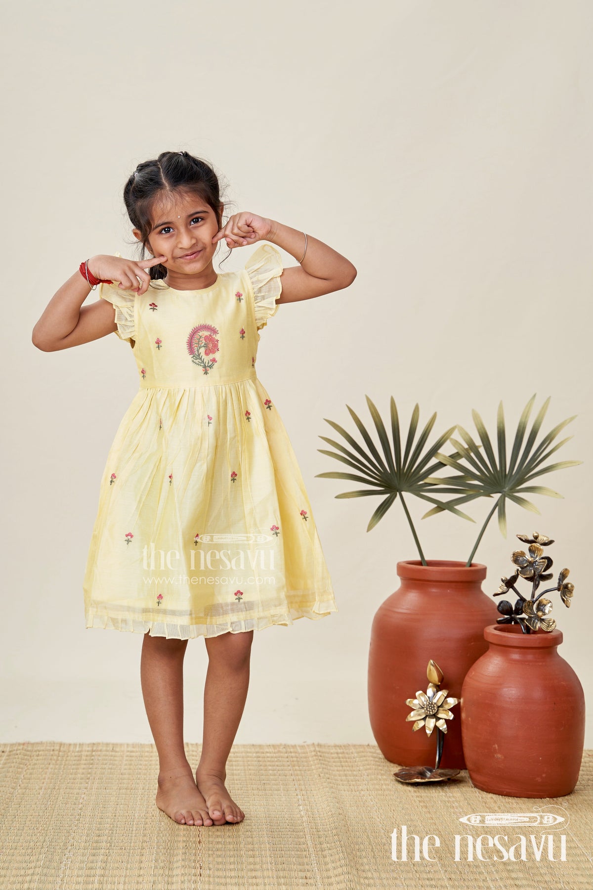 The Nesavu Girls Chanderi Frock Girls Chanderi Frock in Vibrant Colors with Thread Embroidery for Festive Moments Nesavu 16 (1Y) / Yellow GFC1839A-16 Nesavu Yellow Chanderi Cotton Girls Frock Floral Embroidery Ruffled Sleeves Traditional Wear