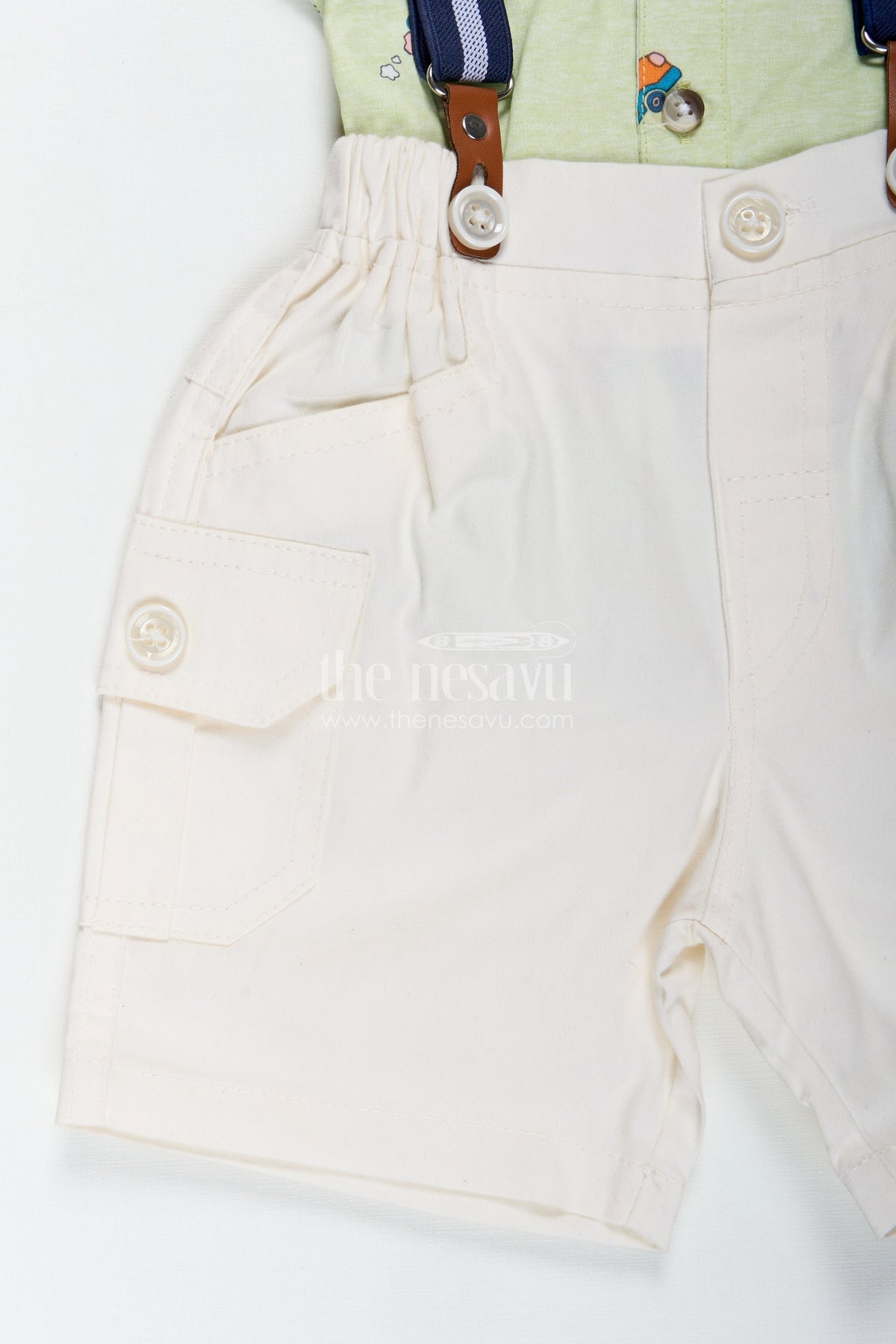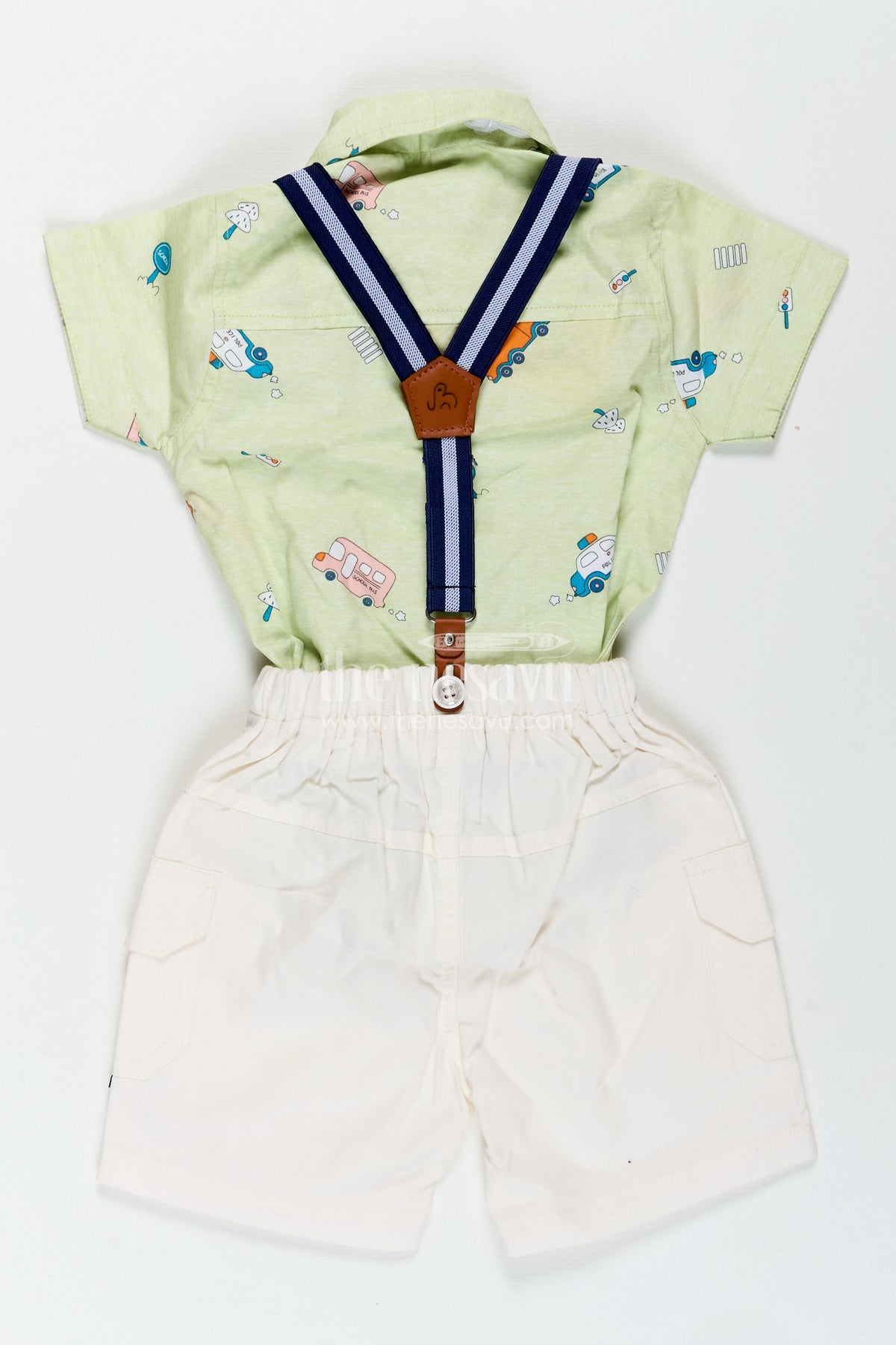Baby Boy Light Green Outfit with Cartoon Vehicle Print and Cream Shorts Featuring Suspenders
