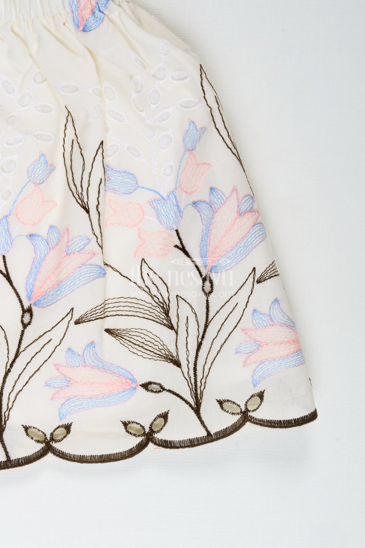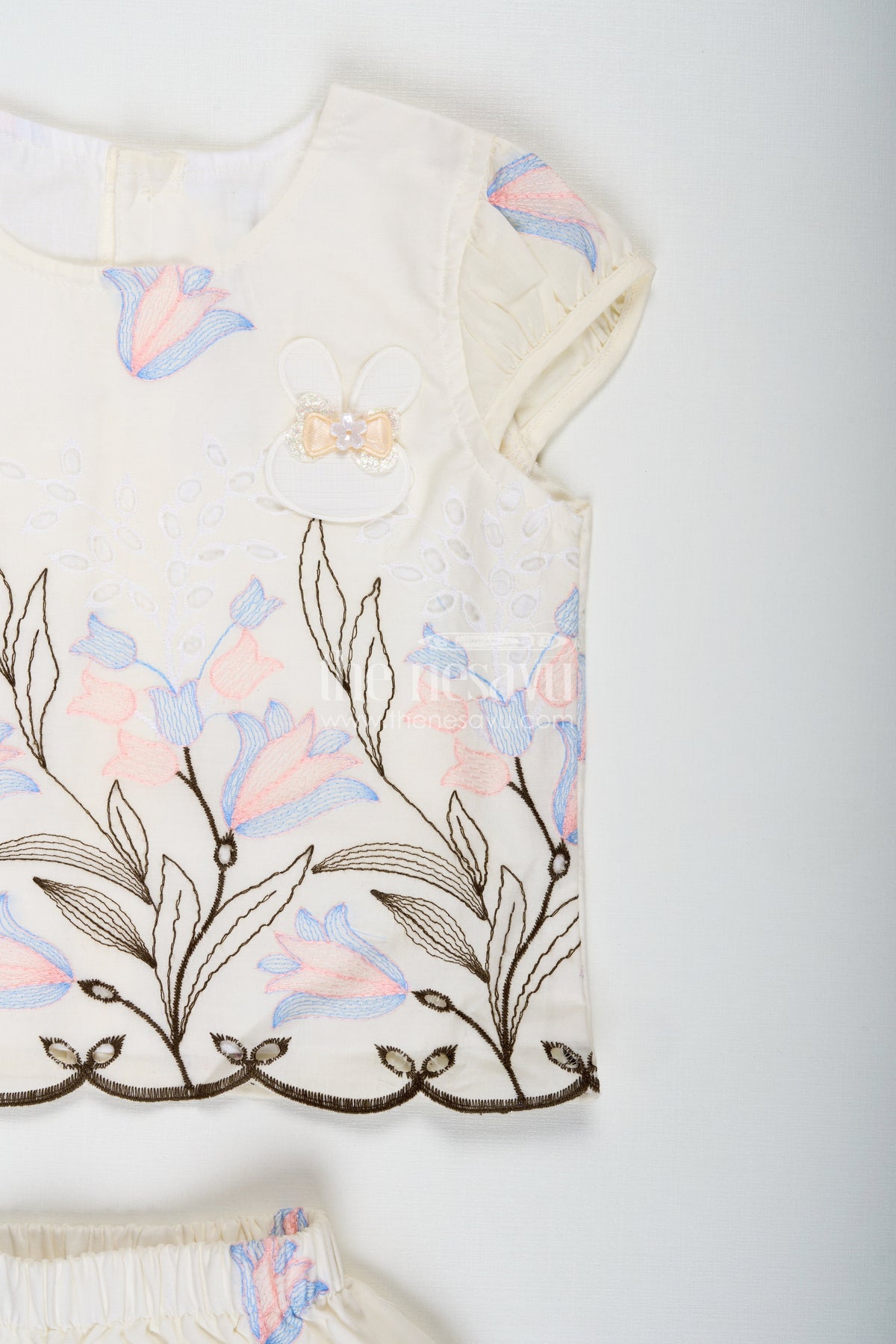 Baby Casual Clothing Set for Playtime is a sweet and stylish outfit that combines playful embroidery with all-day comfort. Made from soft cream cotton, this set features a delicately embroidered floral pattern in shades of pink. The cap-sleeved top includes a bunny patch that adds a cute character touch, while the elasticated skirt offers a snug fit perfect for crawling, walking, or exploring. Both pieces are finished with scalloped hems and eyelet accents for extra charm. Lightweight, breathable, and easy to dress, this is a perfect everyday outfit for your little one’s adventures.