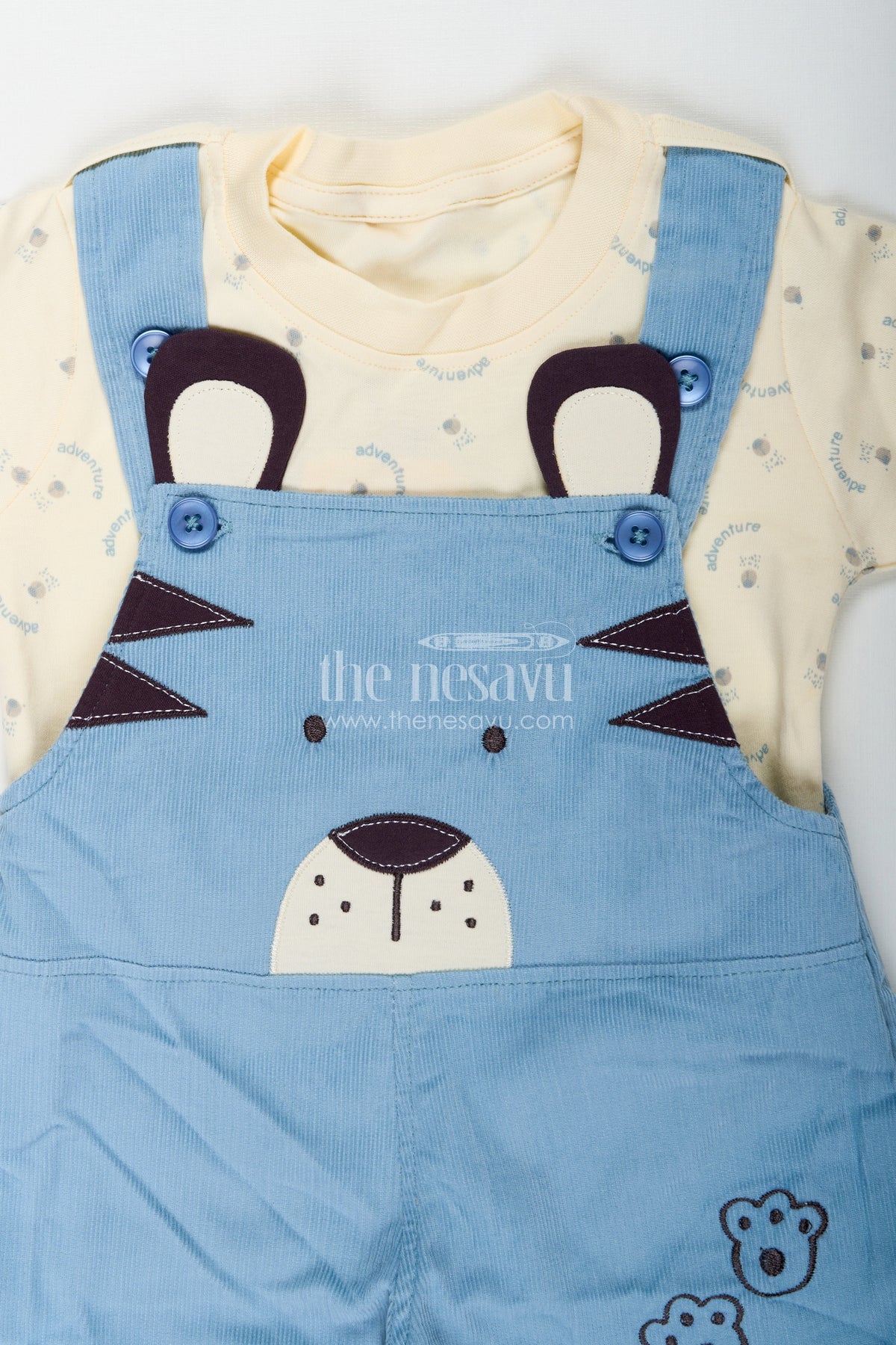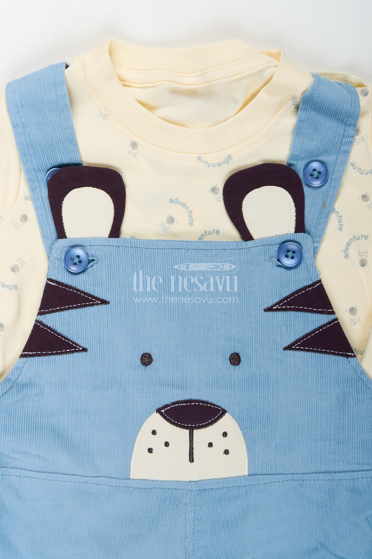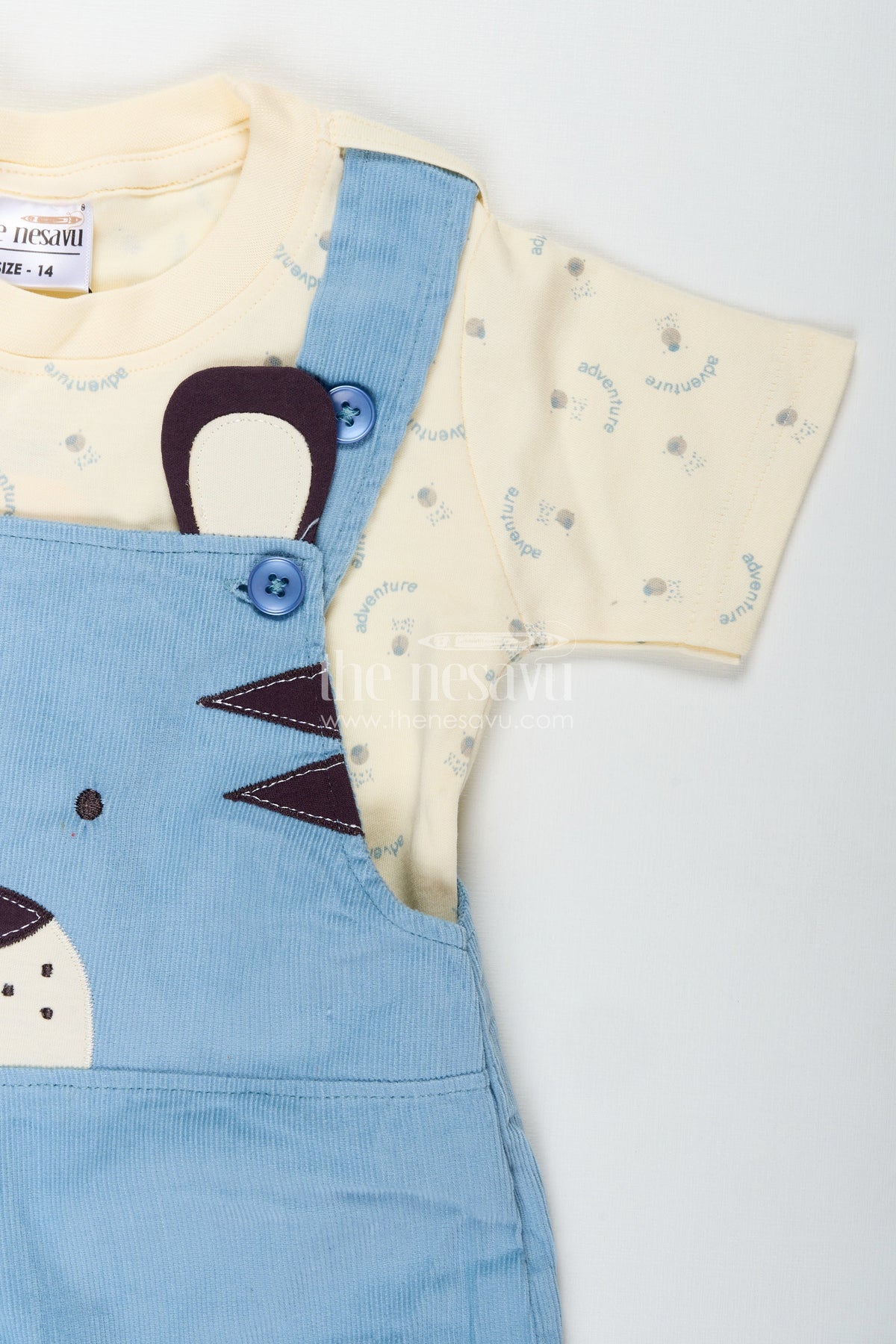 The Nesavu Boys Casual Set Blue Dungaree for Baby Boys with Animal Face Embroidery and Light Yellow Adventure Tee Nesavu Nesavu Blue Dungaree Baby Boys Corduroy Overalls Adventure Print T-Shirt