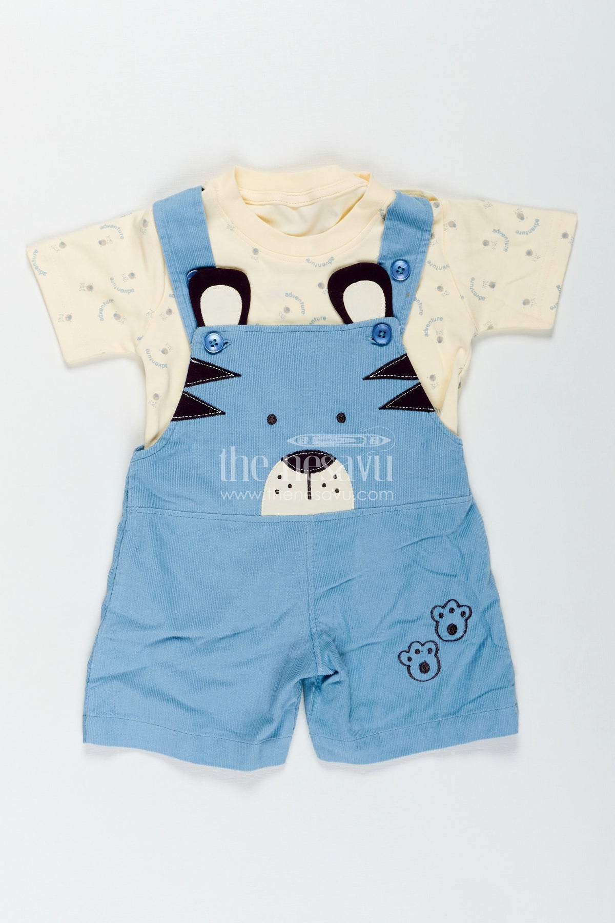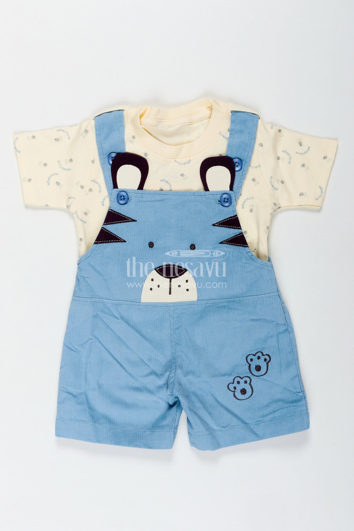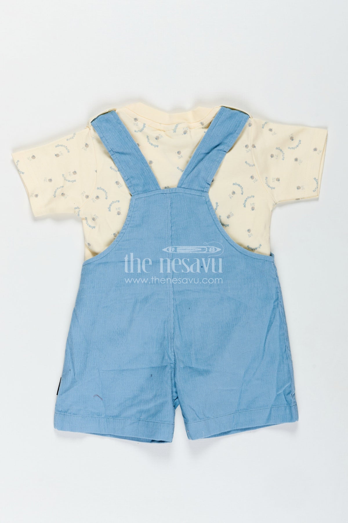The Nesavu Boys Casual Set Blue Dungaree for Baby Boys with Animal Face Embroidery and Light Yellow Adventure Tee Nesavu Nesavu Blue Dungaree Baby Boys Corduroy Overalls Adventure Print T-Shirt