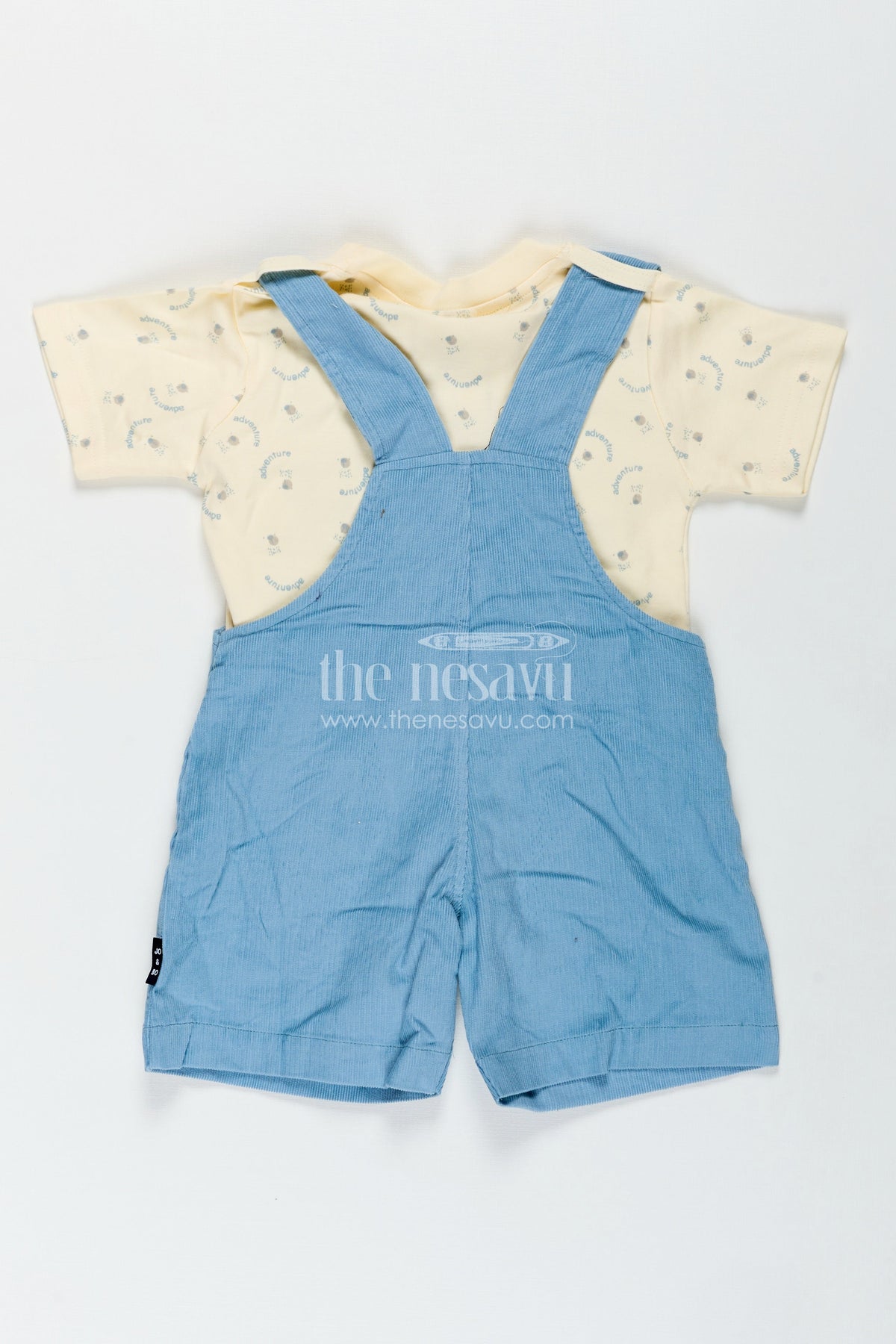 The Nesavu Boys Casual Set Blue Dungaree for Baby Boys with Animal Face Embroidery and Light Yellow Adventure Tee Nesavu 12 (3M) / Blue BCS322B-12 Nesavu Blue Dungaree Baby Boys Corduroy Overalls Adventure Print T-Shirt