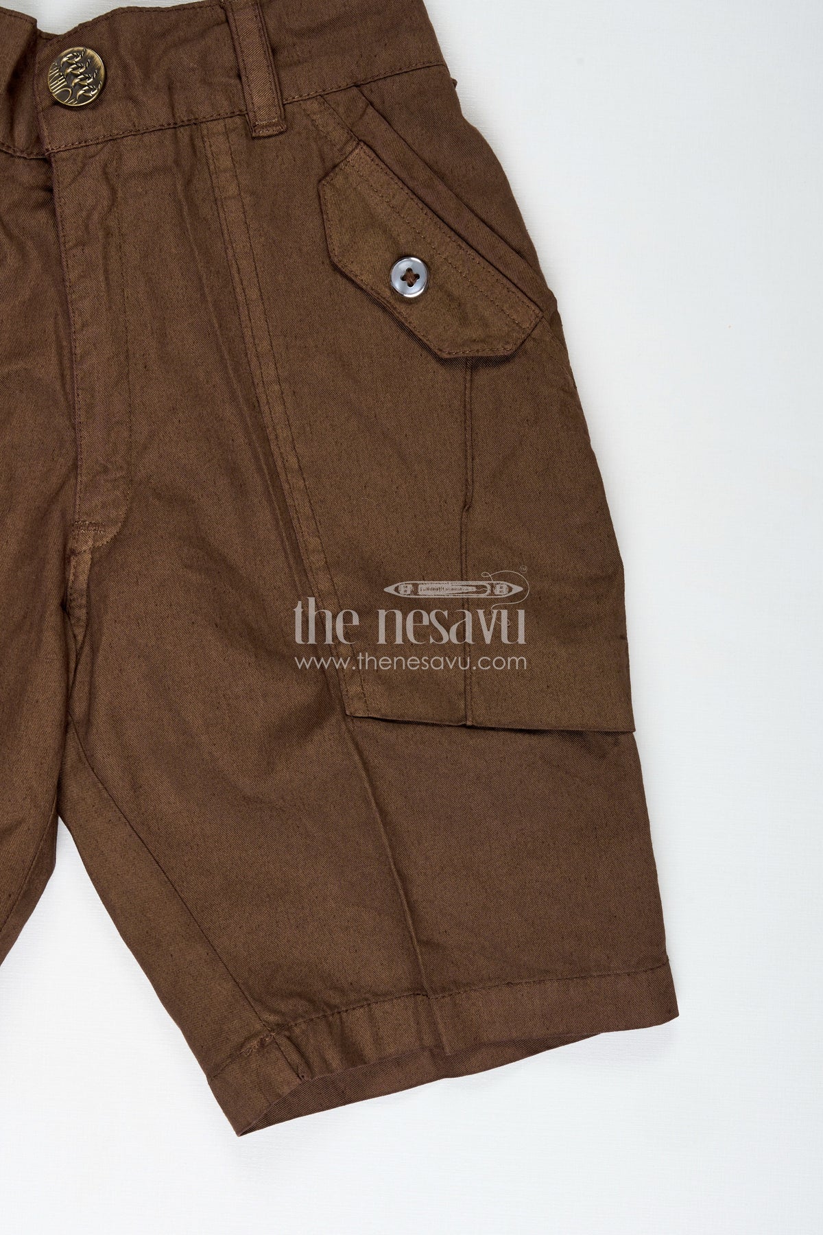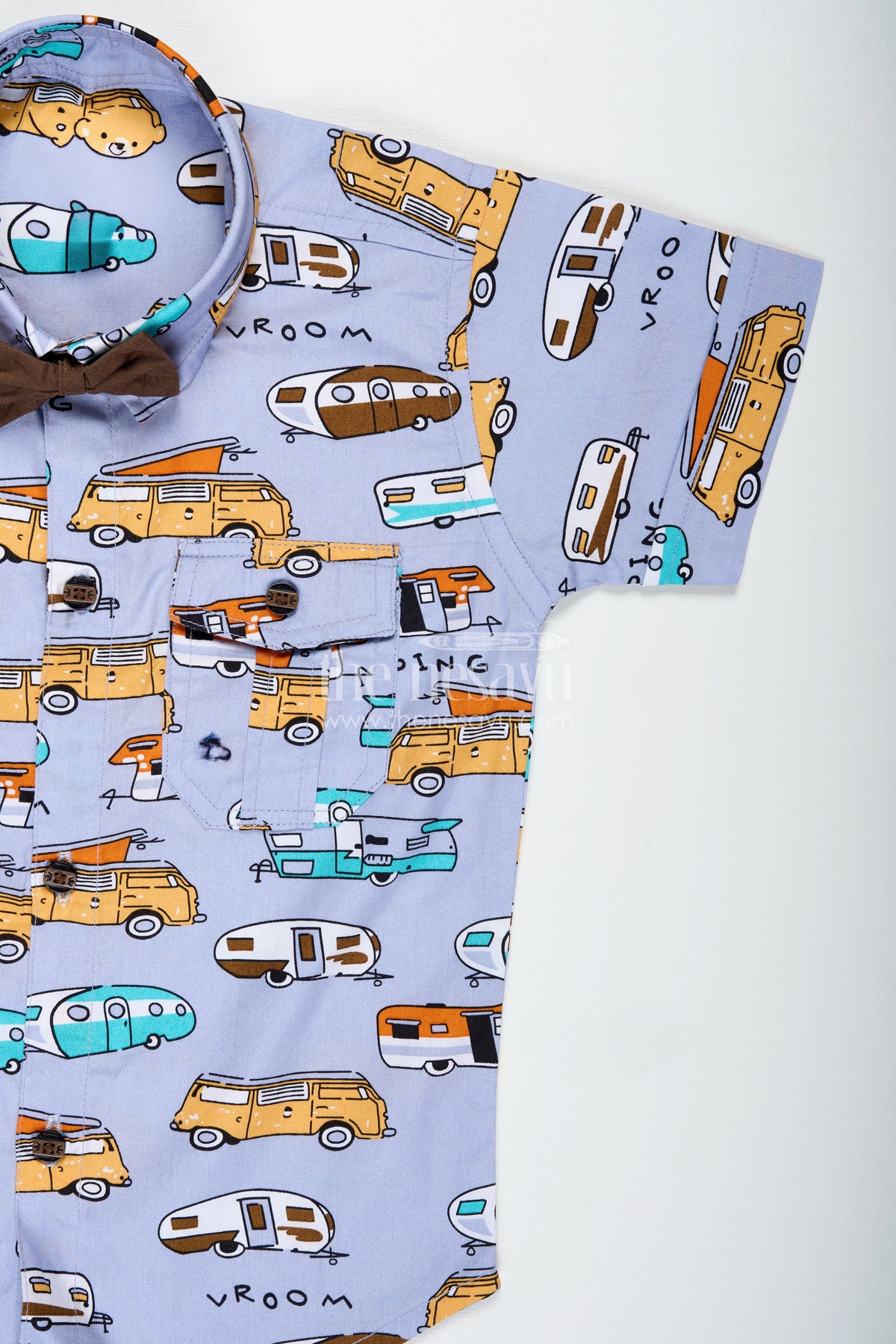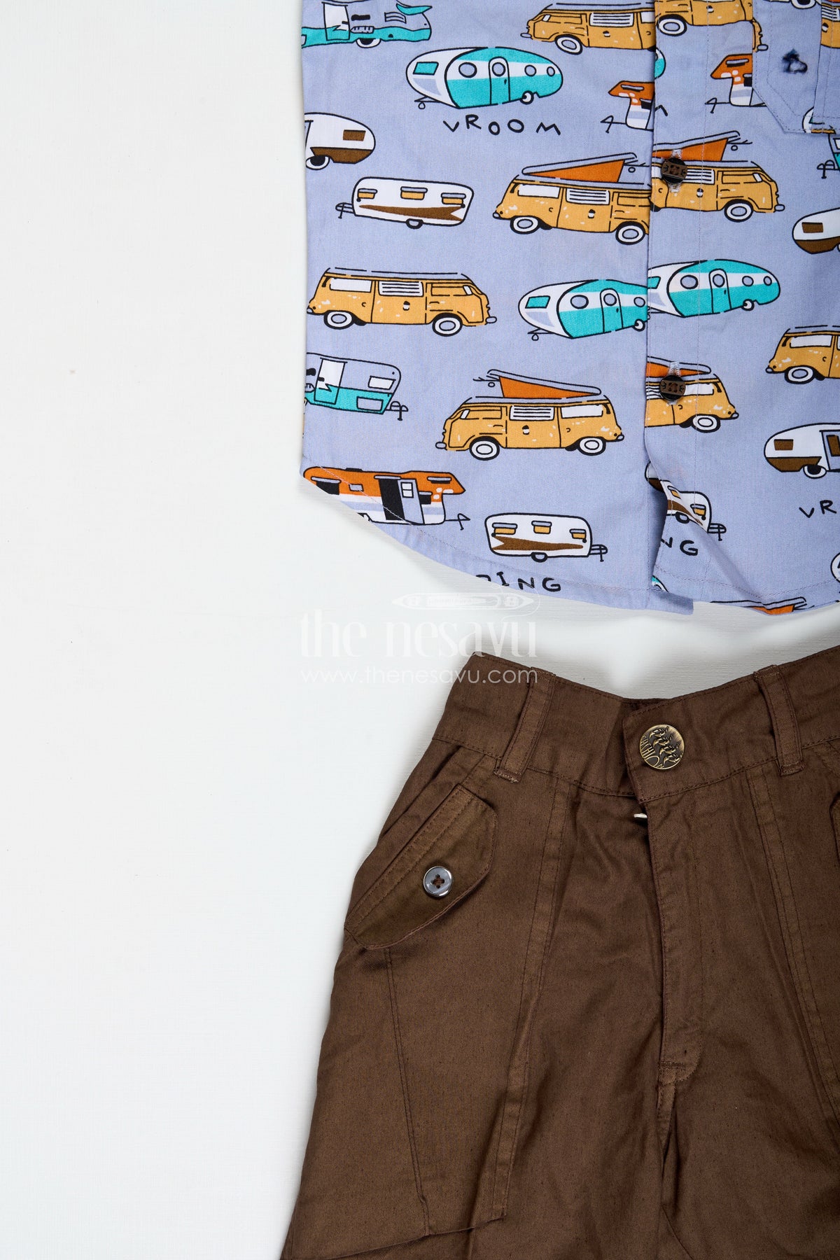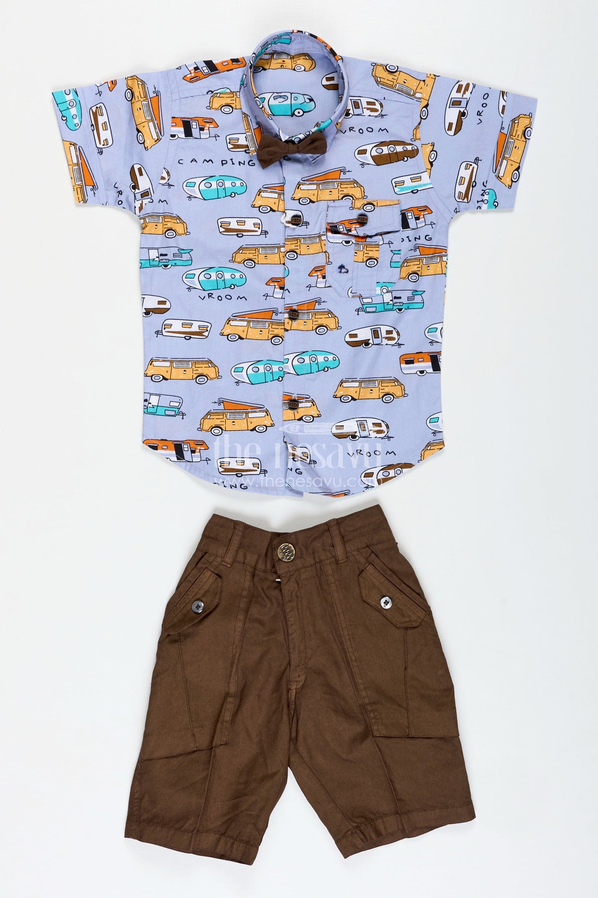 Boys cotton dress set with travel graphics is designed for your little adventurer who’s always ready to go. The blue cotton shirt features colorful digital prints of vehicles, trailers, and road trip elements, bringing the spirit of travel to life. Matched with dark brown shorts, a detachable bow tie, cap, and suspenders, this ensemble offers a complete and polished look for casual yet standout style. Crafted for breathable comfort and easy movement, this outfit transforms everyday wear into a fun fashion statement with clever travel-themed details and coordinated accessories.