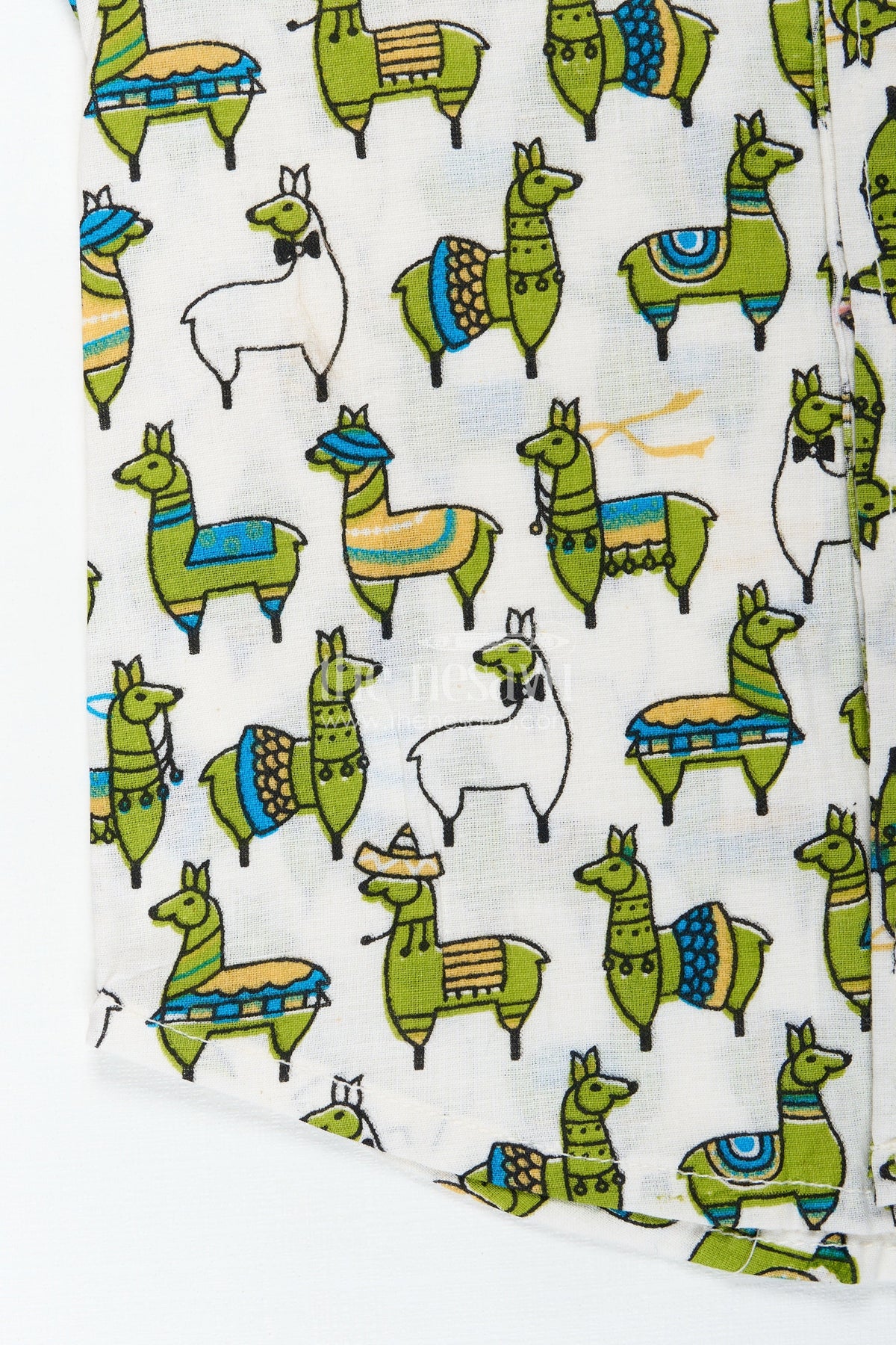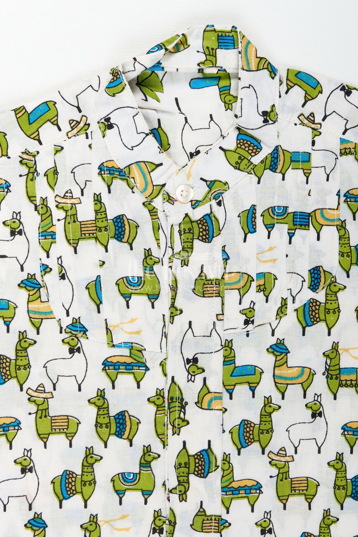 Boys leafy jungle theme shirt for summer is an energetic blend of nature and fun, perfect for warm days and outdoor adventures. This breathable cotton shirt showcases quirky green and white animal motifs inspired by leafy jungle settings, set against a neutral cream base. The lightweight material keeps kids cool, while the tailored details like the mandarin collar and front pleats bring polish to this playful piece. Whether it’s for a day at the zoo, a picnic, or simply running around, this shirt delivers on style and practicality. With its vivid digital prints and soft texture, it’s an ideal summer wardrobe essential for young explorers.