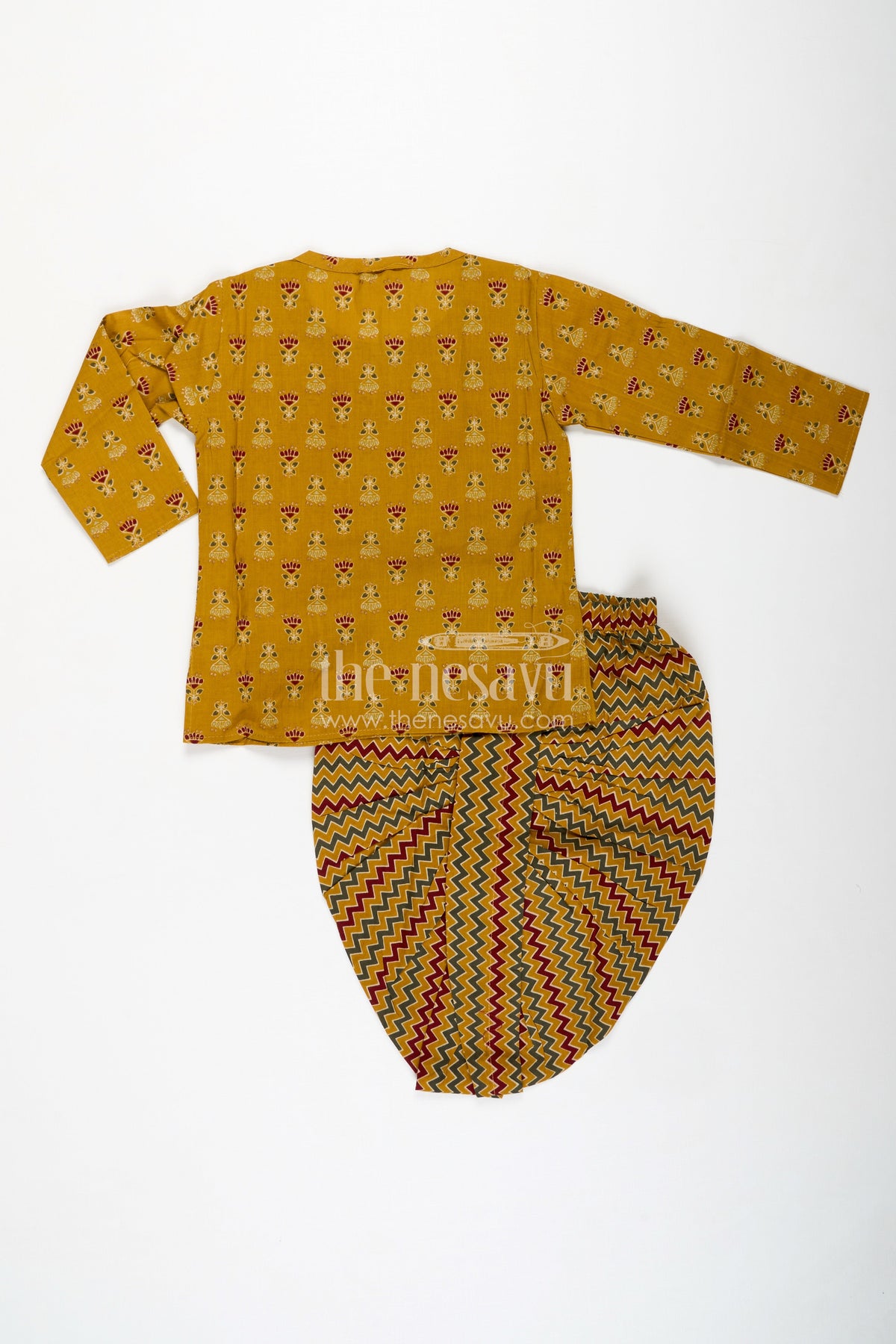 Boys Party Wear Dhoti Set for Weddings is designed to bring cultural elegance with a modern twist. This mustard yellow kurta features delicate floral block prints and an off-center button design that adds character. The highlight is the dhoti pants adorned with bold zigzag patterns in mustard, maroon, and green, giving the ensemble an energetic flair. Crafted from breathable cotton, the outfit ensures lasting comfort, even during long ceremonies. Perfect for traditional weddings and festive parties, this set gives young boys a smart, celebratory look while allowing ease of movement.