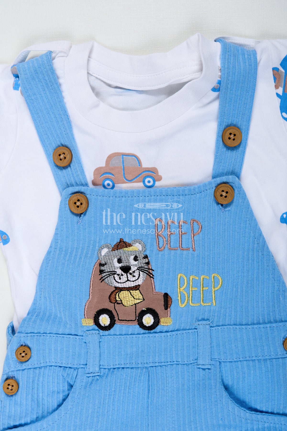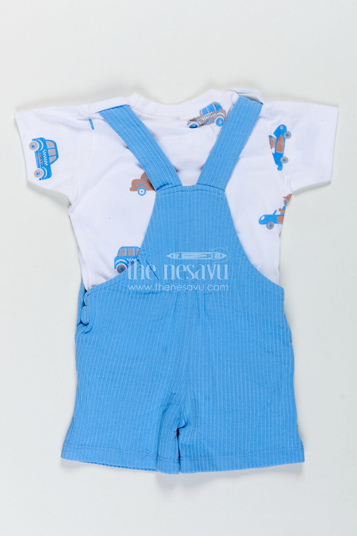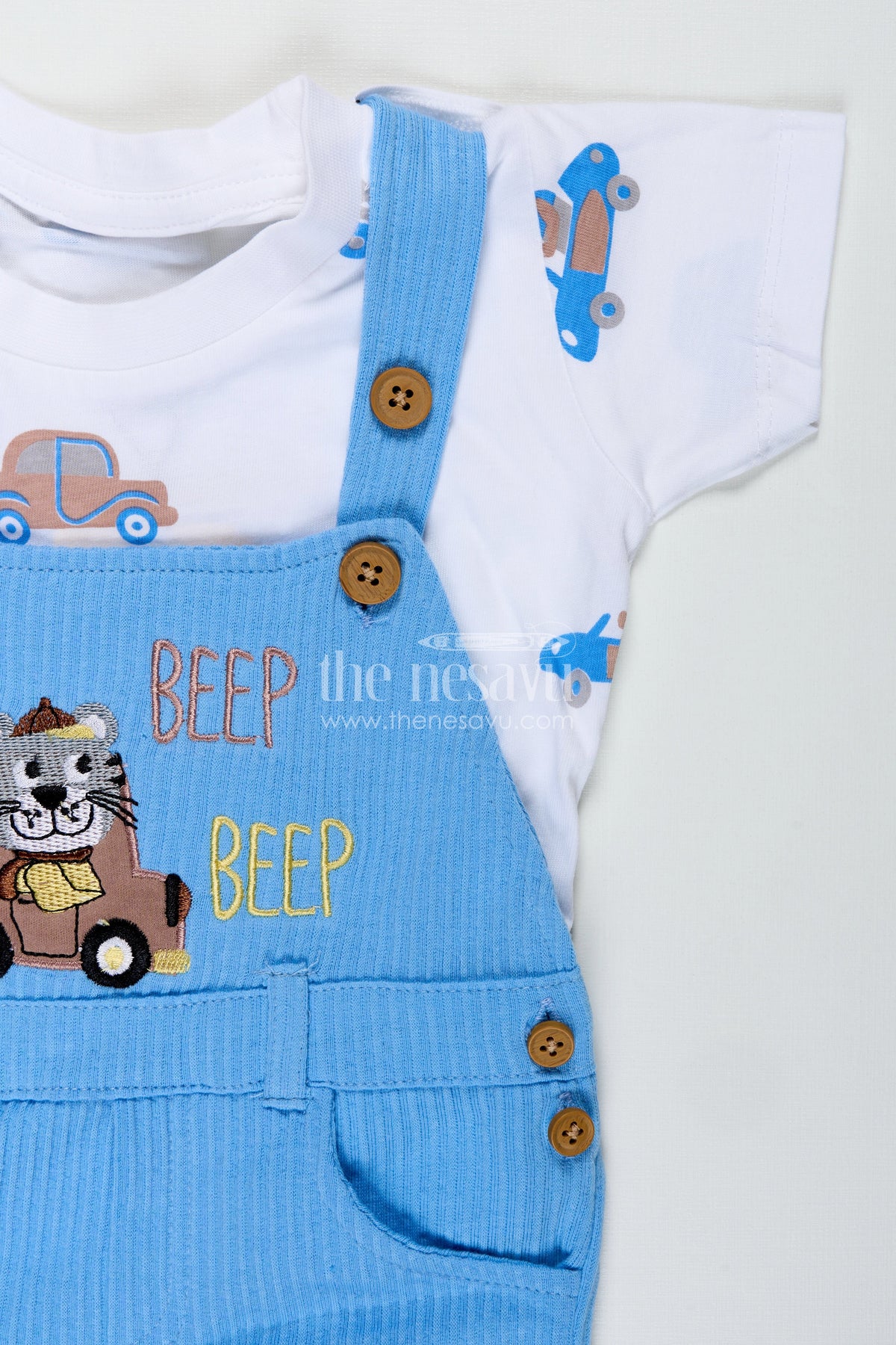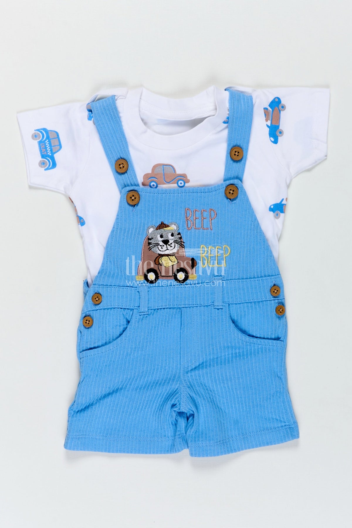 The race car design romper set is made for boys who love adventure and excitement. Featuring a soft cotton corduroy fabric, this two-piece outfit includes a short-sleeved cream tee paired with pastel blue overalls embellished with a detailed race car patch. The cotton corduroy with car batch embellished adds a tactile and playful feel, while the color scheme keeps the look fresh and modern. With its adjustable shoulder straps and comfortable fit, this romper is perfect for crawling, walking, or simply relaxing in style. Ideal for playful days at home or outings filled with fun and movement.