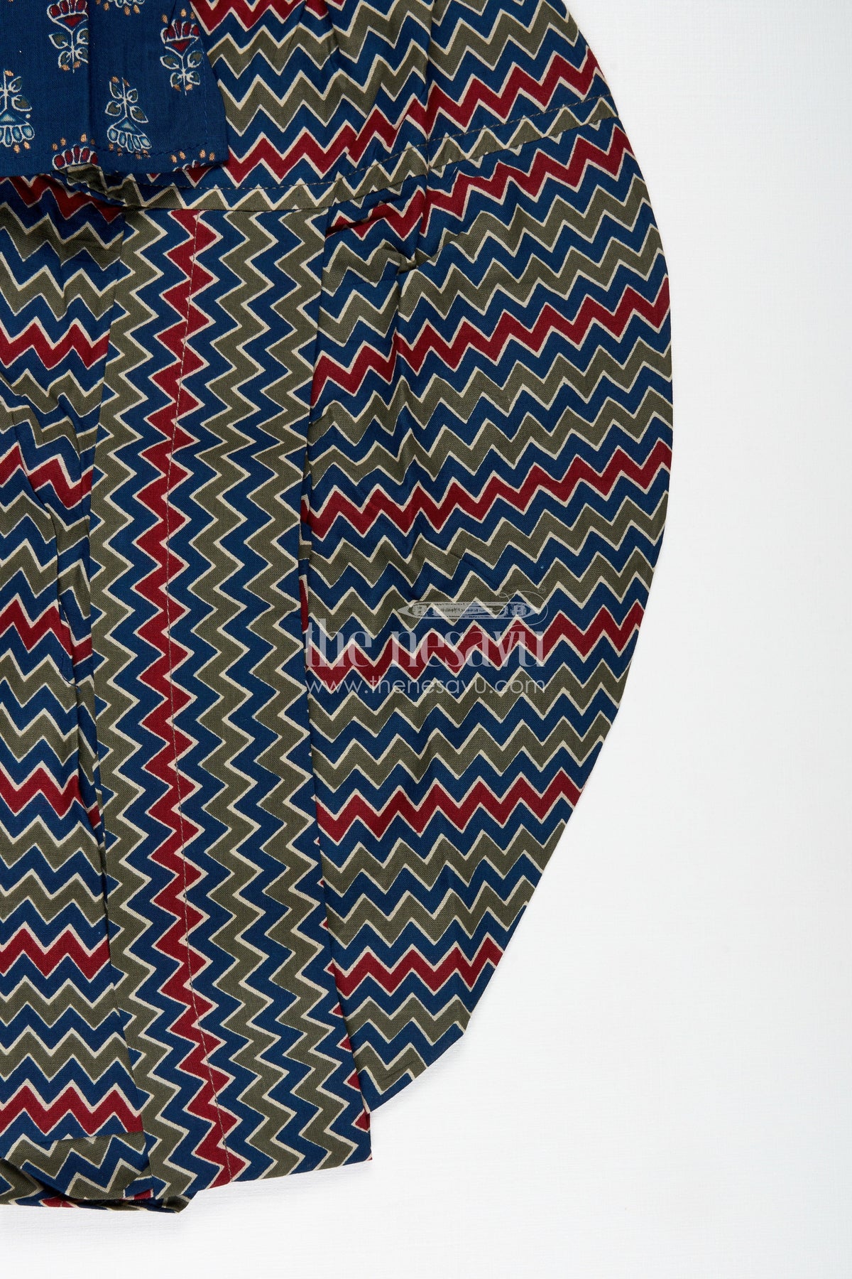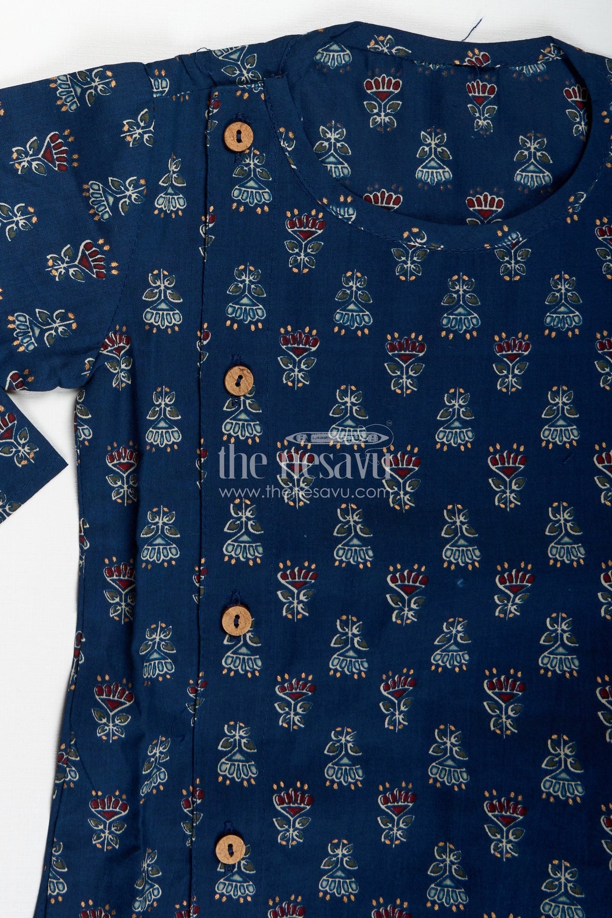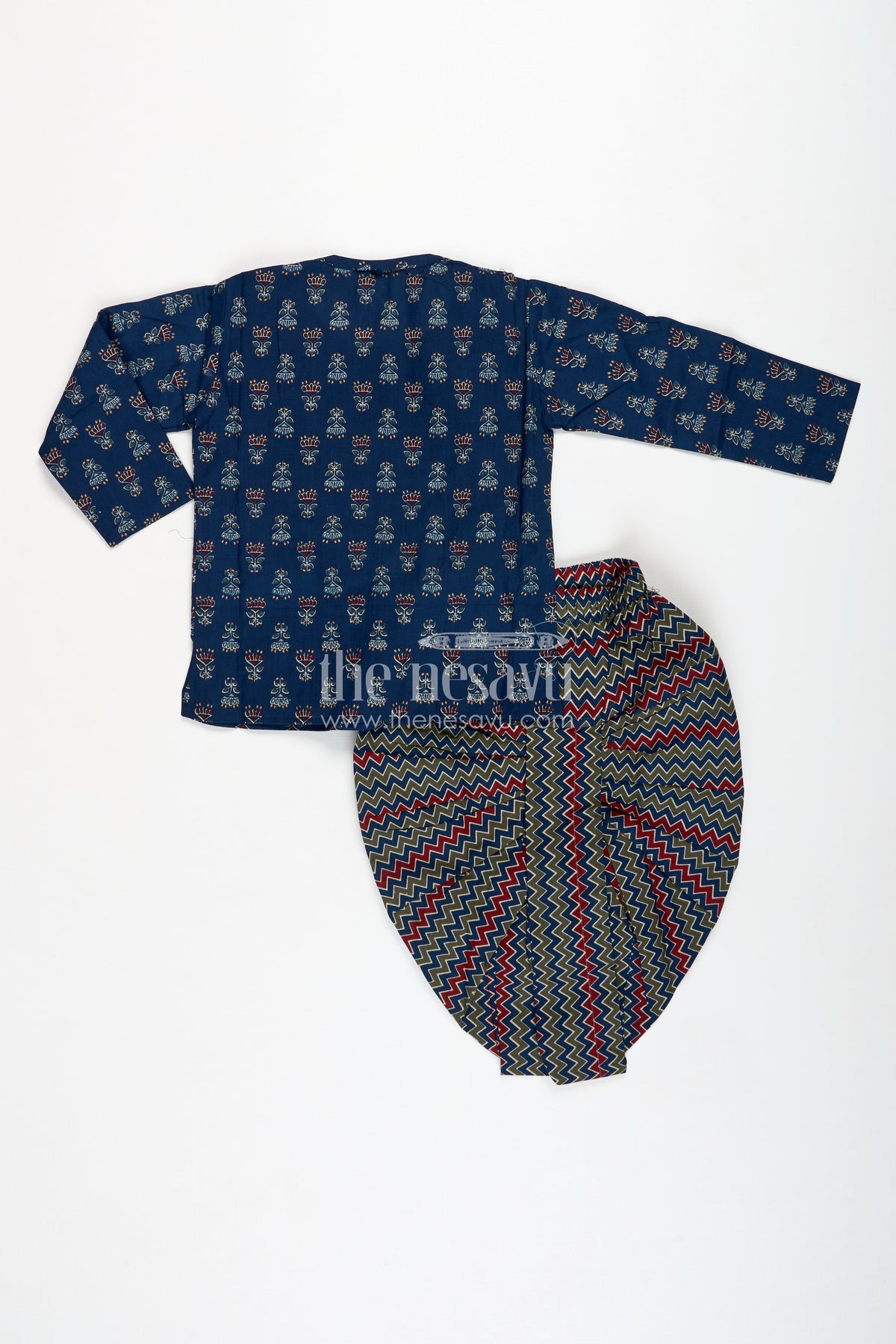 Boys Traditional Kurta Set with Dhoti for Festivals captures authentic ethnic charm in soft, breathable cotton. The deep indigo blue kurta is detailed with miniature block-printed motifs in symmetrical patterns that reflect India’s rich textile traditions. Matched with a comfortable cotton dhoti featuring multicolor border prints, this ensemble is an excellent choice for festivals and family functions. Its relaxed fit keeps kids active and carefree, while the design speaks to timeless elegance. Ideal for festive photos, school events, or family gatherings.
