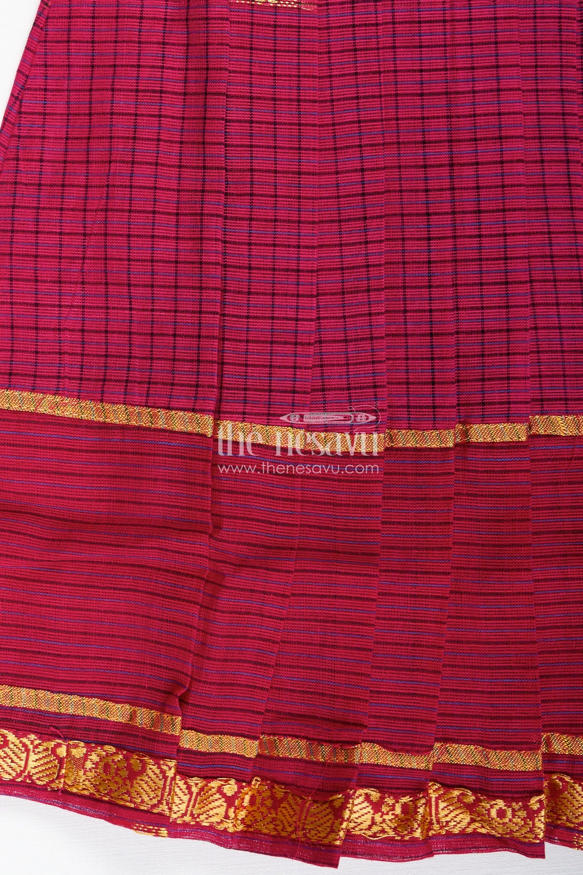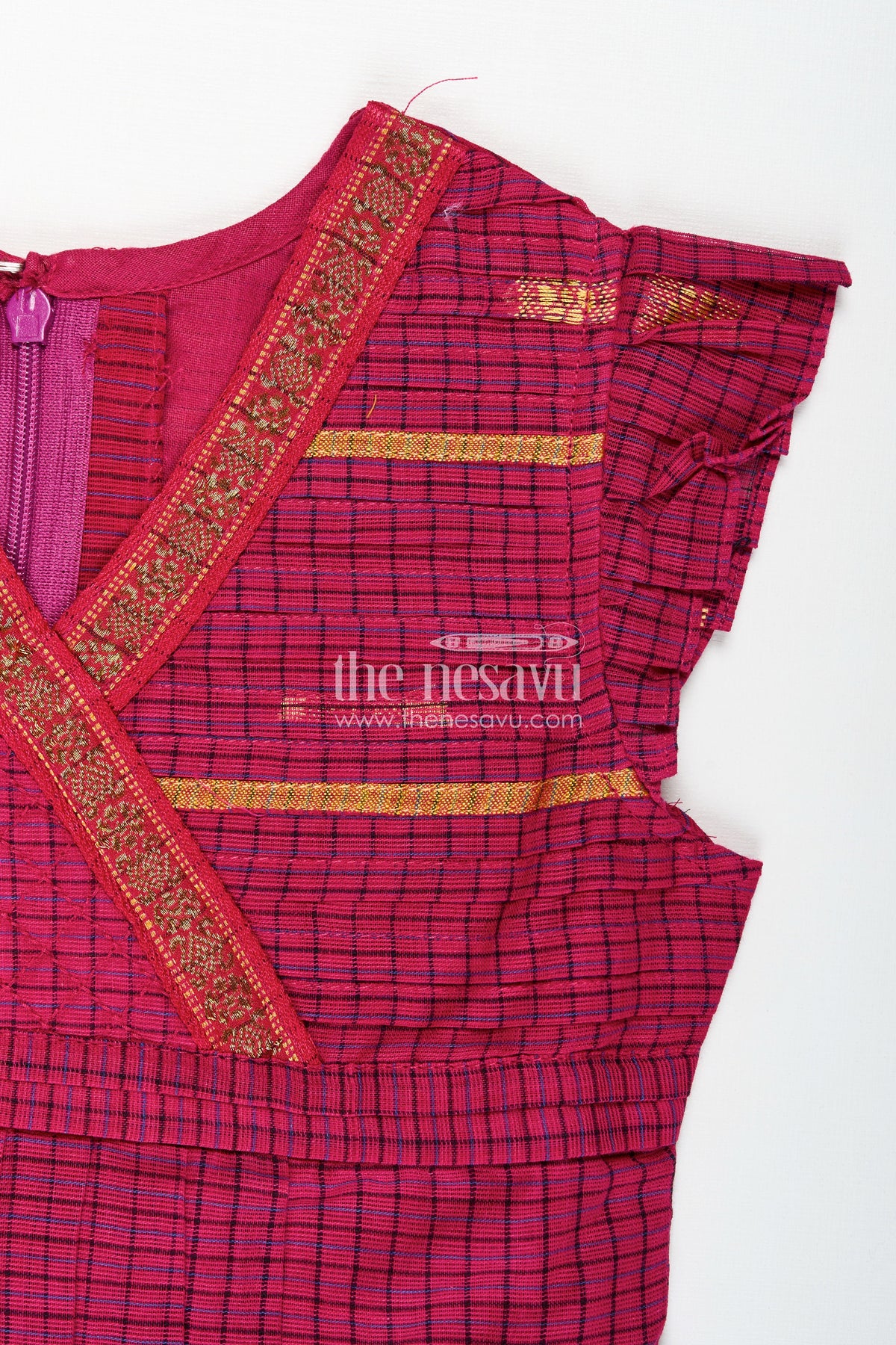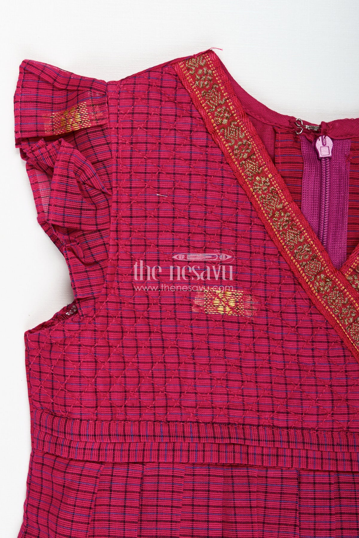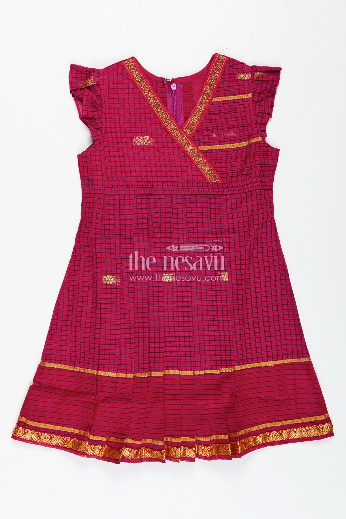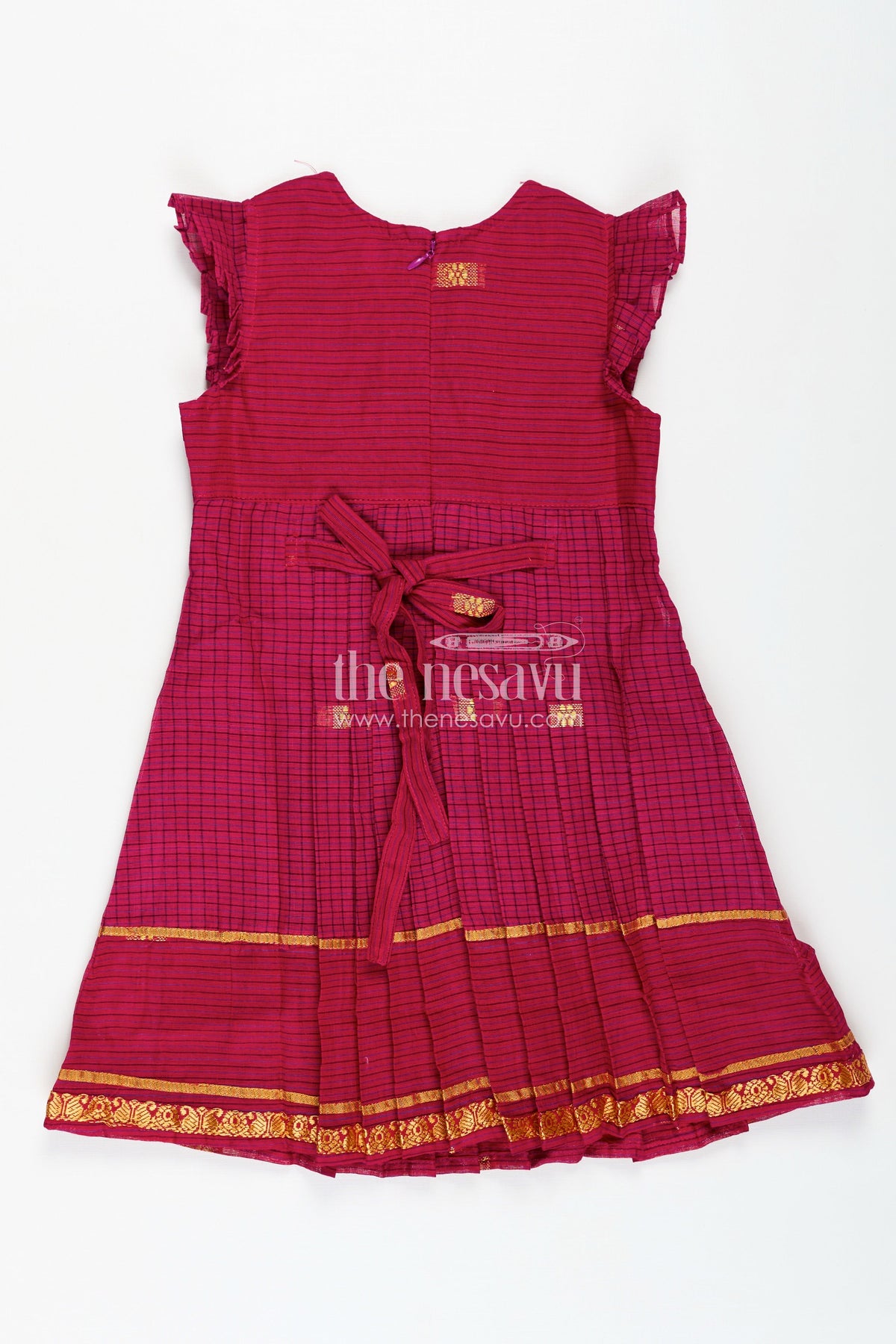 Chettinadu Silk Frock for Girls blends traditional elegance with modern comfort in this rich magenta frock made from breathable Mangalagiri cotton. Designed with classic Chettinadu checkered textures, golden zari borders, and pleated hems, it offers a festive look with timeless appeal. The angled neckline is accentuated with brocade taping, and the flutter sleeves add a playful touch. This frock is ideal for girls who love the grace of silk styles but need the ease of cotton. Lightweight, non-irritating, and stunning in its vibrant hue.