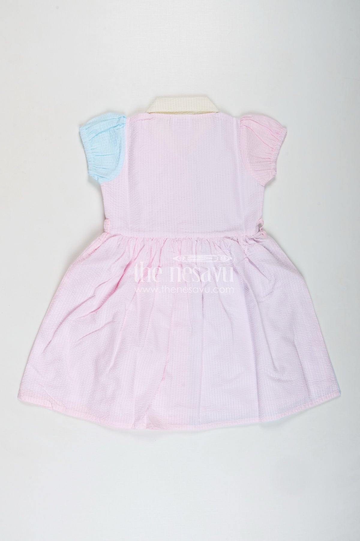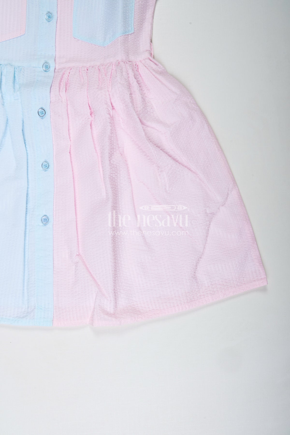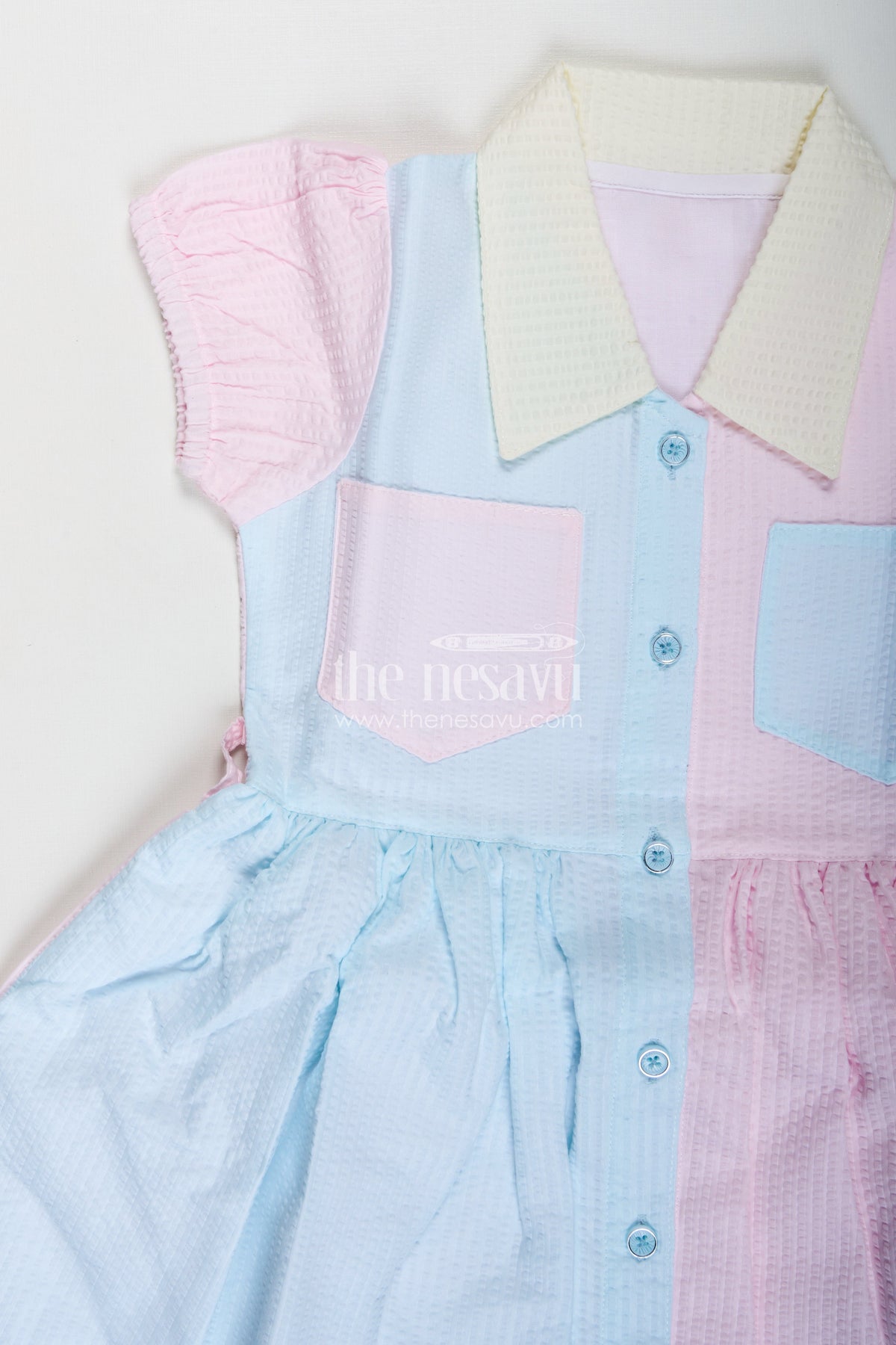 Cotton Frock Dress for Girls for Warm Days is the perfect choice for keeping your little one cool and comfortable during sunny days. Crafted from soft and airy seersucker cotton, this dress combines breathable fabric with playful style. The pastel color-block design in pink, mint green, and yellow adds a refreshing, cheerful vibe, while the short puff sleeves and full-front button placket make dressing easy and hassle-free. Two front patch pockets bring a charming utility detail, and the included matching waist tie adds a sweet finishing touch. Ideal for everyday wear, this dress allows for plenty of movement and all-day comfort. With its gentle texture and cute silhouette, it’s a warm-weather essential your child will love to wear again and again.