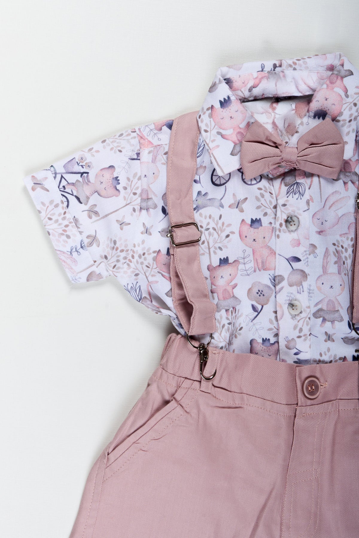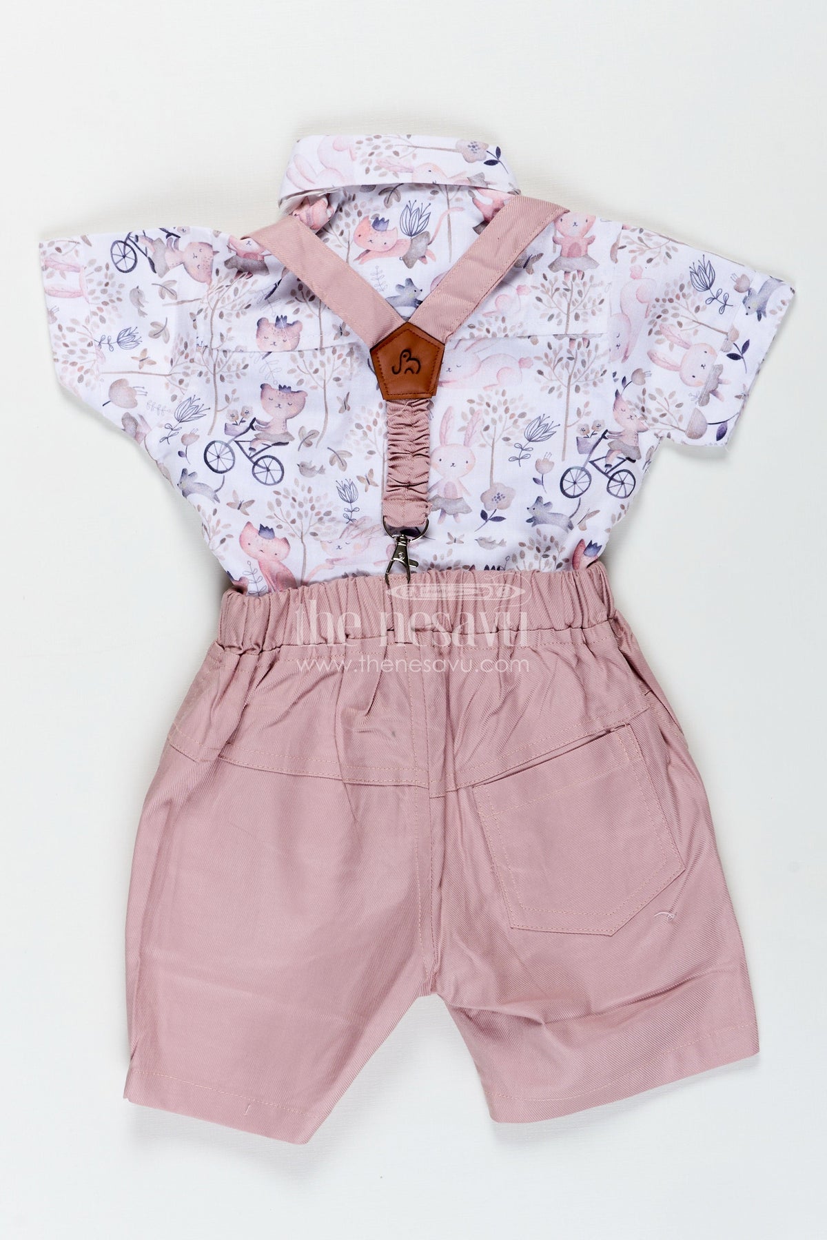 The Nesavu Boys Casual Set Cotton Shirt and Shorts Sets for Boys with Whimsical Forest Animal Print and Pink Suspenders Nesavu Nesavu Cotton Shirt Shorts Sets Boys Pastel Animal Print Dusty Pink Suspenders