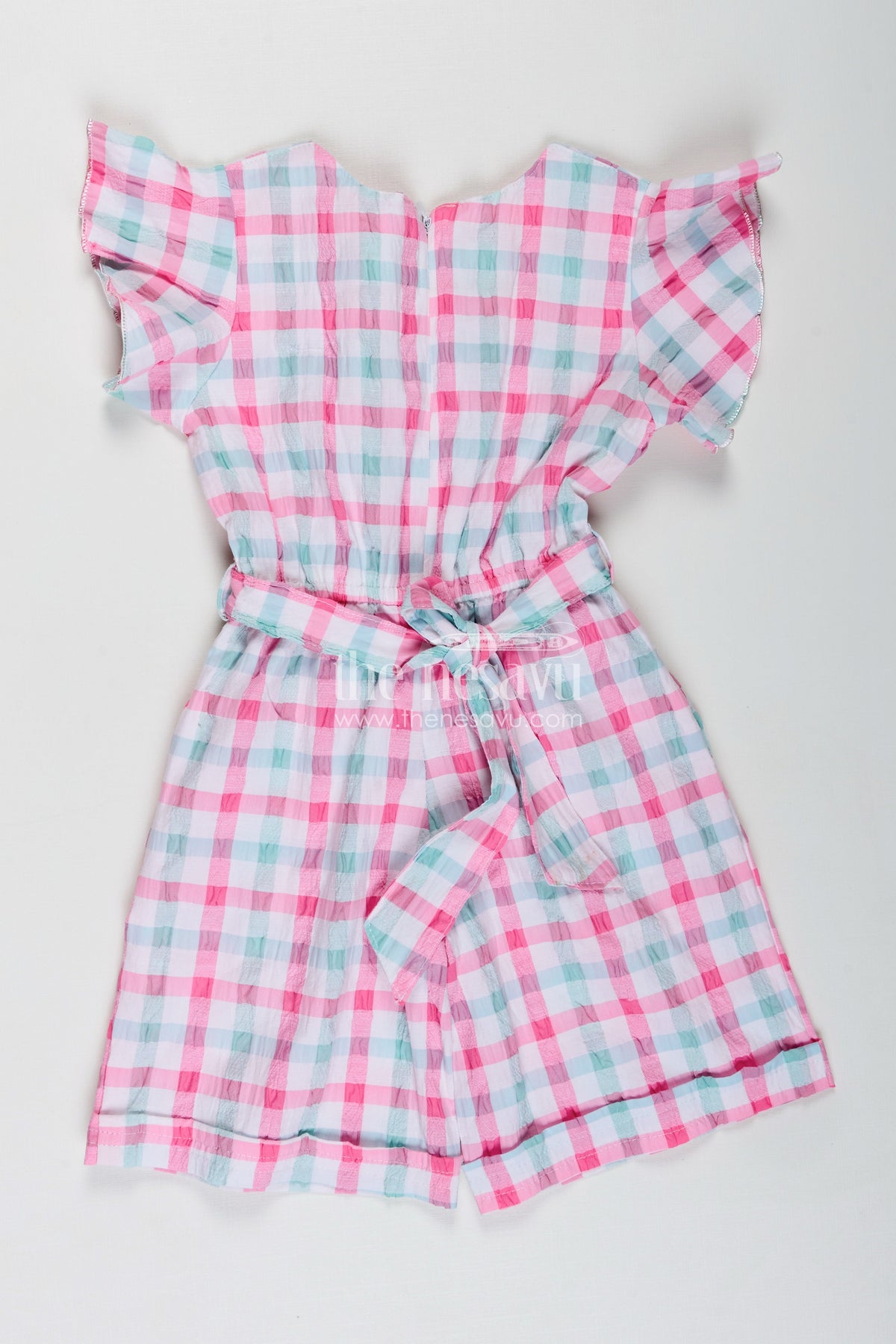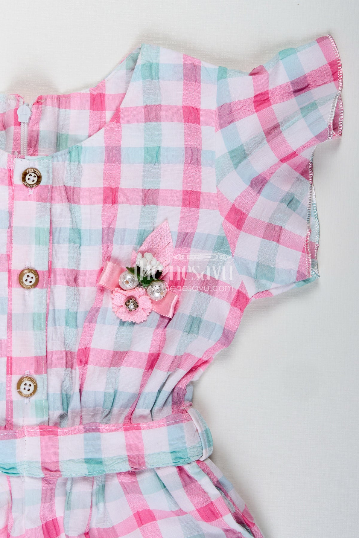 Girls Ethnic Sets with Dupatta blend casual comfort with a cultural twist, making them perfect for everyday ethnic flair. Crafted from lightweight seersucker cotton, this green checked set includes a matching dupatta, flutter-sleeved top, and high-waisted pants - all adorned with a floral applique detail. The breathable cotton fabric keeps your child comfortable throughout the day, while the addition of a dupatta brings a subtle ethnic touch to the western-style playsuit silhouette. Whether for a school celebration or an easy ethnic day out, this outfit is stylish, comfortable, and versatile. The buttoned front and tie waist make for a secure and easy fit, ensuring your little girl feels both pretty and confident.