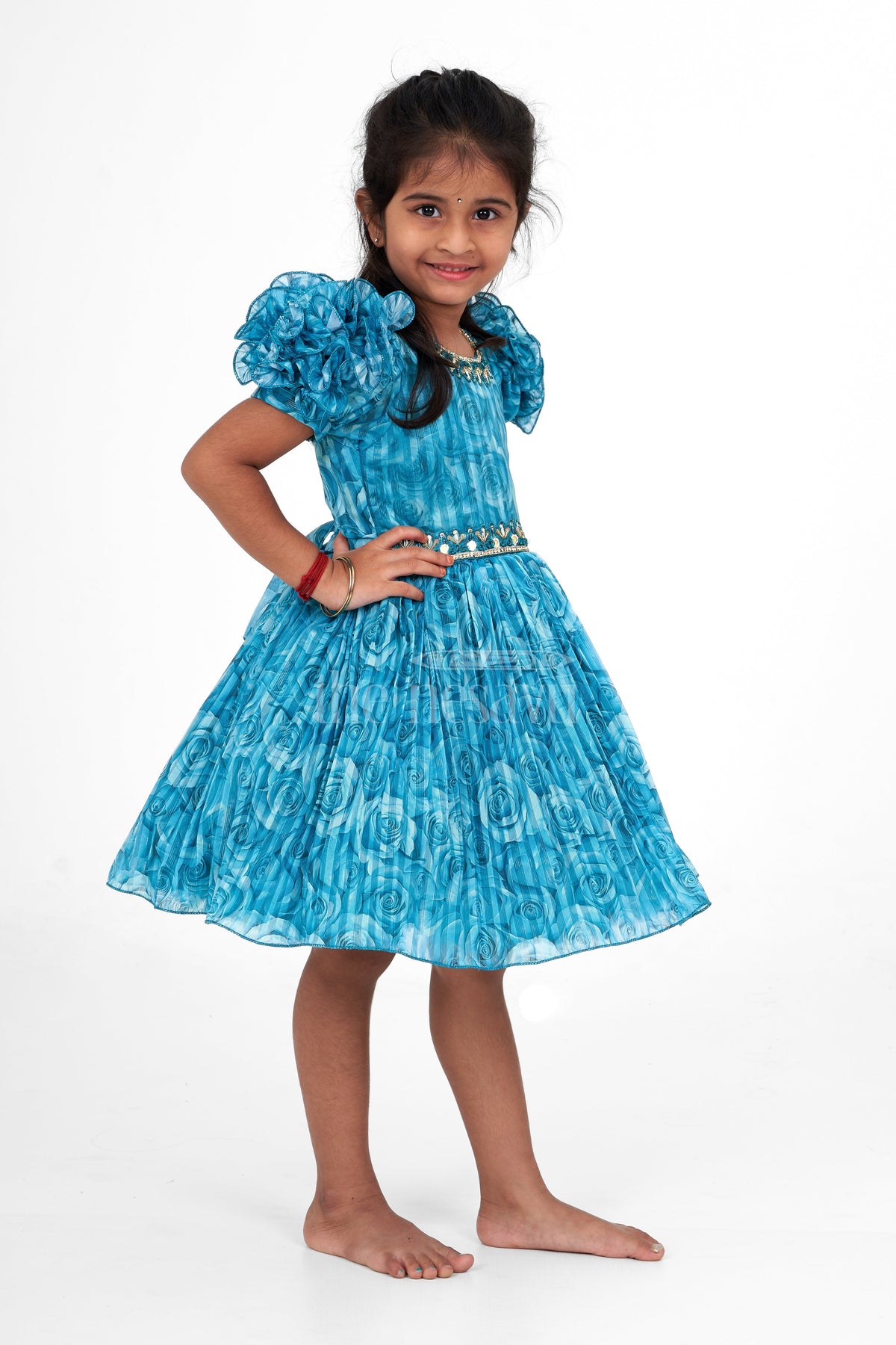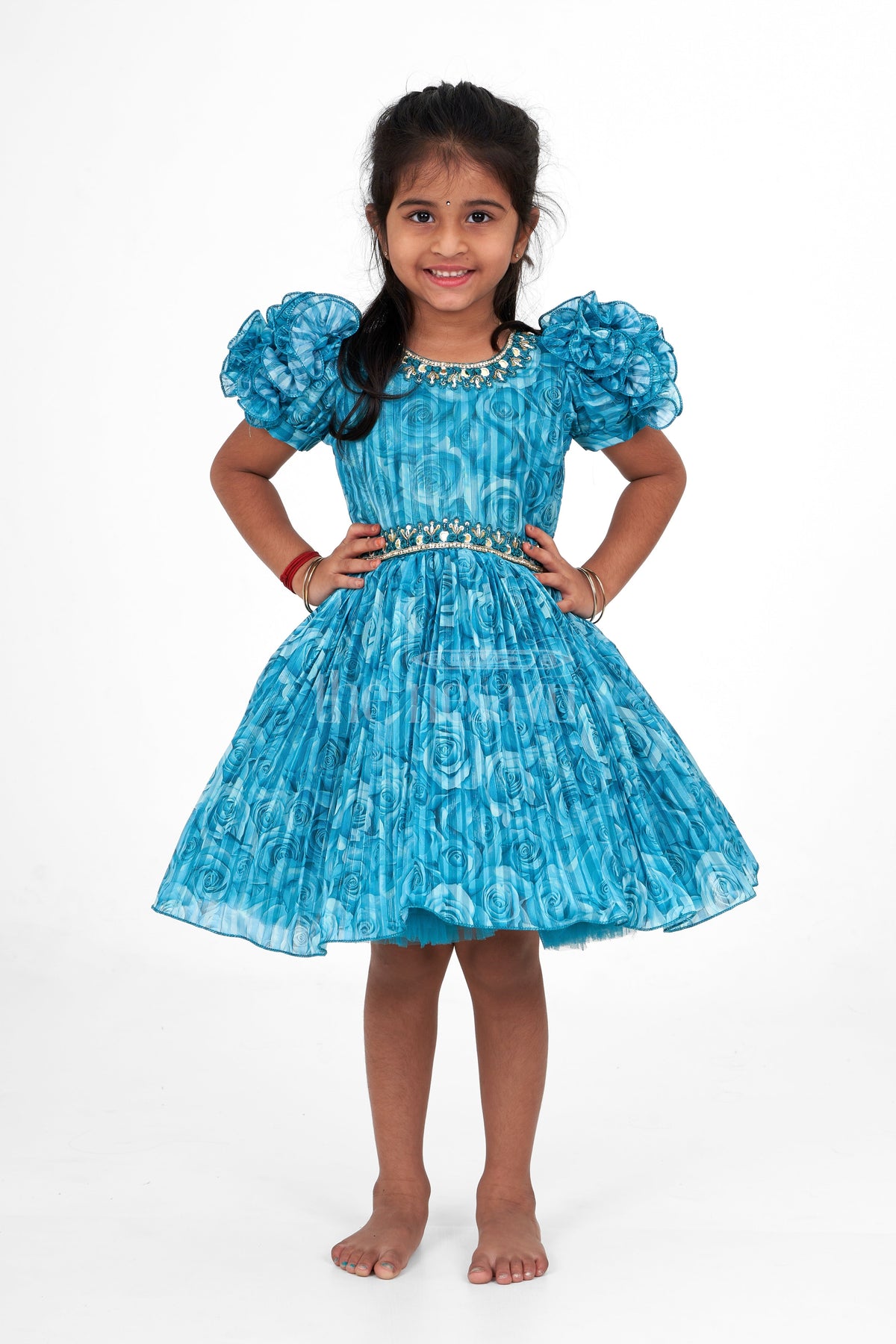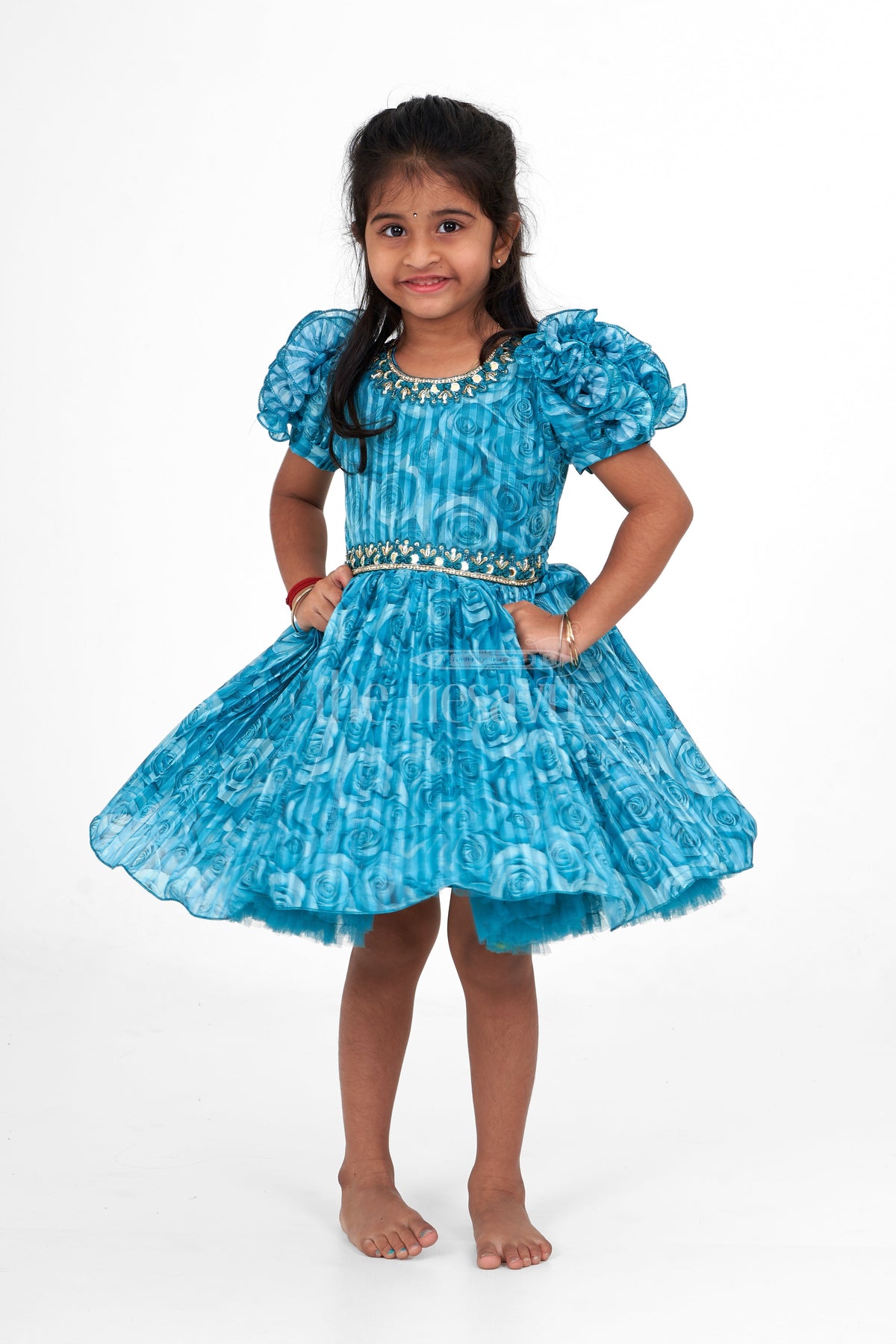 This Girls Fancy Frock in a striking teal blue color with a rose-patterned fabric that adds a charming and textured look. The frock features dramatic puff sleeves, adding a playful yet elegant touch, perfect for special occasions. The neckline and waistline are embellished with intricate golden accents, giving it a regal finish. The pleated skirt adds volume and movement, making it a twirl-worthy choice for young girls. Ideal for parties, weddings, or festive events, this frock can be paired with simple accessories to let the dress stand out.