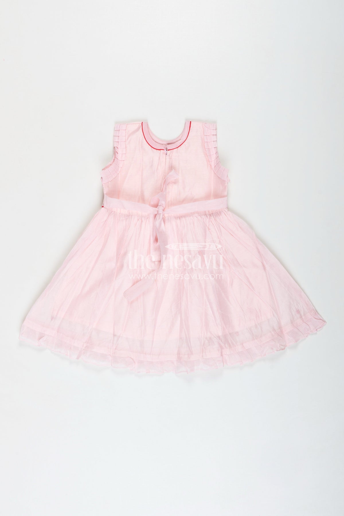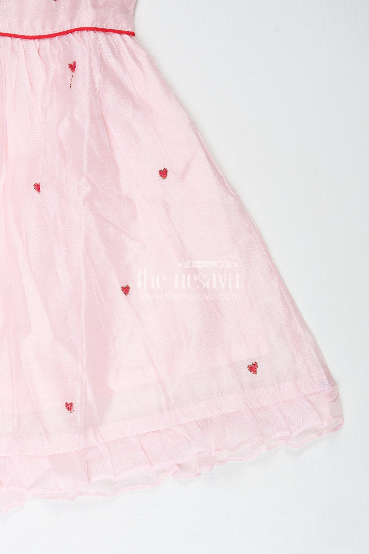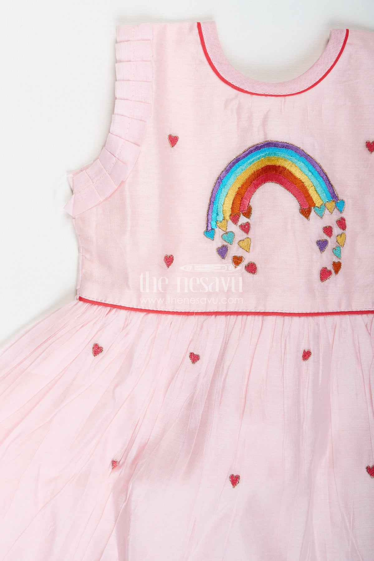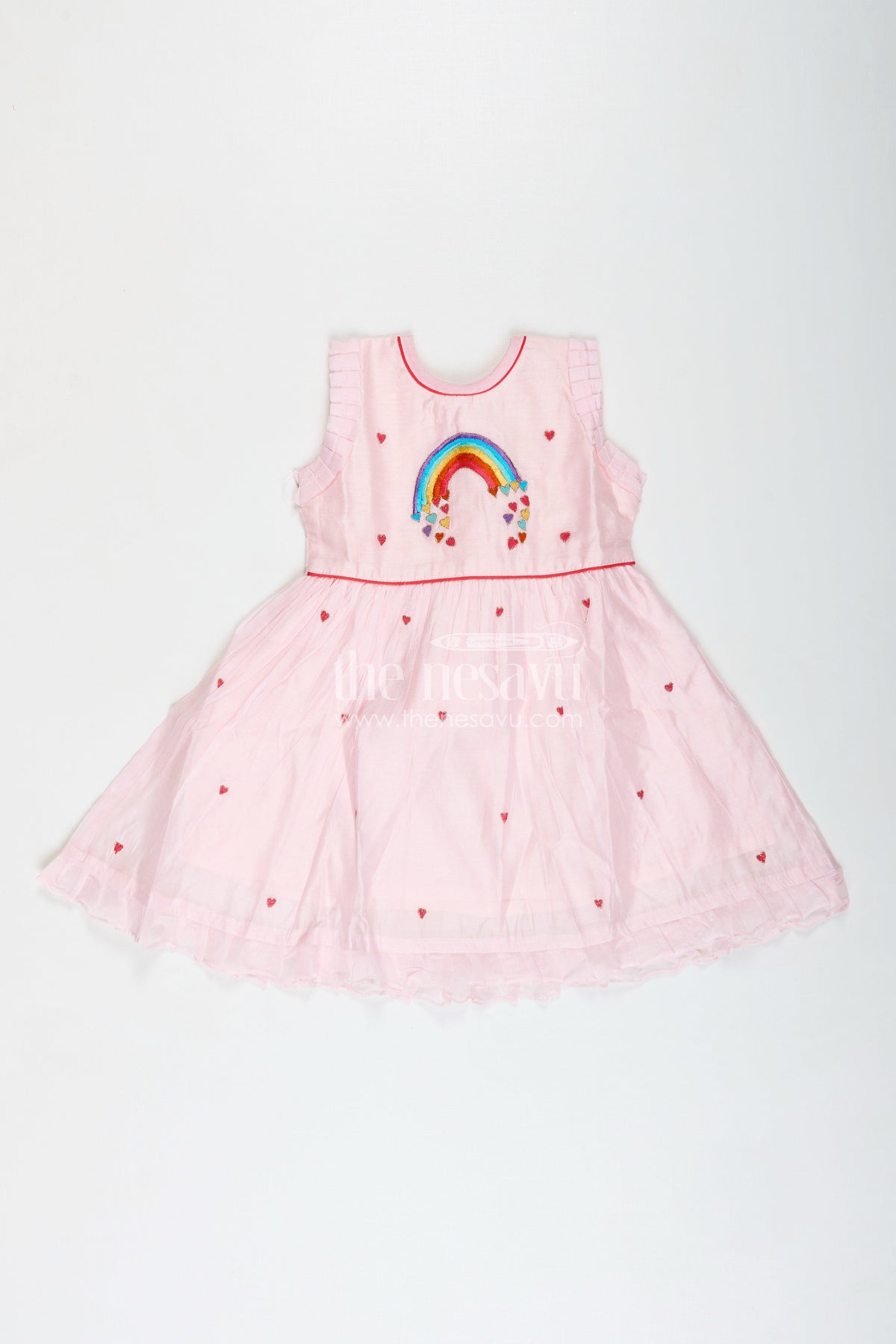 Girls Light Chanderi Party Frock is a breezy and joyful choice for your little one’s everyday celebrations. Made from lightweight Chanderi cotton, this soft pink frock features a rainbow embroidery on the chest, complemented by tiny red heart motifs scattered across the fabric. The flared silhouette, complete with gentle pleats and a frilled hemline, gives the frock a twirl-friendly flow while ensuring all-day comfort. Ideal for casual outings, birthday parties, or even festive moments, this frock brings together playful design and breathable texture. The sleeveless cut and soft inner lining keep it cool and irritation-free, while the zip closure at the back ensures quick dressing. With its delightful color palette and cheerful embroidery, this piece is sure to brighten up any day.