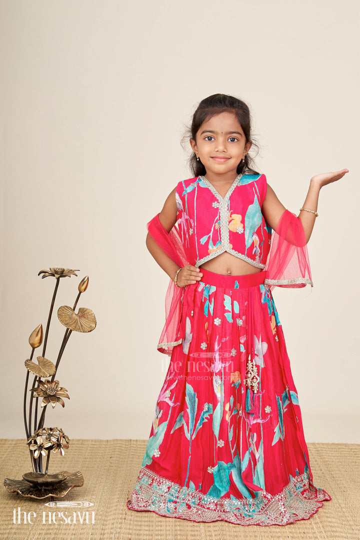 - This girls lehenga choli set is crafted from pure muslin silk with a vibrant floral digital print